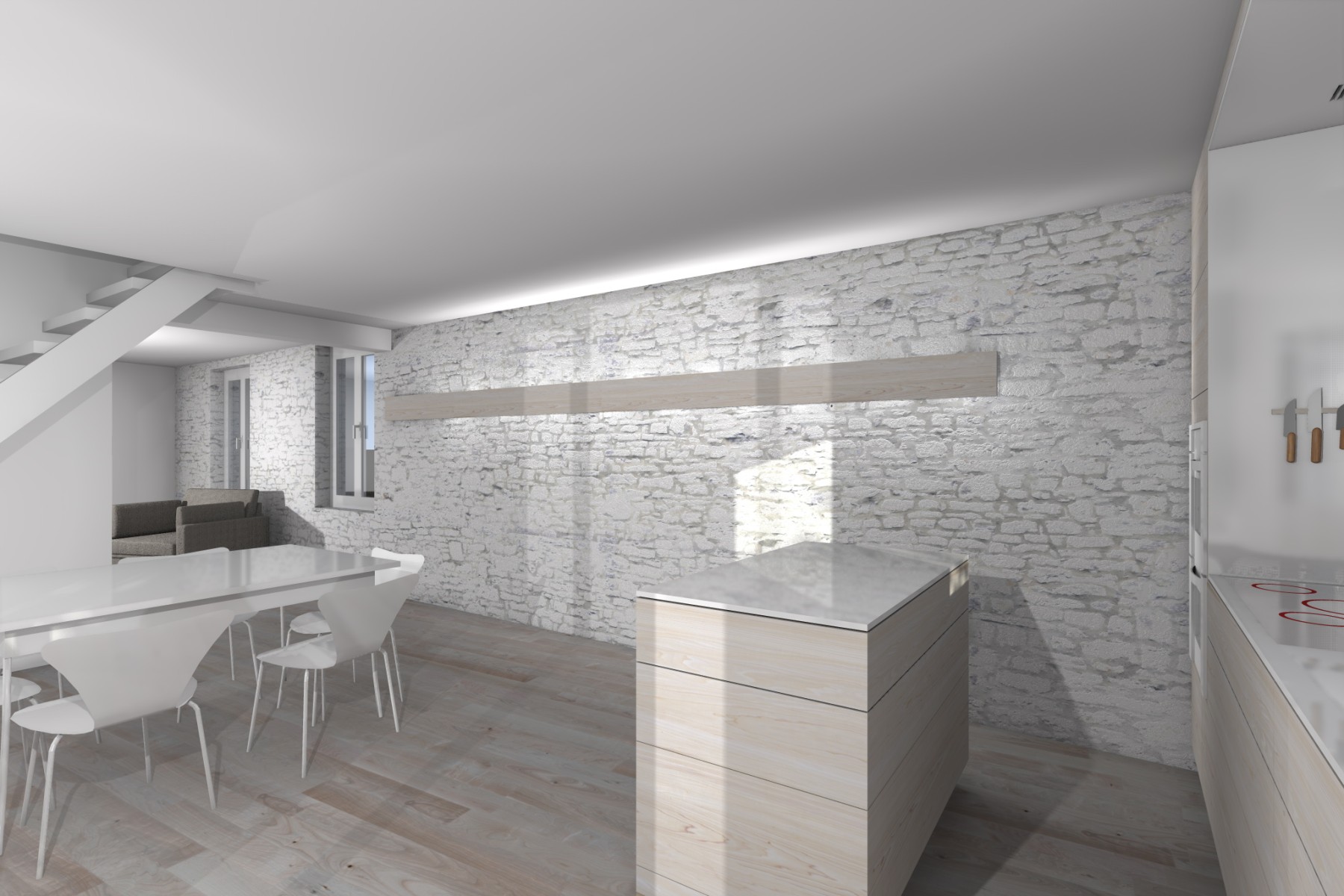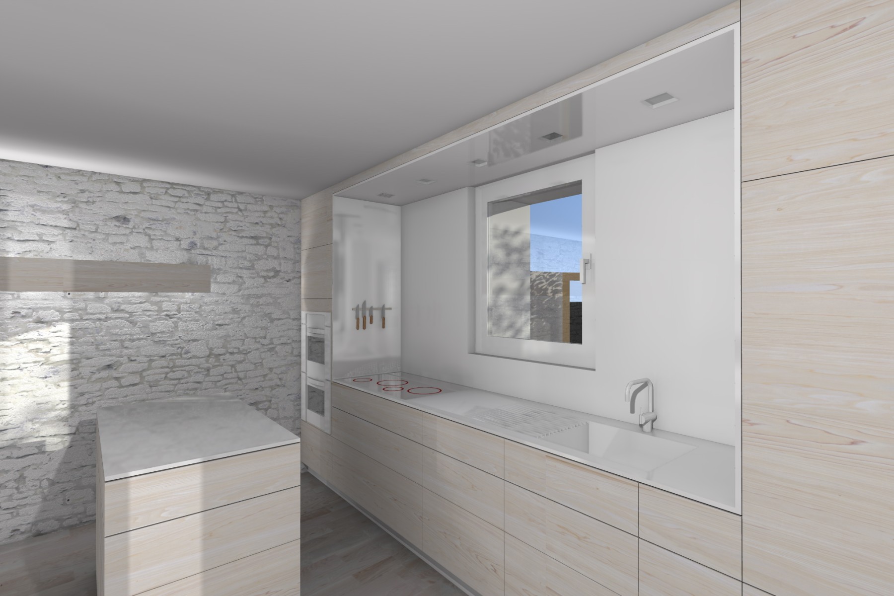 Une cuisine, contemporaine et simple dans ses usages, doit pour s'intégrer à une bâtisse en brique et en moëlons apparents de la fin du XIXe siècle, respecter une certaine sobriété, dans sa forme et dans ses matières. Sa façade en chêne blanchi brossé, son tableau en corian, l'installent dans l'épaisseur du mur.