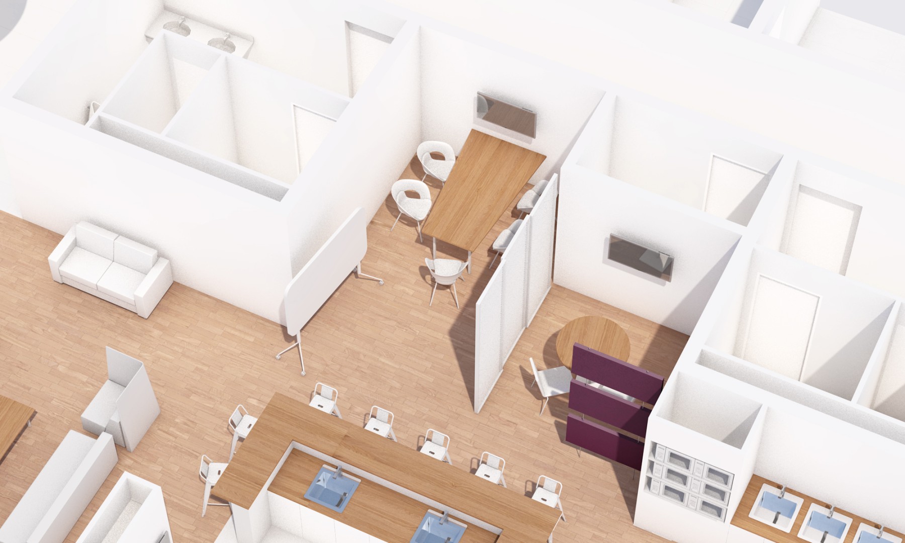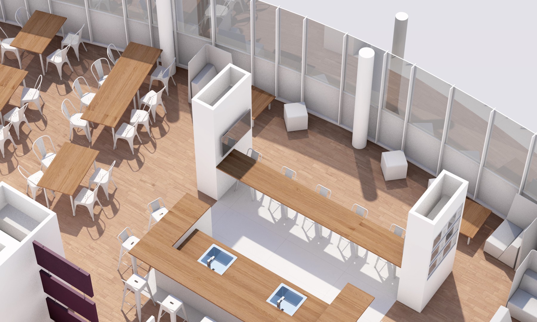 Pg Modélisation d’aménagements intérieurs pour des plateaux de bureaux en Flex Office, avec des espaces de détente. .