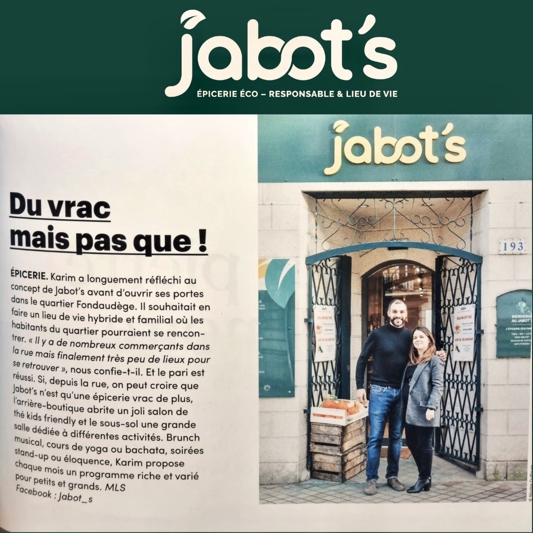 Cette épicerie s'évertue à propose des produits défendant un profond respect de l'environnement. Chez Jabot’s, la sélection de produits se distingue par son caractère éco-responsable, mettant en avant majoritairement des articles français et locaux. L'établissement propose un assortiment varié, comprenant des produits en vrac, des articles d'entretien et d'hygiène. Sont mis en avant des produits de la Nouvelle-Aquitaine. Jabot’s ne se limite pas à être une simple épicerie, puisque ce lieu offre également la possibilité de déguster des mets sur place, dans un espace aménagé façon salon de thé. L'ensemble des pâtisseries et des plats sont confectionnés maison à partir des produits de l'épicerie. À noter également que l'établissement est résolument accueillant pour les enfants, doté d'un toboggan, d'une maisonnette en bois et d'une petite cuisine spécialement aménagée pour divertir les plus jeunes.