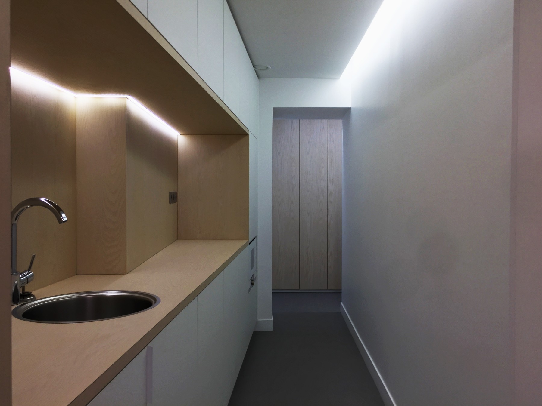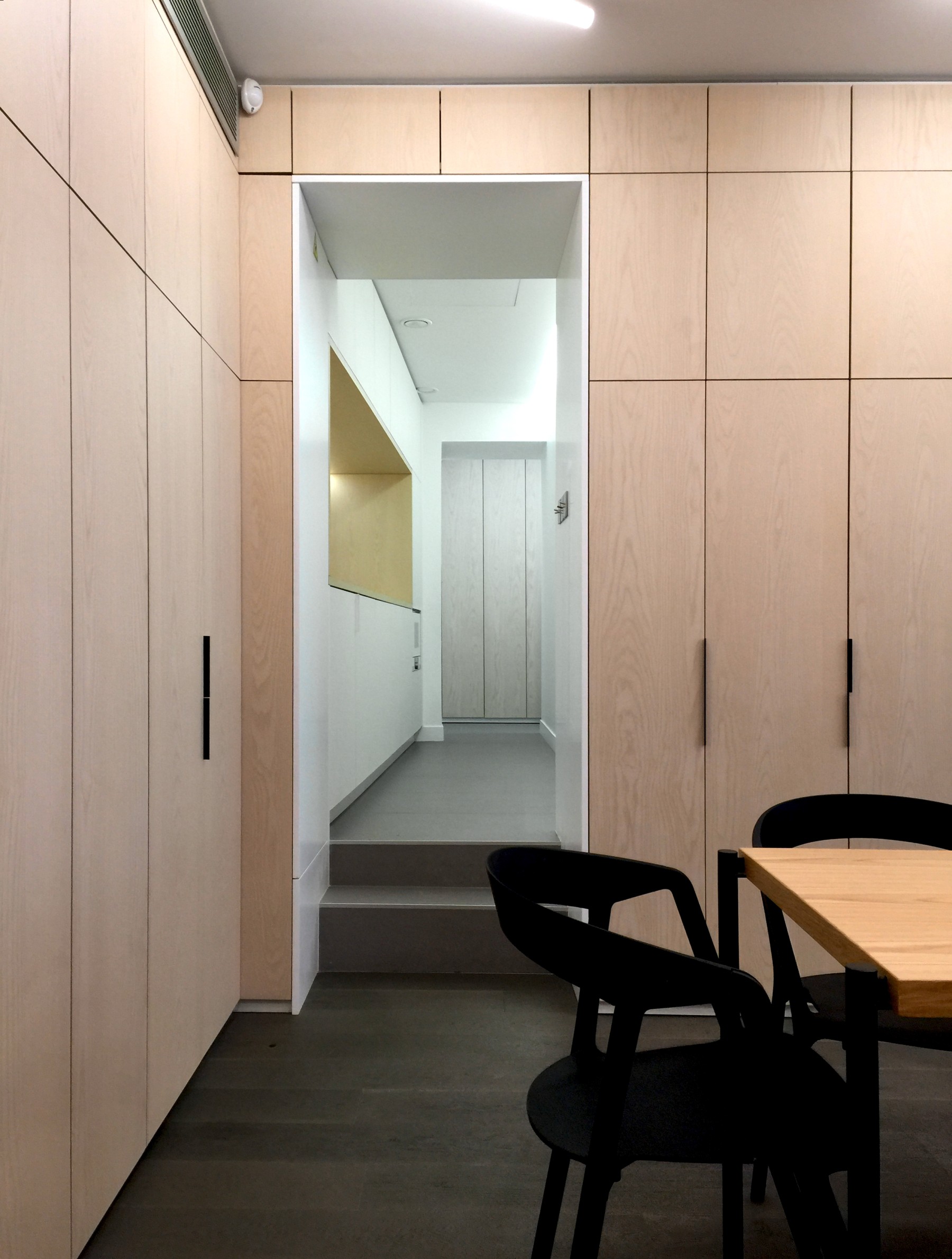 Le mobilier intégré est conçu en bois clair afin de créer un espace lumineux, et le mobilier est minimaliste.