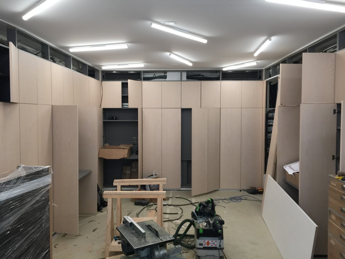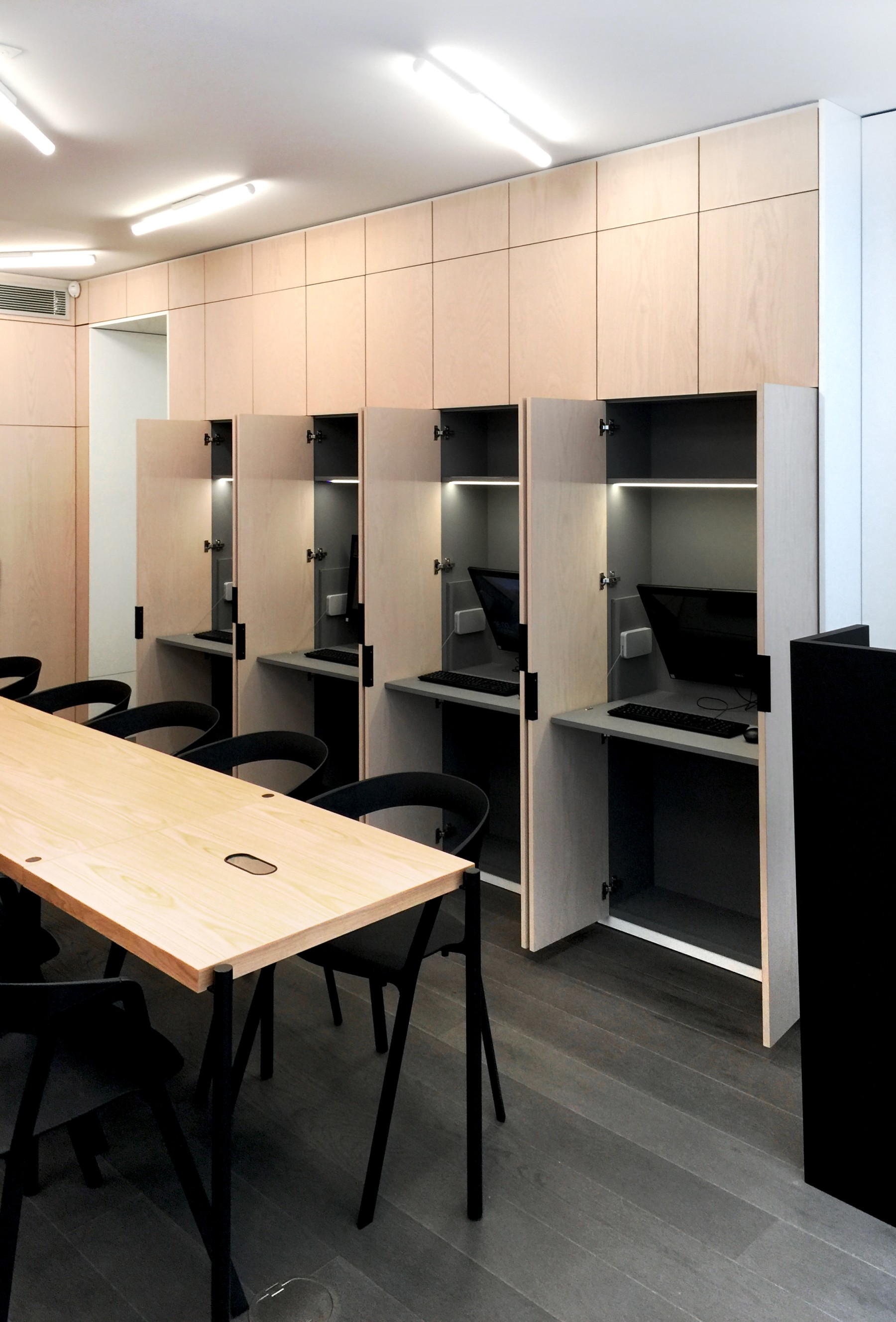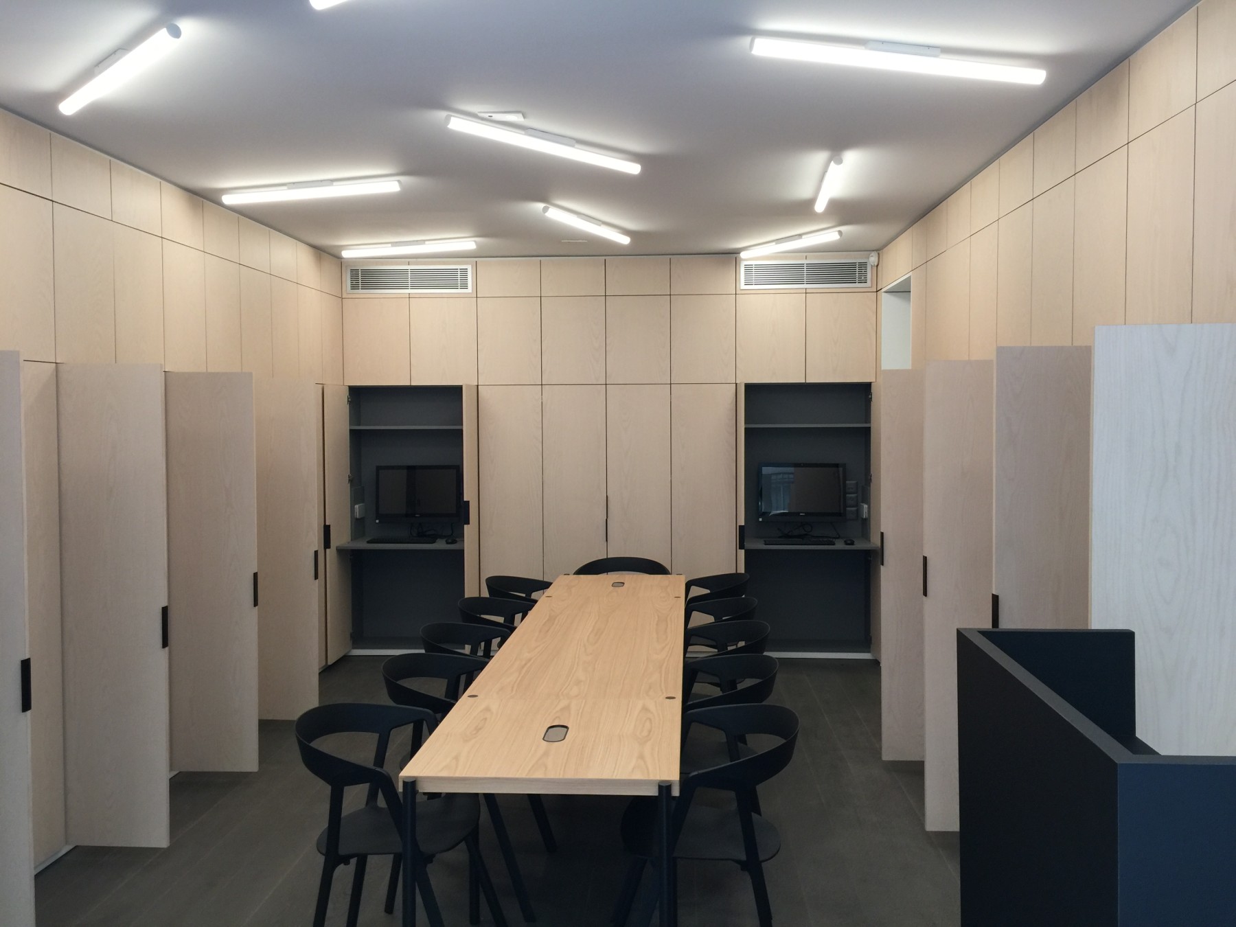 L’espace principal est organisé autour d’une grande table de réunion repliable. Les postes informatiques destinés aux expériences sont situés tout autour de la pièce, dans des meubles intégrés refermables. Le dispositif permet de transformer la salle de réunion en salle d’expérience.