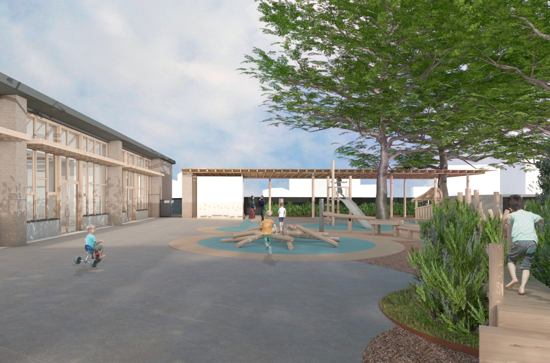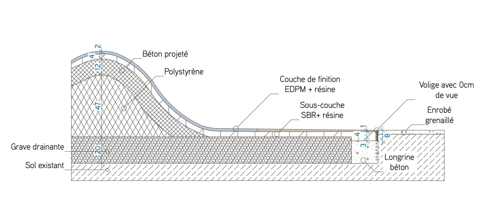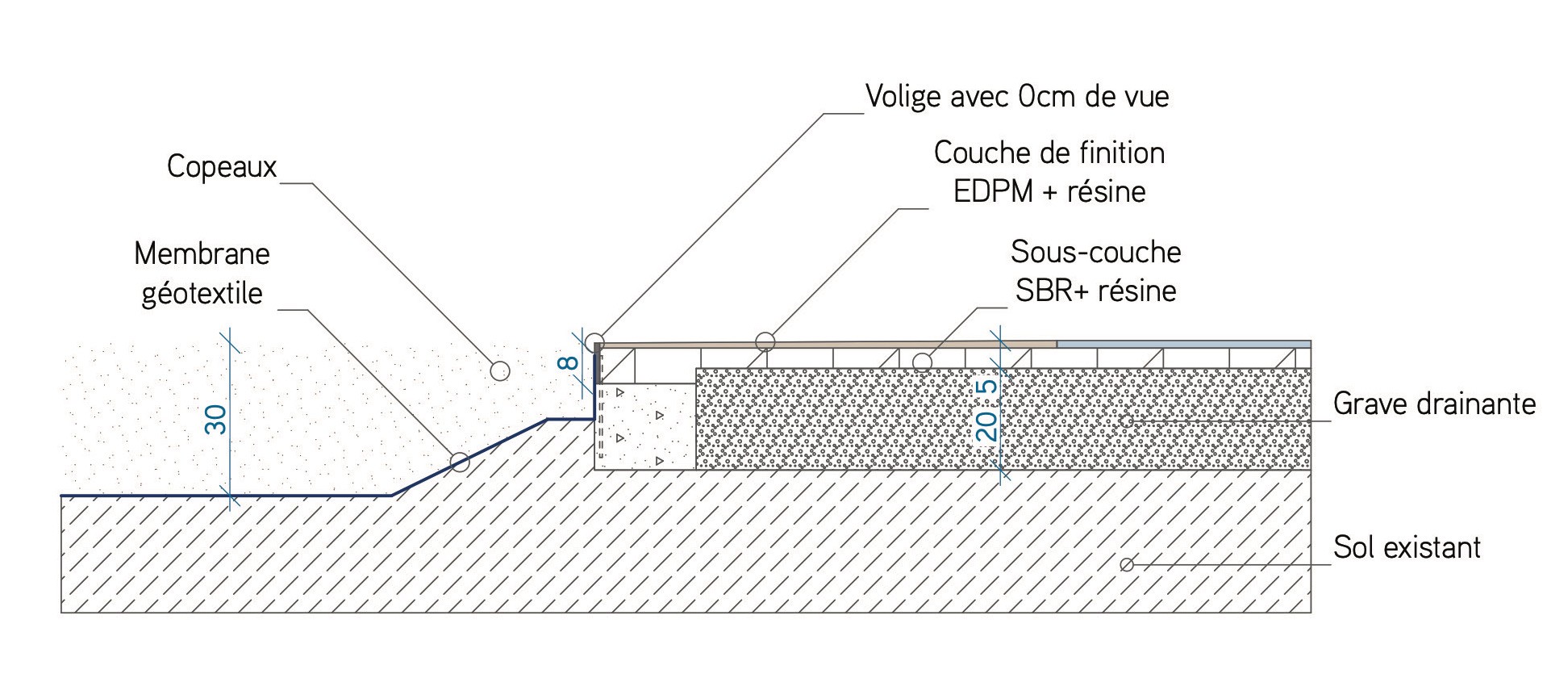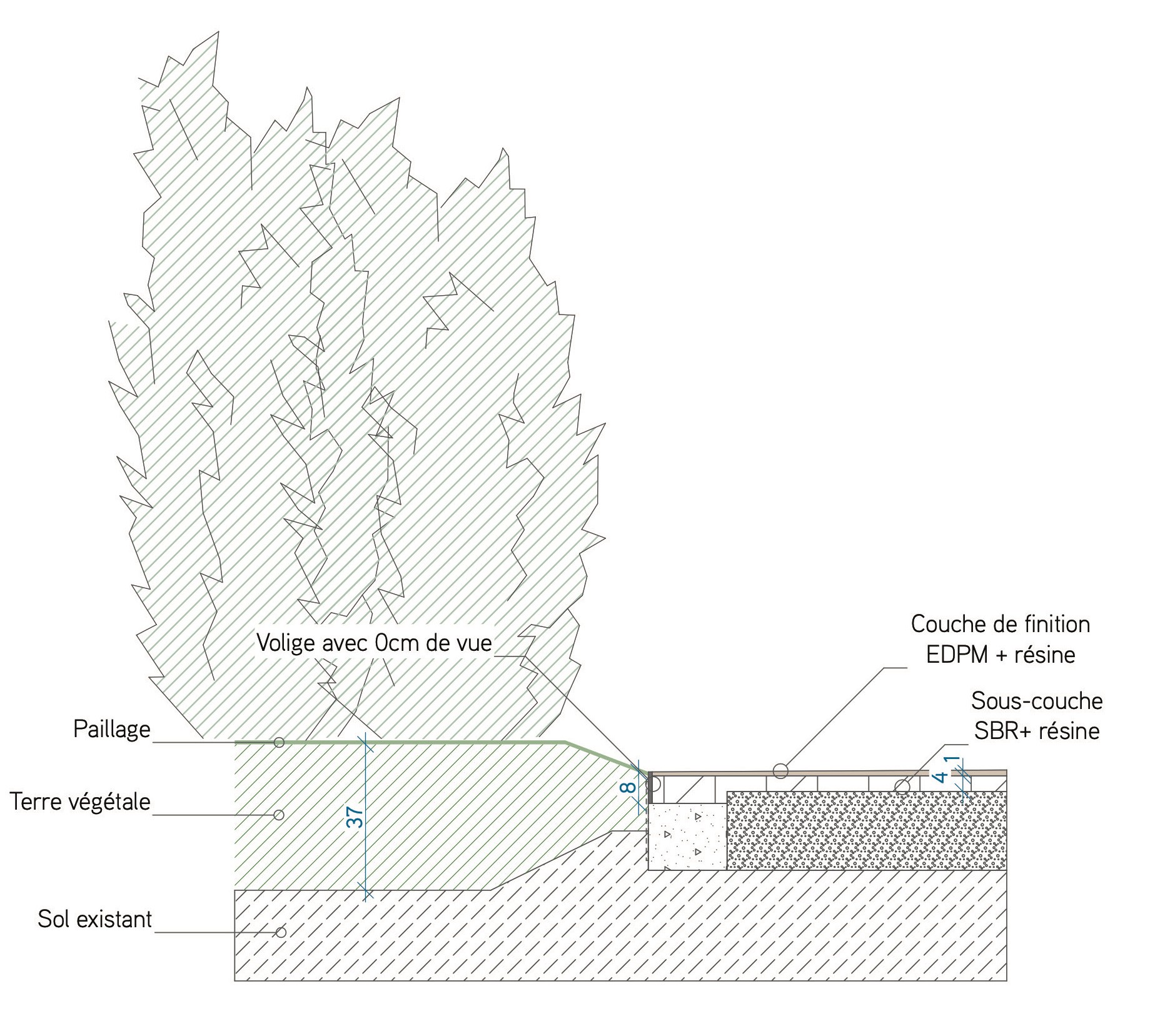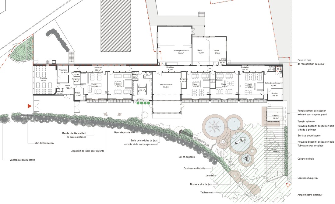 A l’image de plus en plus de cour d’école, cette cour répondra au principe de cour résilientes, dites «cours Oasis». Le remplacement et la prolifération des structures de jeux actuelles par des structures en bois permettra de stimuler d’avantage la motricité des élèves de cette école maternelle.