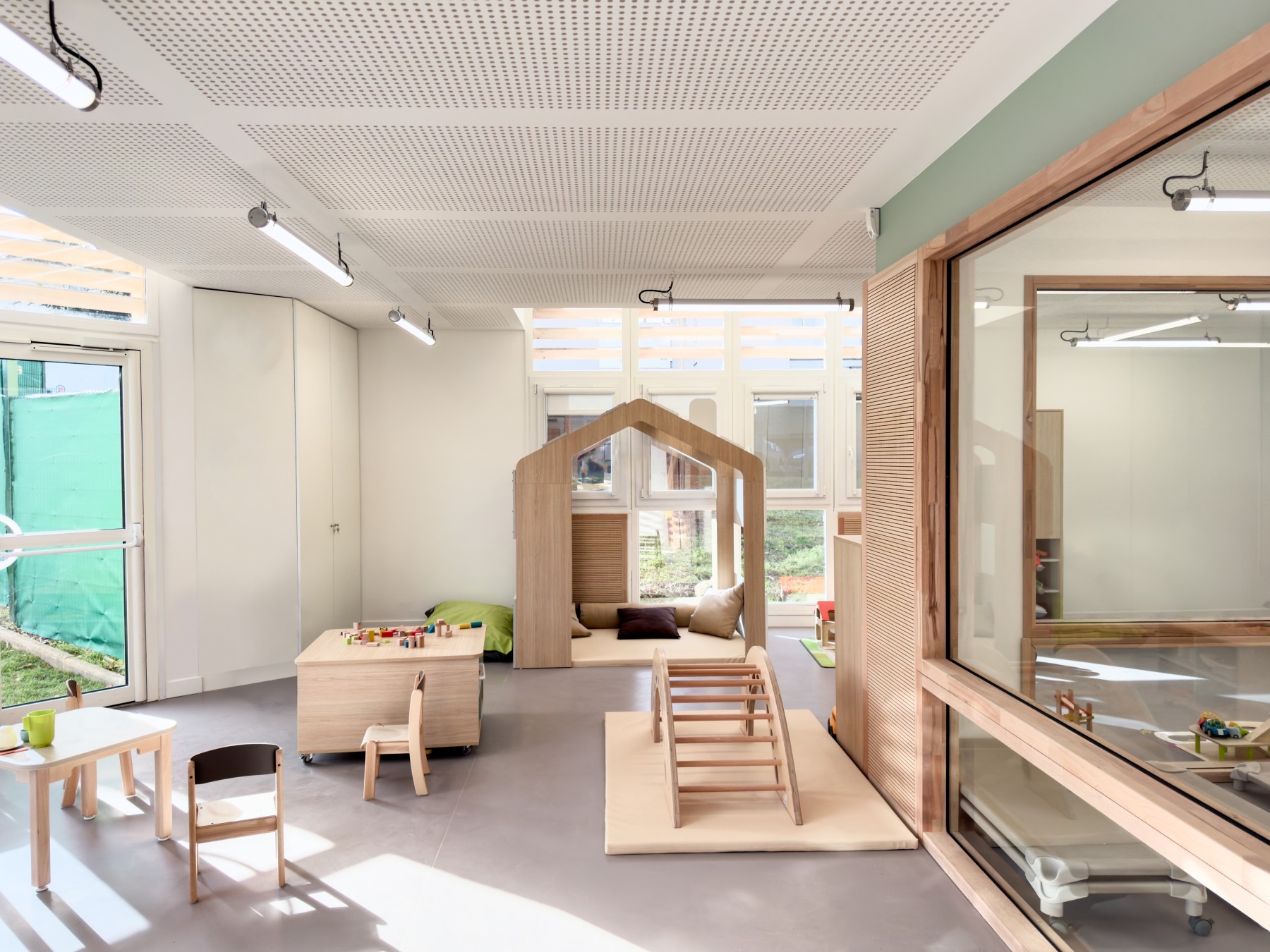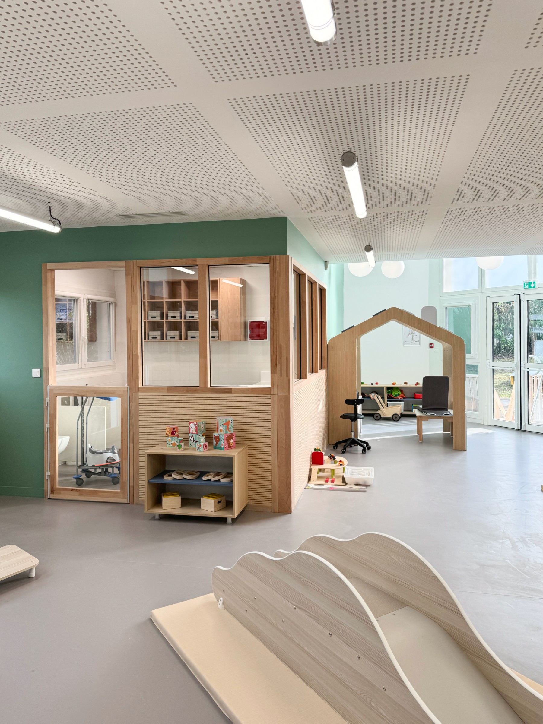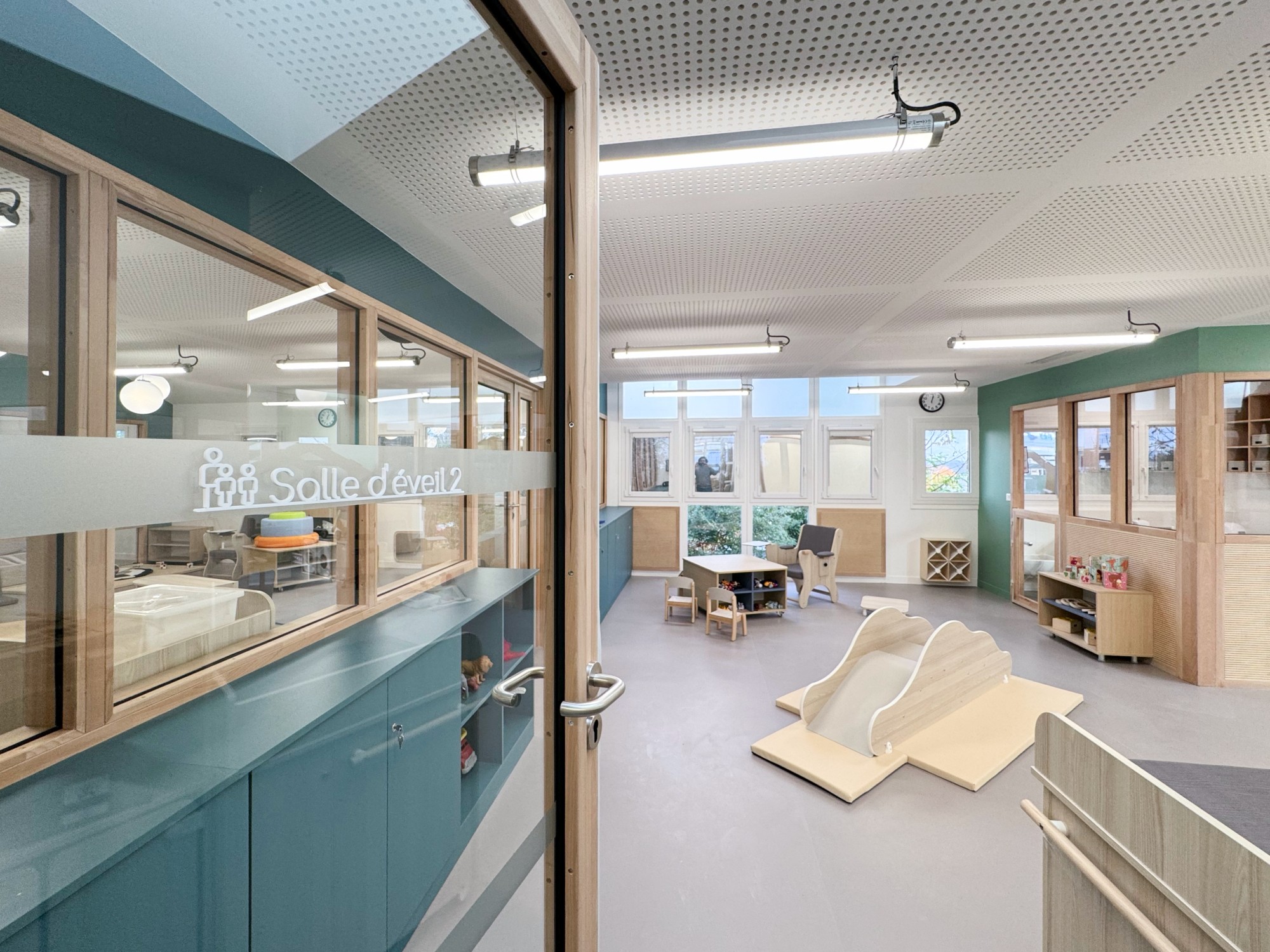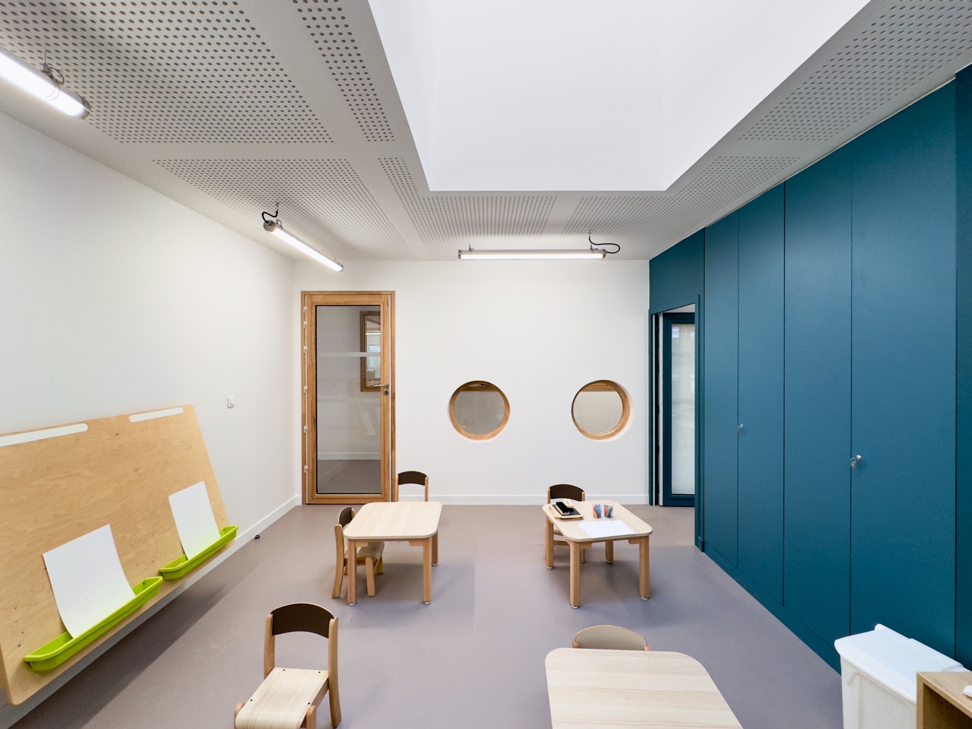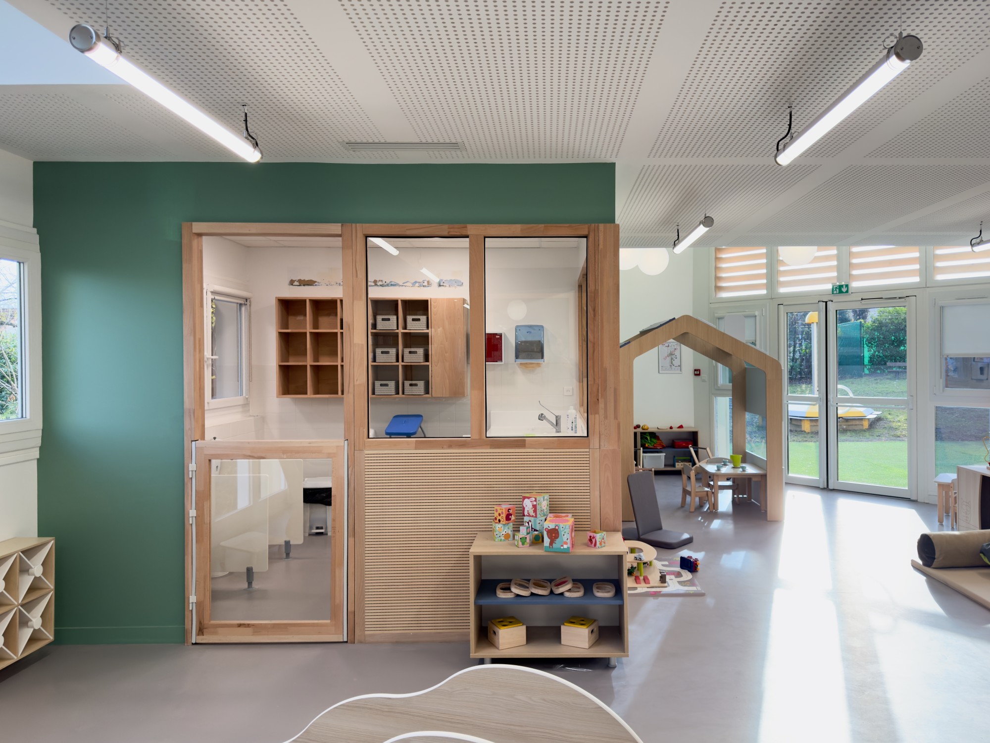 Les circulations colorées épousent des courbes accompagnant les mouvements dans un esprit rassurant, les menuiseries bois apportent la douceur d'un matériaux naturel, les lumières et couleurs enrobent enfants et personnels d'une ambiance douce et paisible. La question de la réhabilitation des crèches aujourd'hui revêt un enjeu majeur, celui du développement moteur et psychique au sein d'un cadre de confort. Chaque détail ou dispositif doit être conçu et réfléchi en pleine harmonie avec l'évolution progressive des jeunes enfants et la sérénité du personnel encadrant.