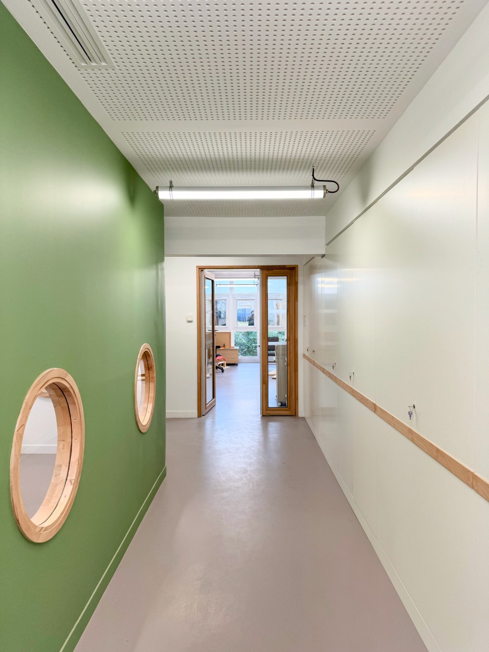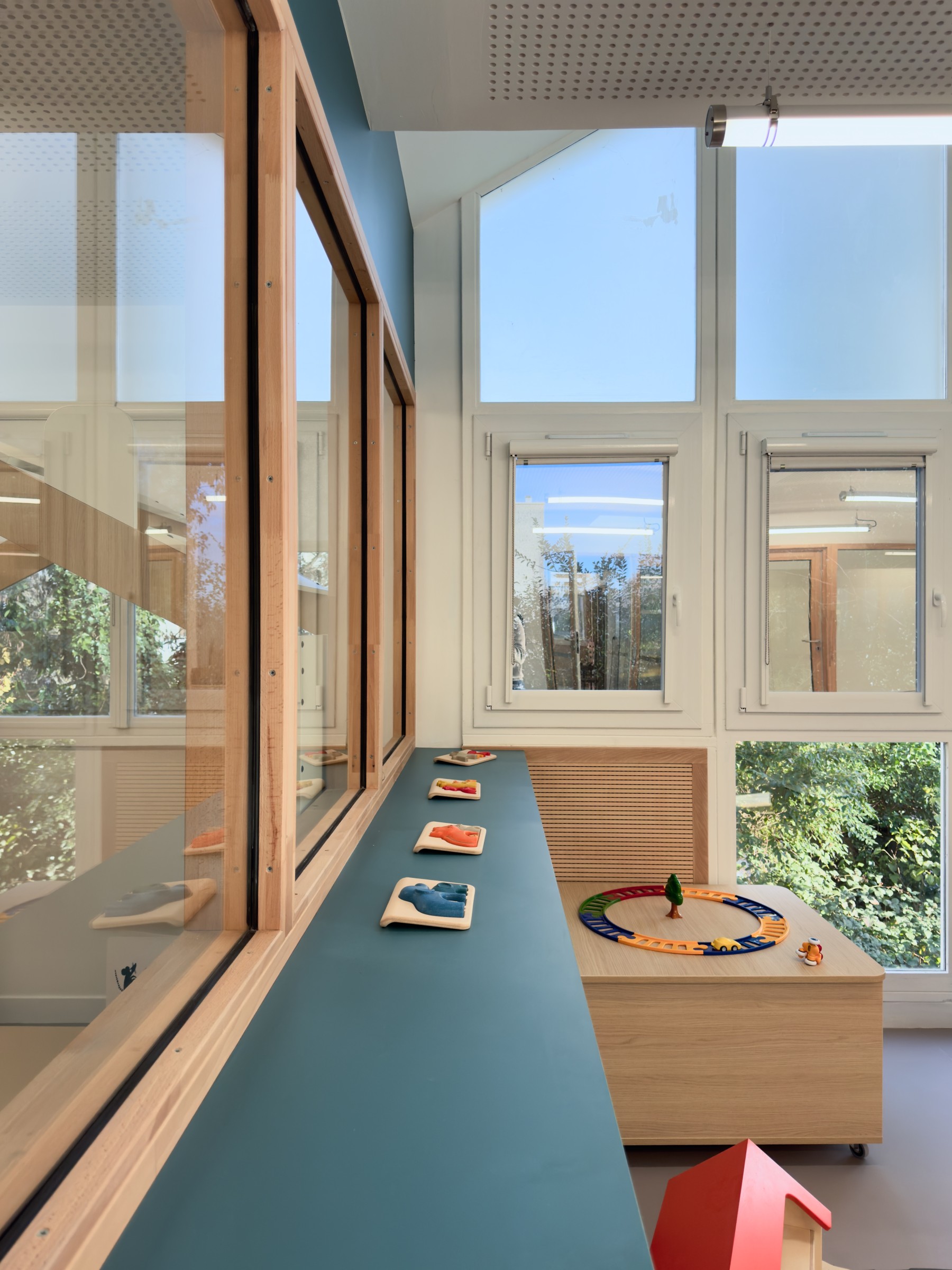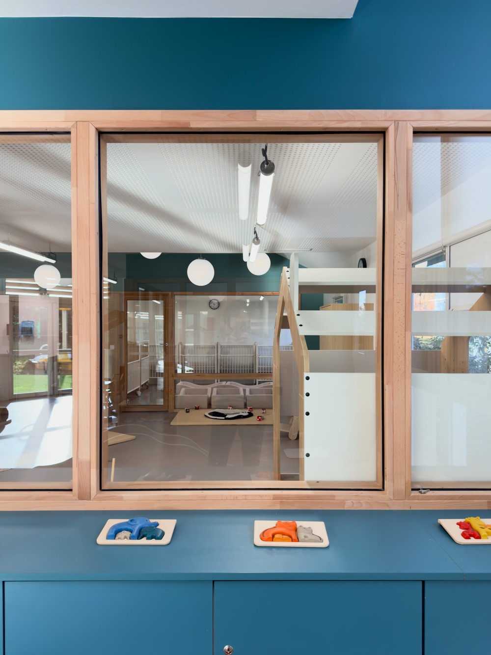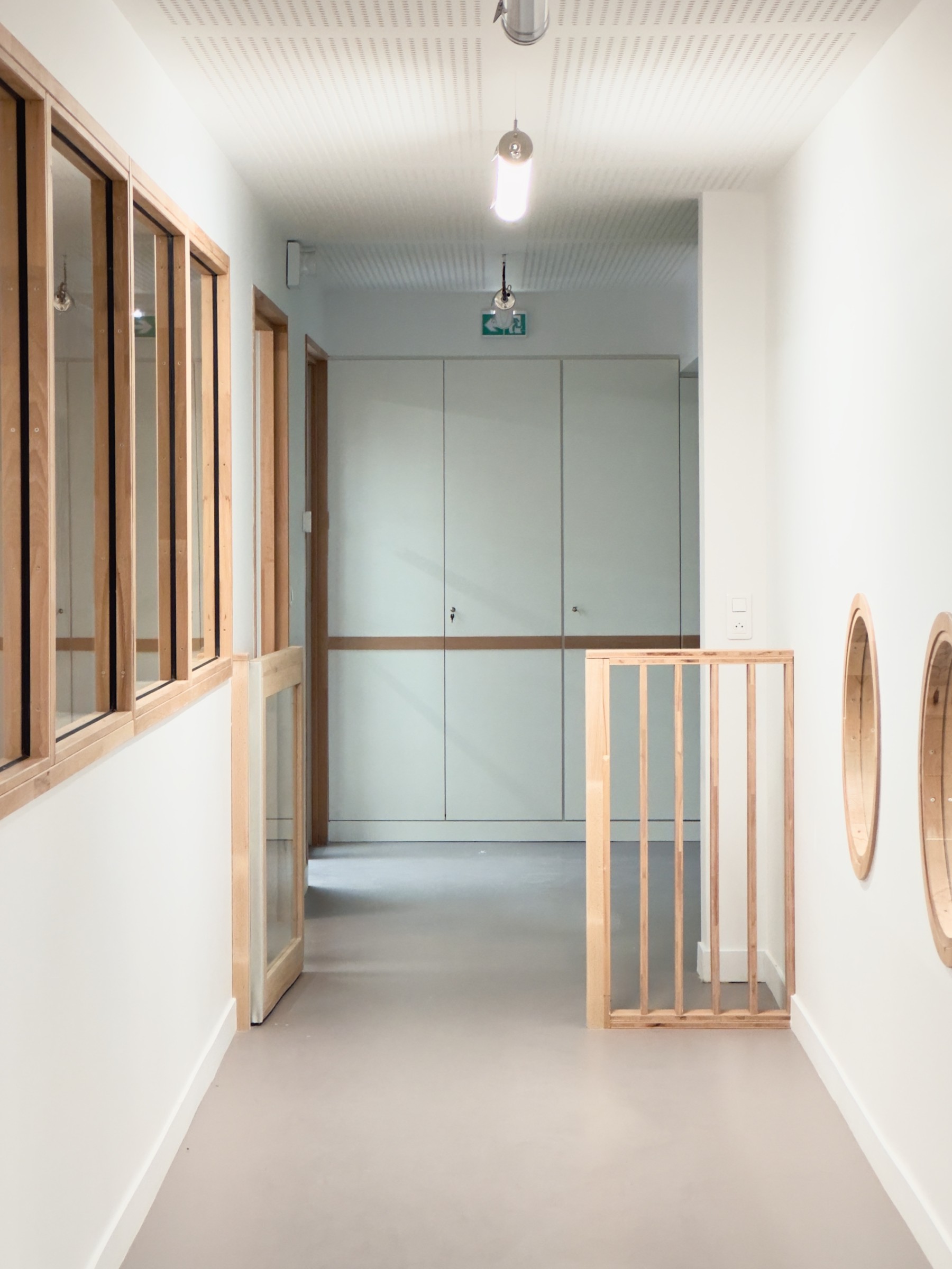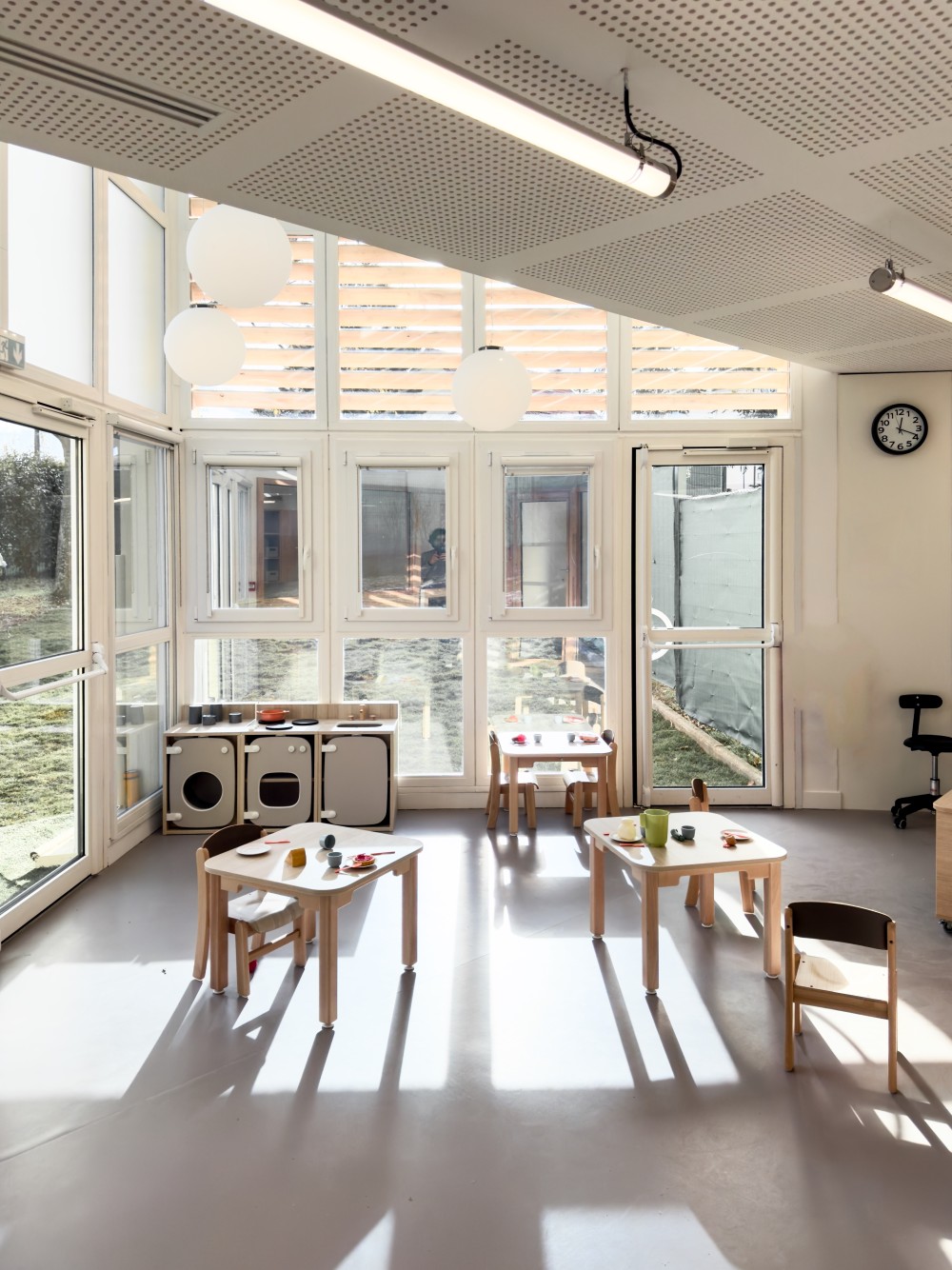 Les circulations colorées épousent des courbes accompagnant les mouvements dans un esprit rassurant, les menuiseries bois apportent la douceur d'un matériaux naturel, les lumières et couleurs enrobent enfants et personnels d'une ambiance douce et paisible. La question de la réhabilitation des crèches aujourd'hui revêt un enjeu majeur, celui du développement moteur et psychique au sein d'un cadre de confort. Chaque détail ou dispositif doit être conçu et réfléchi en pleine harmonie avec l'évolution progressive des jeunes enfants et la sérénité du personnel encadrant.