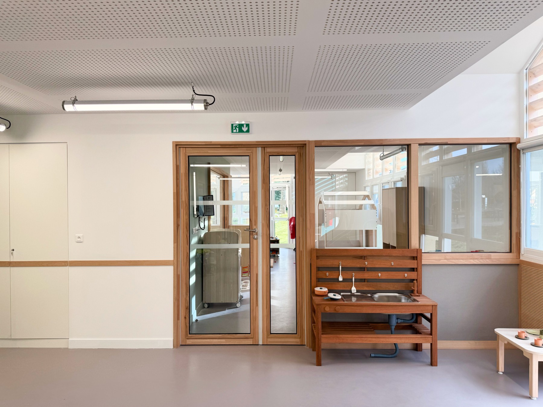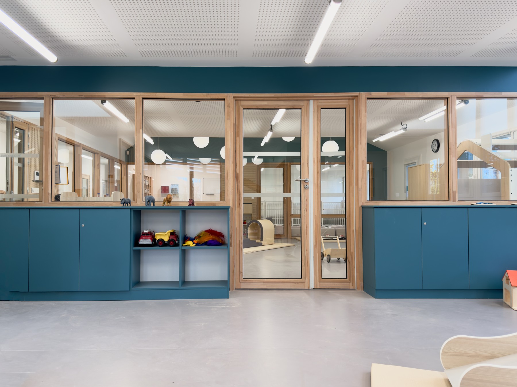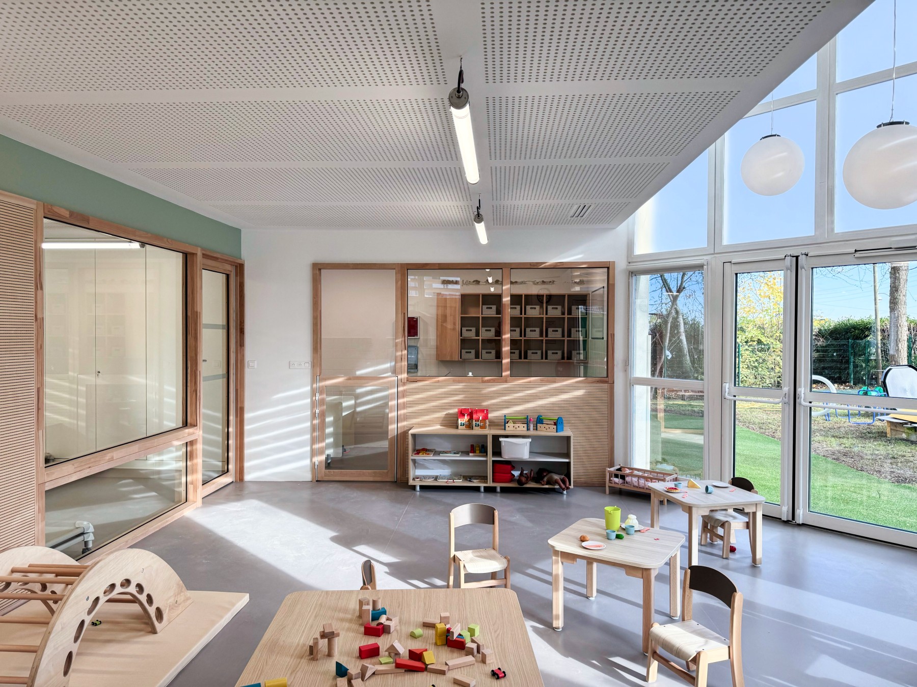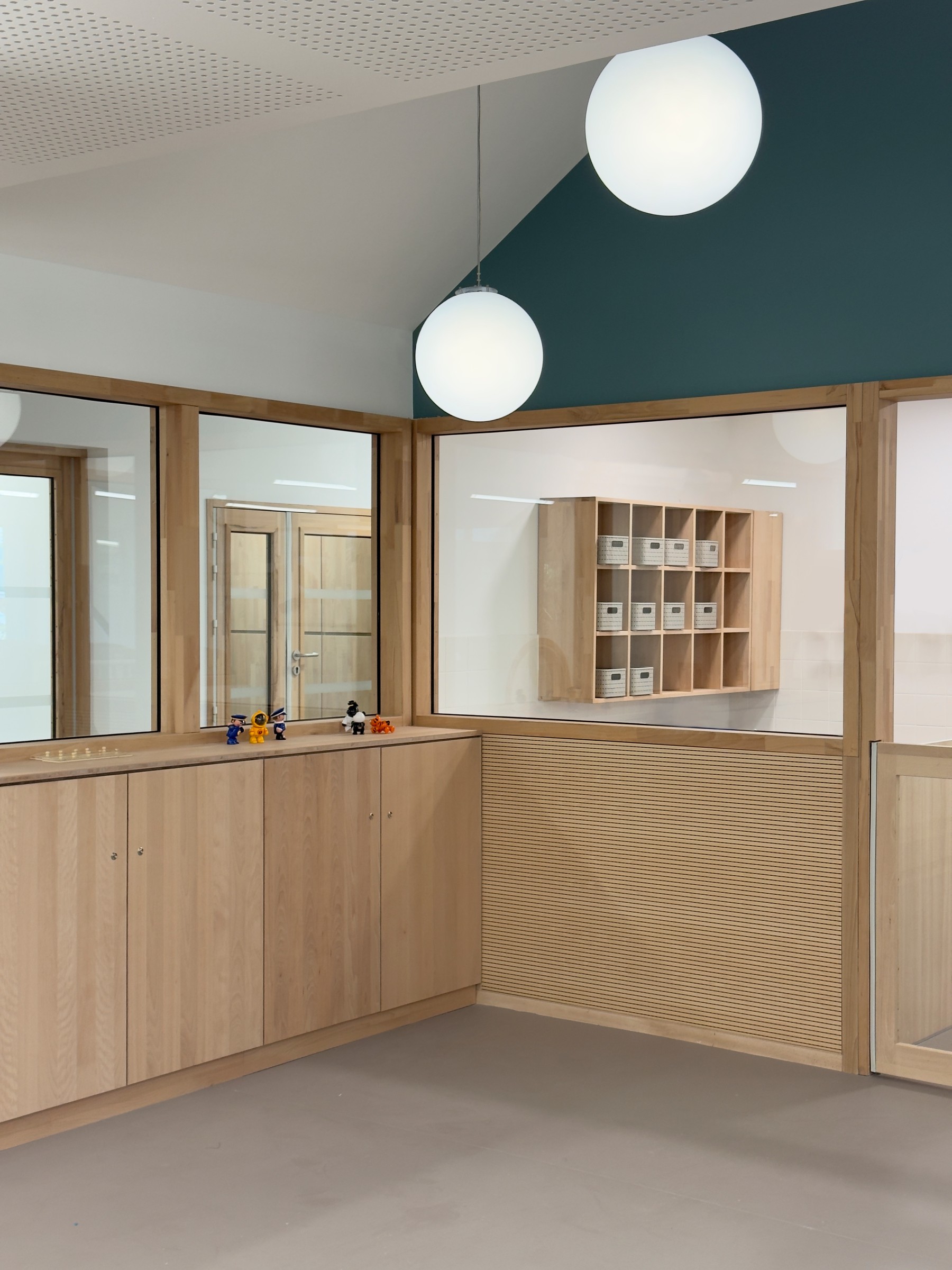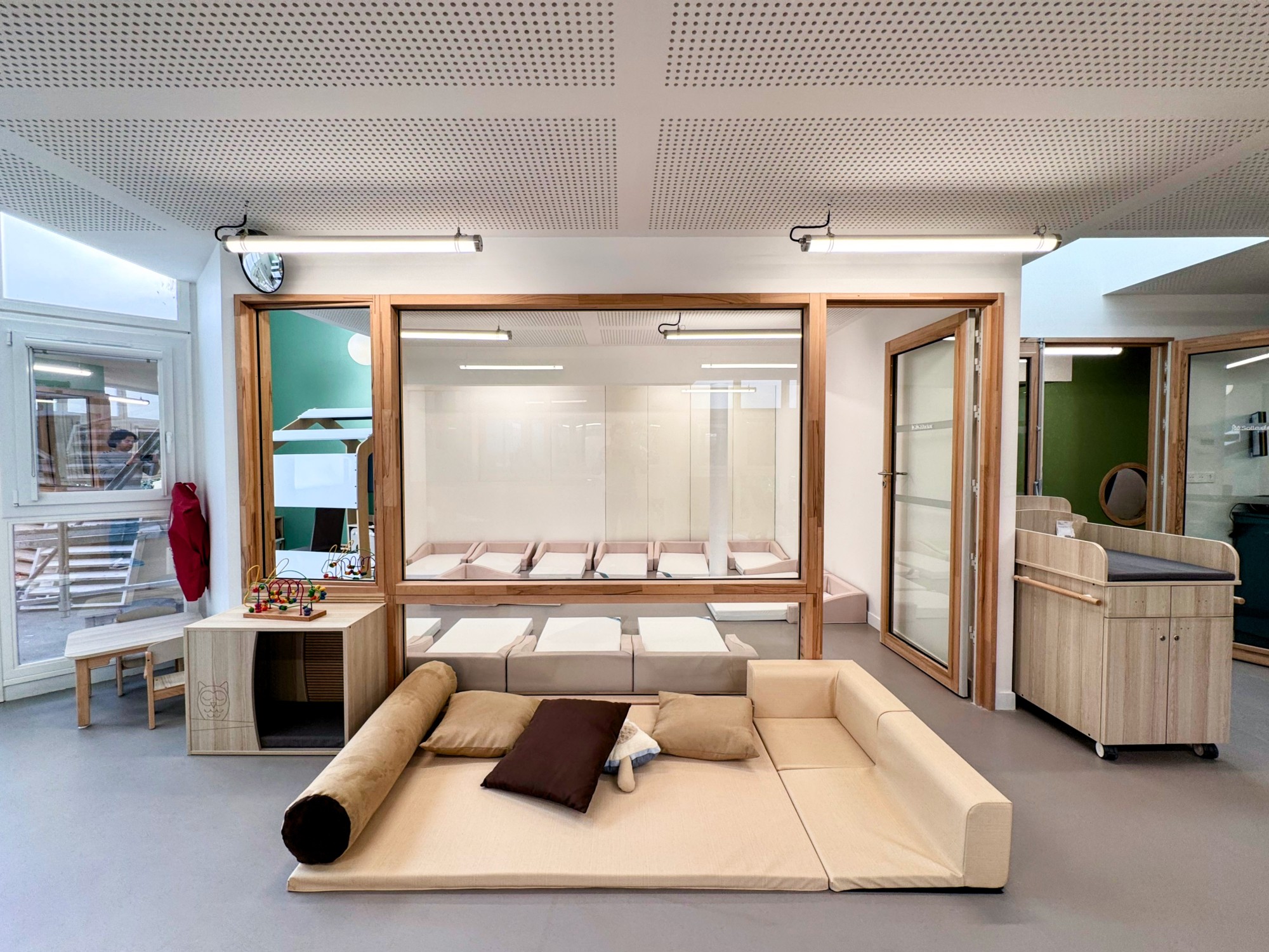 Les circulations colorées épousent des courbes accompagnant les mouvements dans un esprit rassurant, les menuiseries bois apportent la douceur d'un matériaux naturel, les lumières et couleurs enrobent enfants et personnels d'une ambiance douce et paisible. La question de la réhabilitation des crèches aujourd'hui revêt un enjeu majeur, celui du développement moteur et psychique au sein d'un cadre de confort. Chaque détail ou dispositif doit être conçu et réfléchi en pleine harmonie avec l'évolution progressive des jeunes enfants et la sérénité du personnel encadrant.