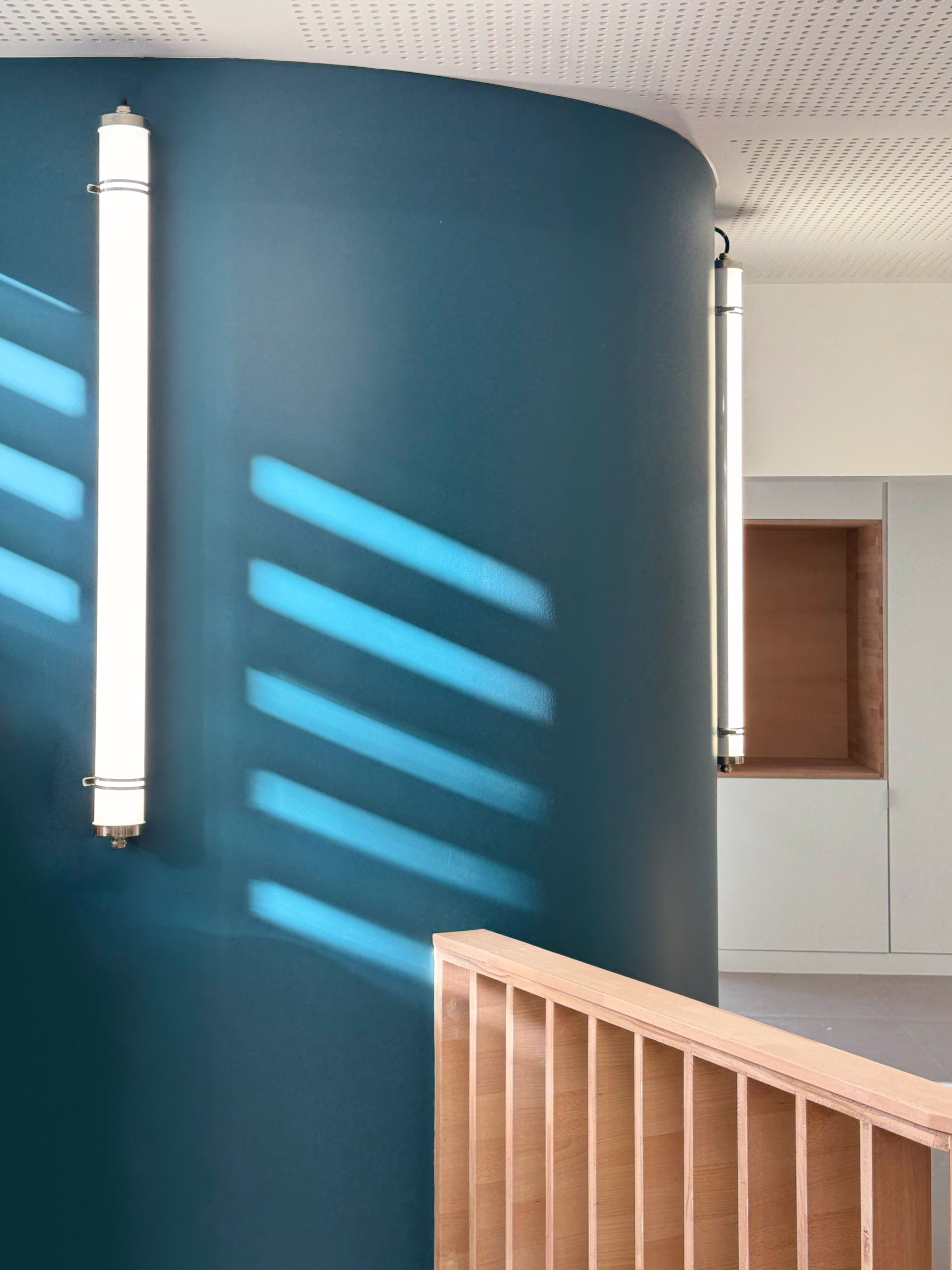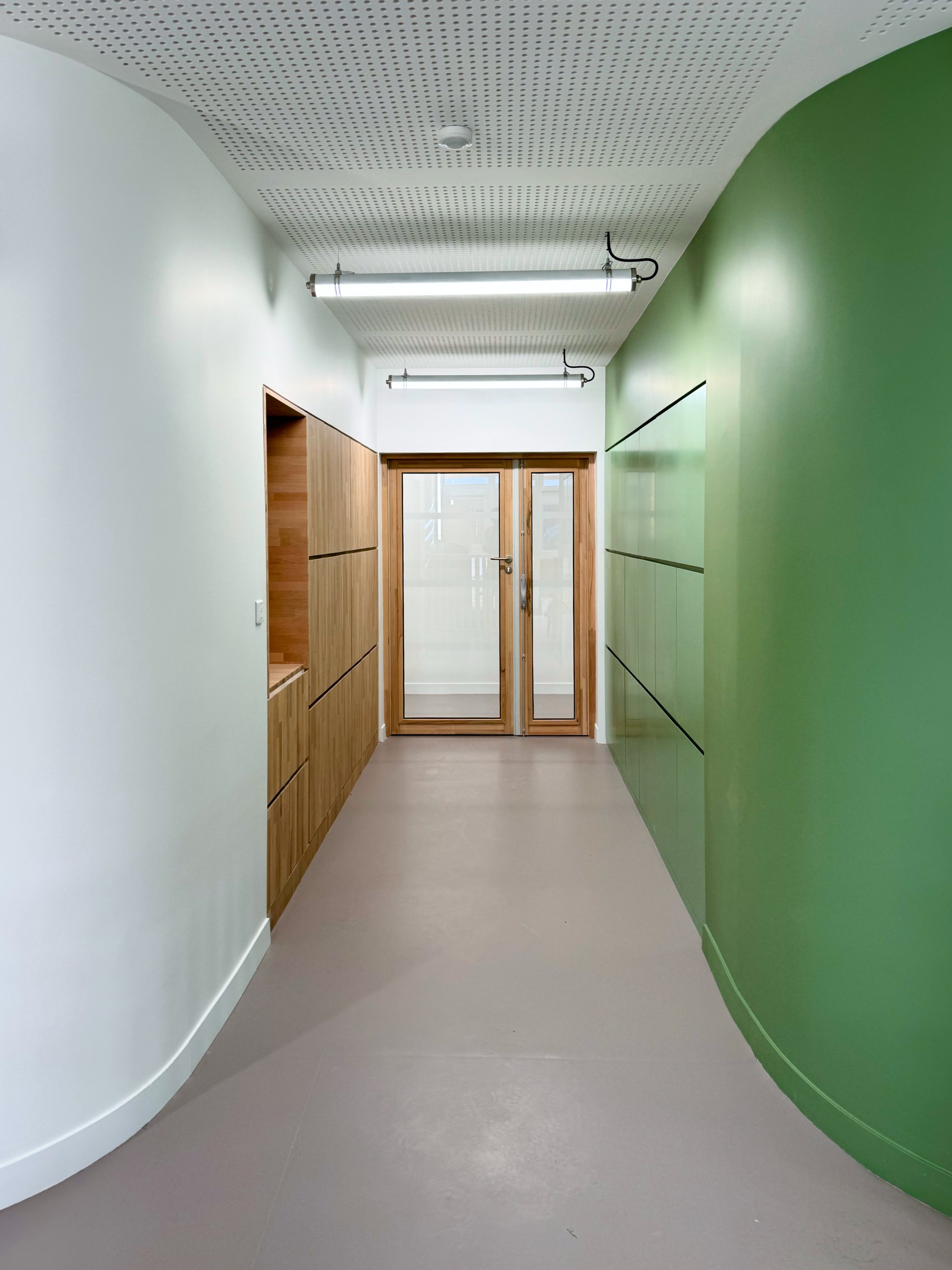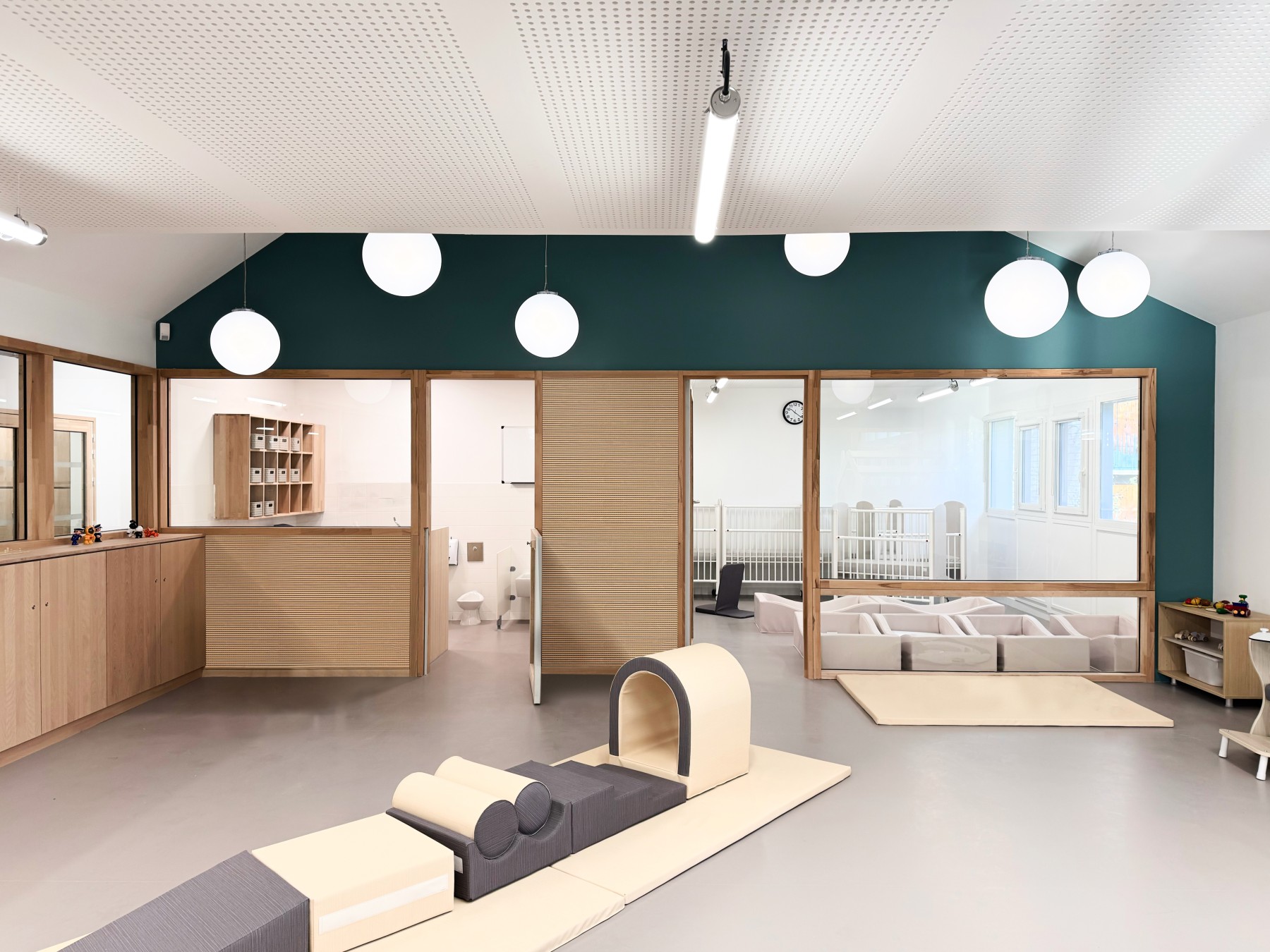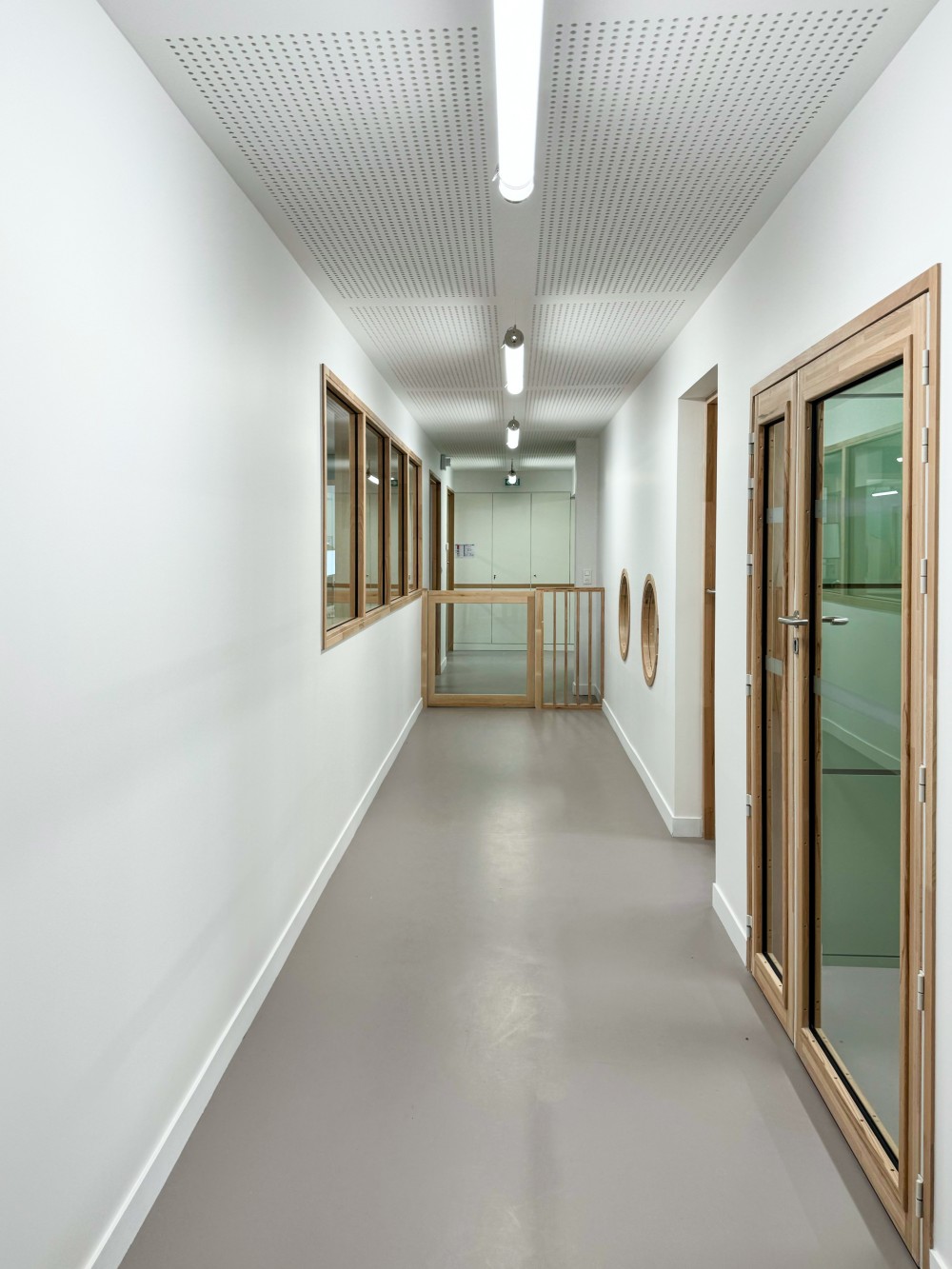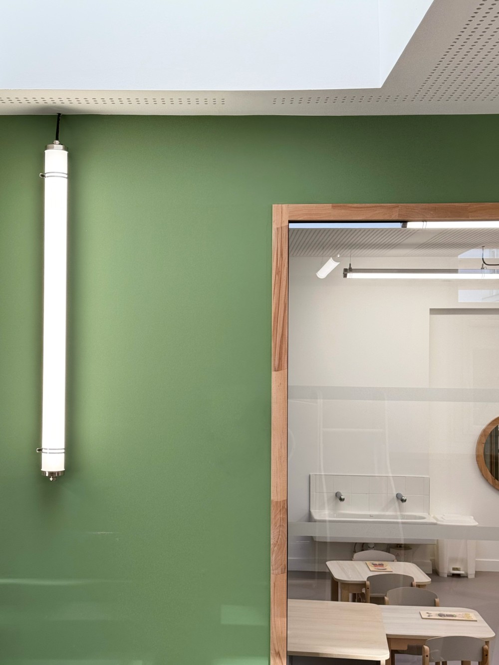 Les circulations colorées épousent des courbes accompagnant les mouvements dans un esprit rassurant, les menuiseries bois apportent la douceur d'un matériaux naturel, les lumières et couleurs enrobent enfants et personnels d'une ambiance douce et paisible. La question de la réhabilitation des crèches aujourd'hui revêt un enjeu majeur, celui du développement moteur et psychique au sein d'un cadre de confort. Chaque détail ou dispositif doit être conçu et réfléchi en pleine harmonie avec l'évolution progressive des jeunes enfants et la sérénité du personnel encadrant.