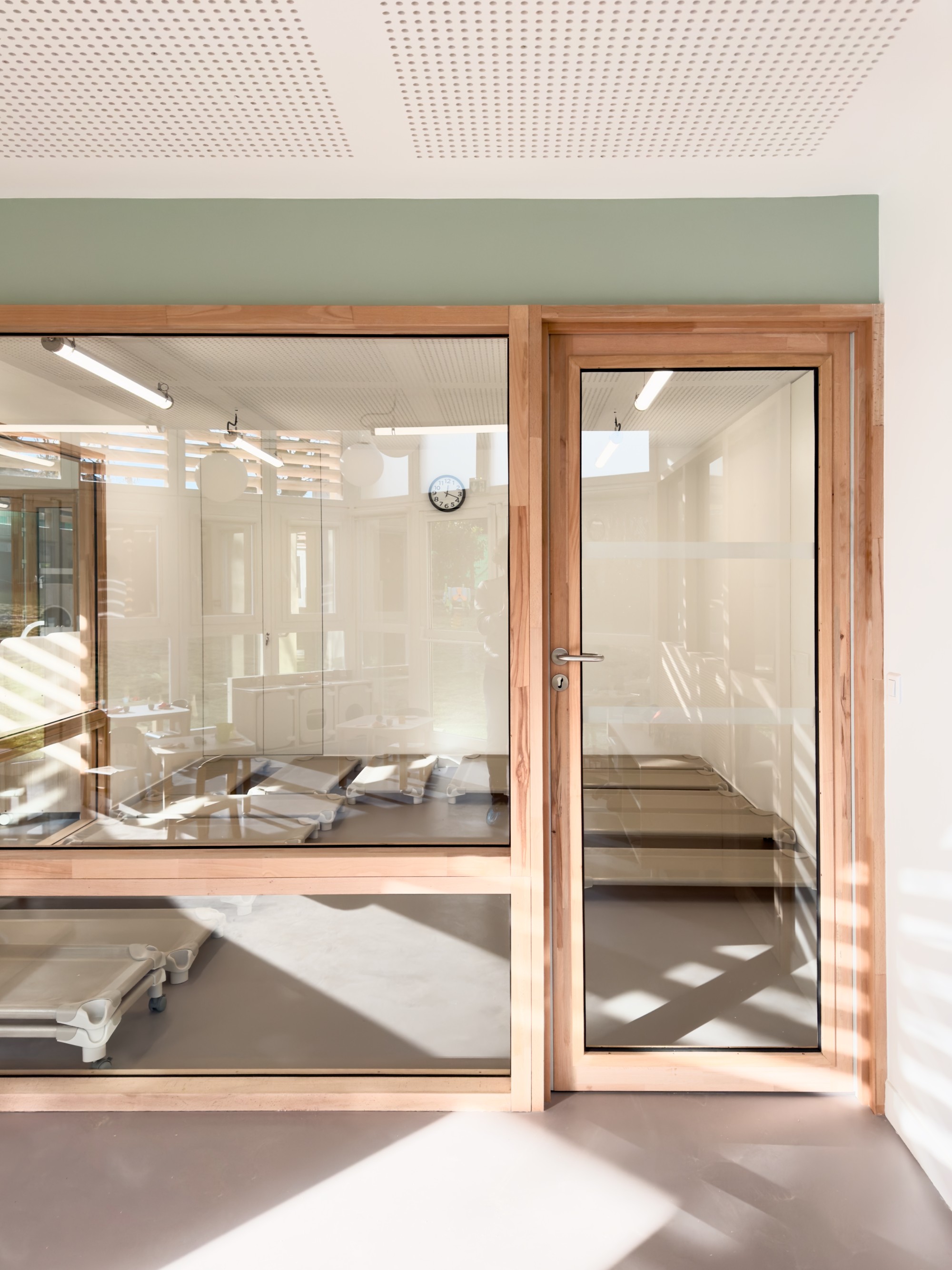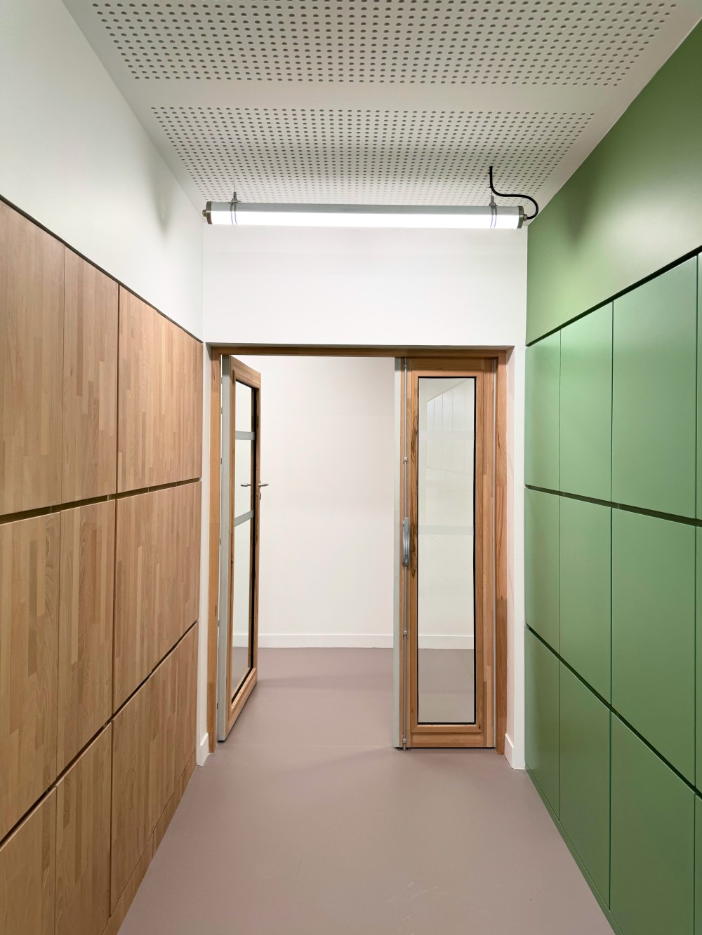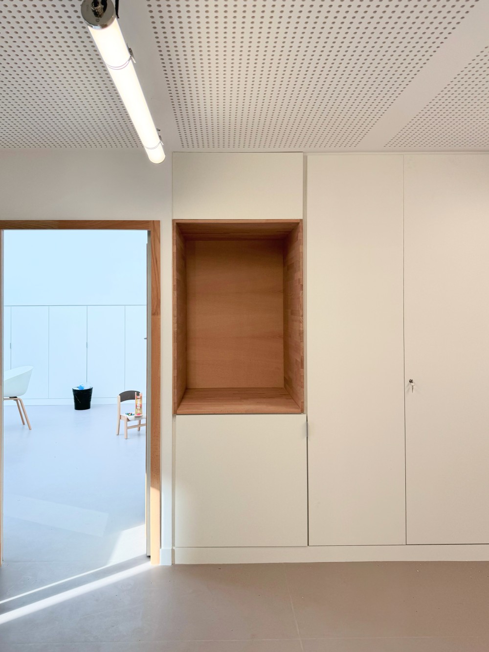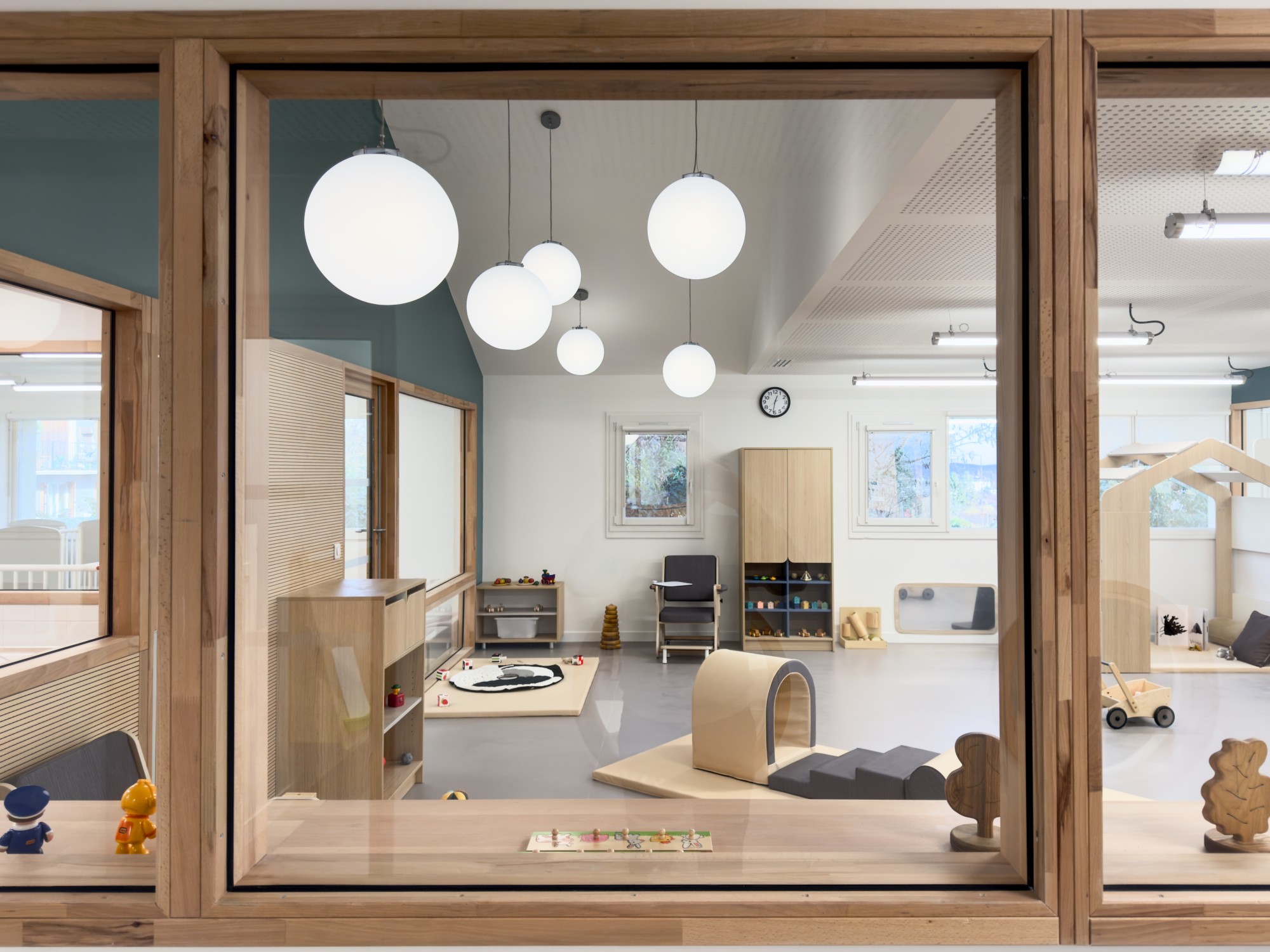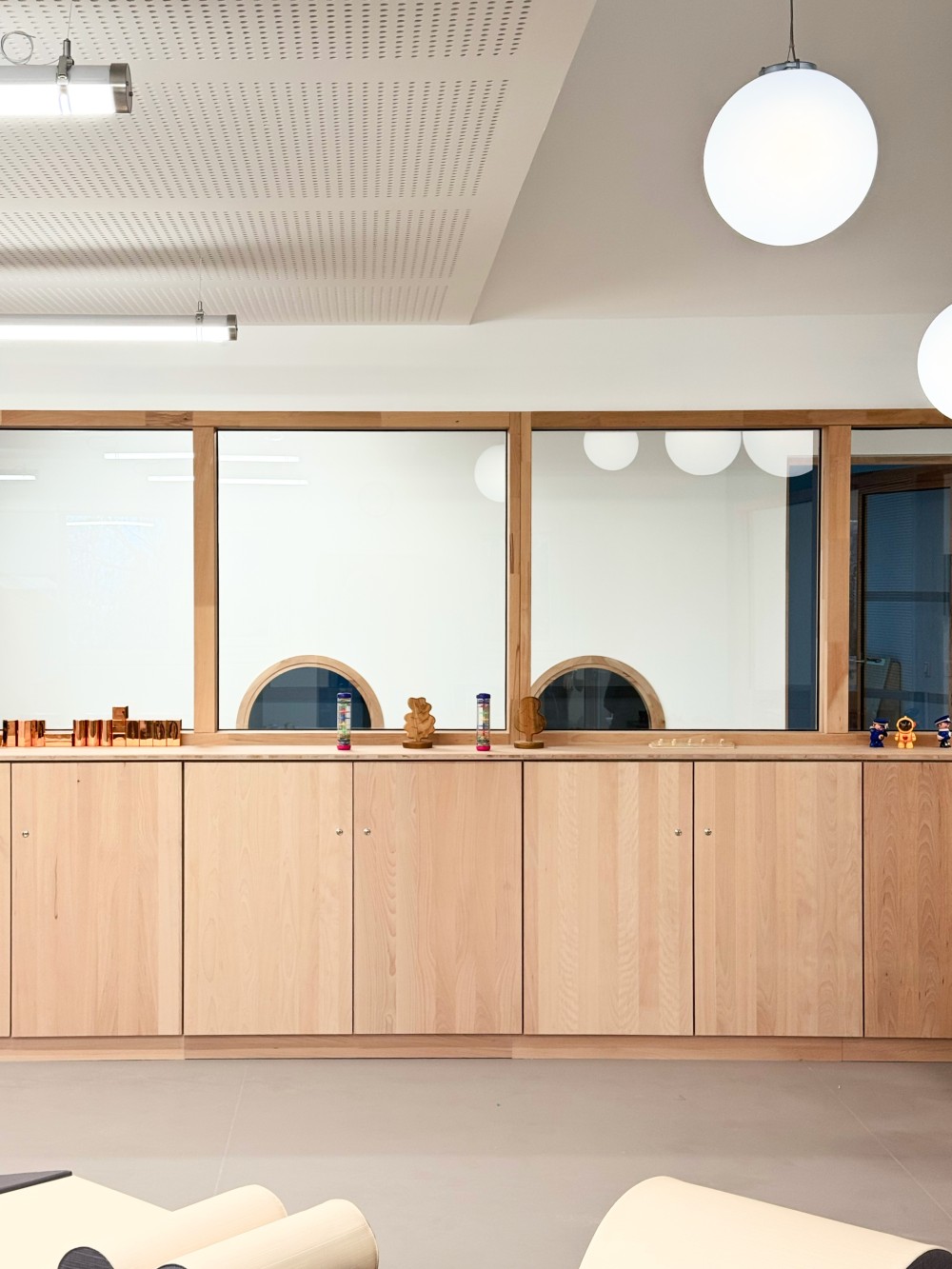 Les circulations colorées épousent des courbes accompagnant les mouvements dans un esprit rassurant, les menuiseries bois apportent la douceur d'un matériaux naturel, les lumières et couleurs enrobent enfants et personnels d'une ambiance douce et paisible. La question de la réhabilitation des crèches aujourd'hui revêt un enjeu majeur, celui du développement moteur et psychique au sein d'un cadre de confort. Chaque détail ou dispositif doit être conçu et réfléchi en pleine harmonie avec l'évolution progressive des jeunes enfants et la sérénité du personnel encadrant.