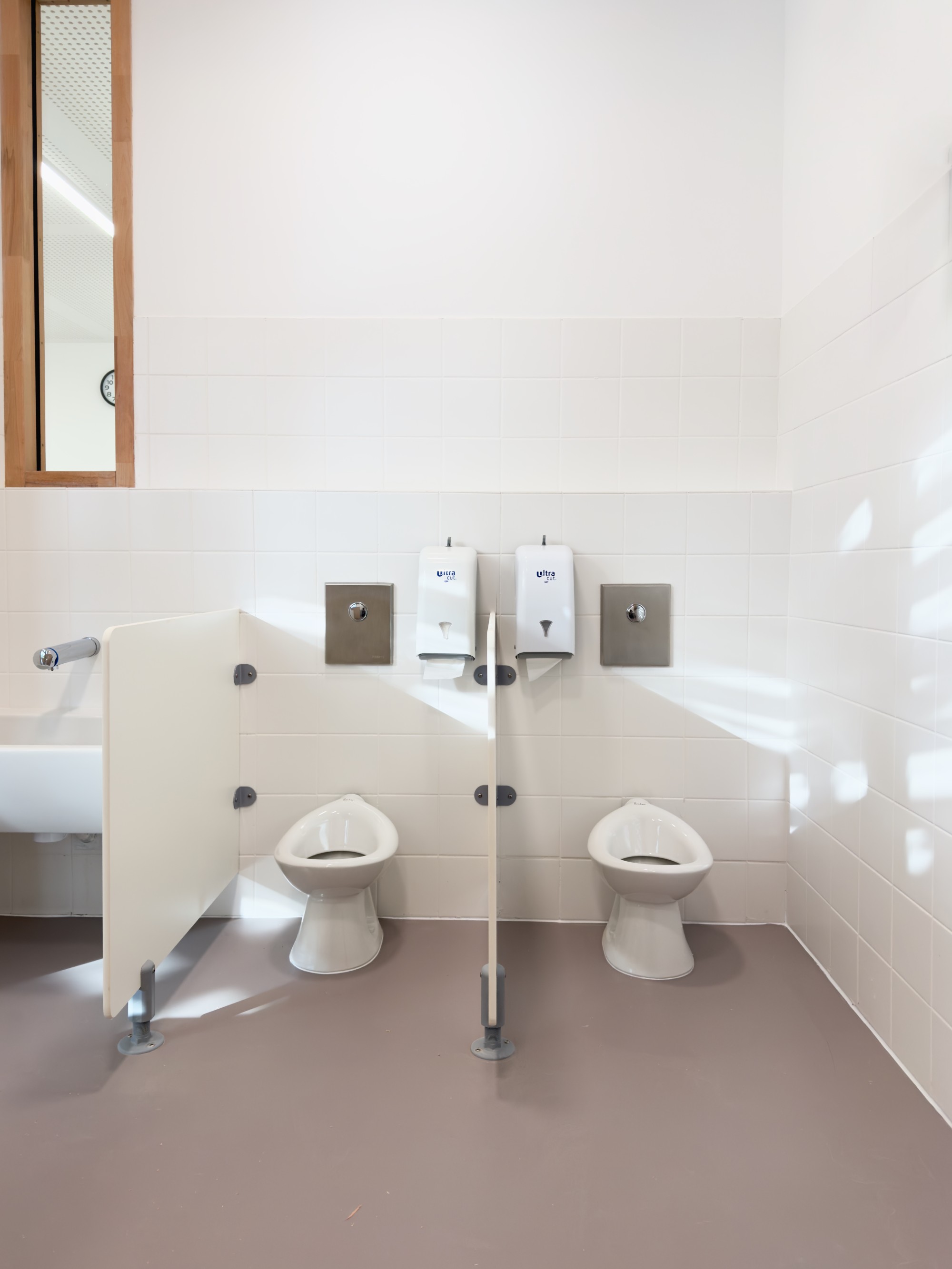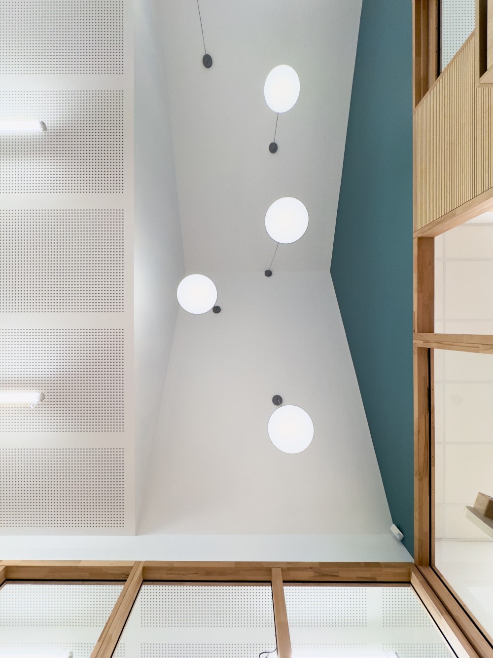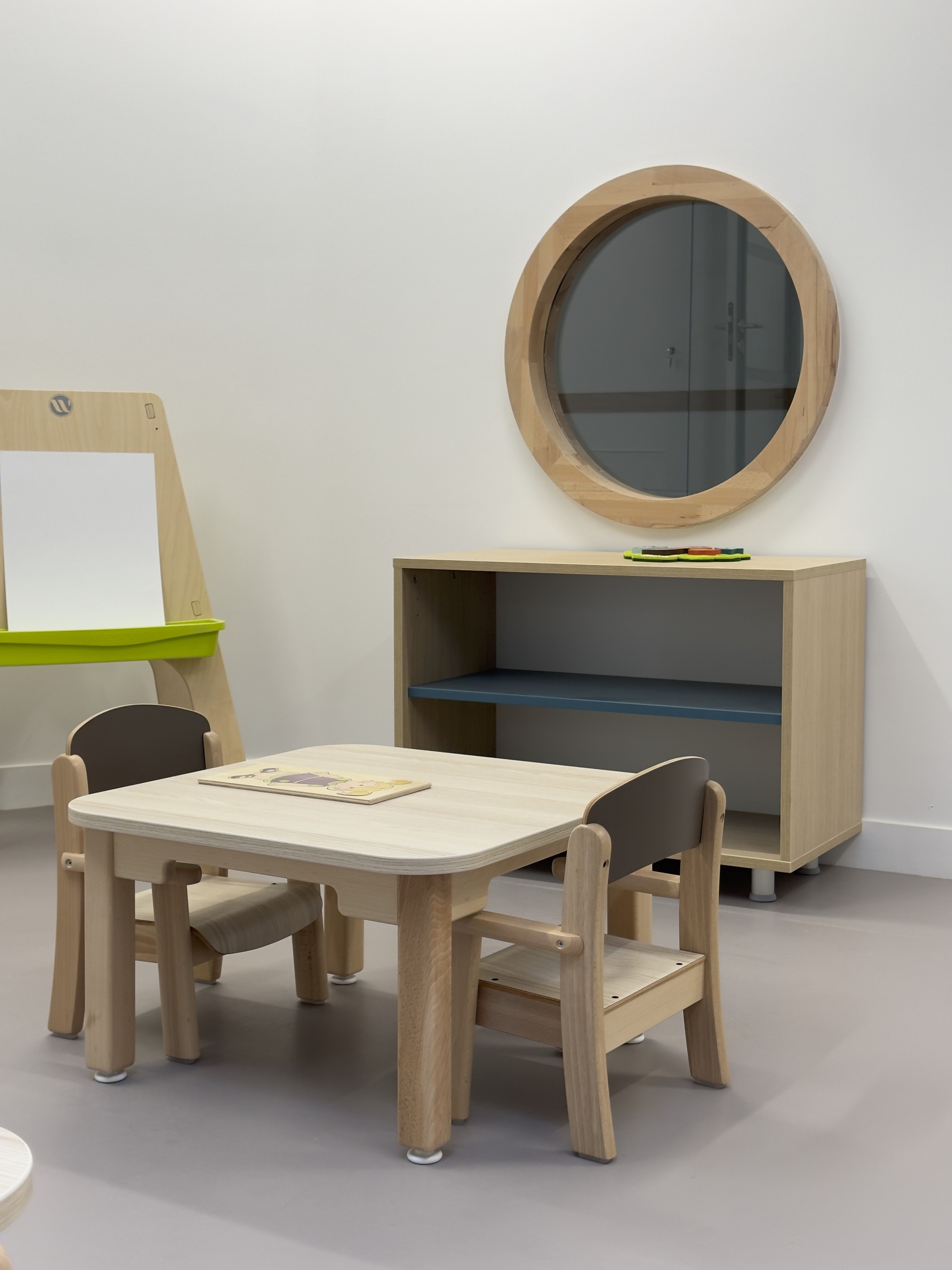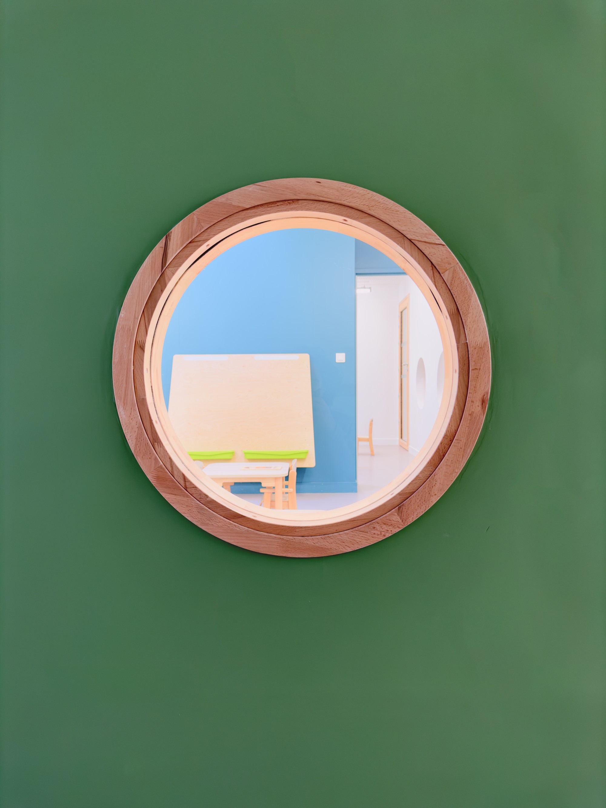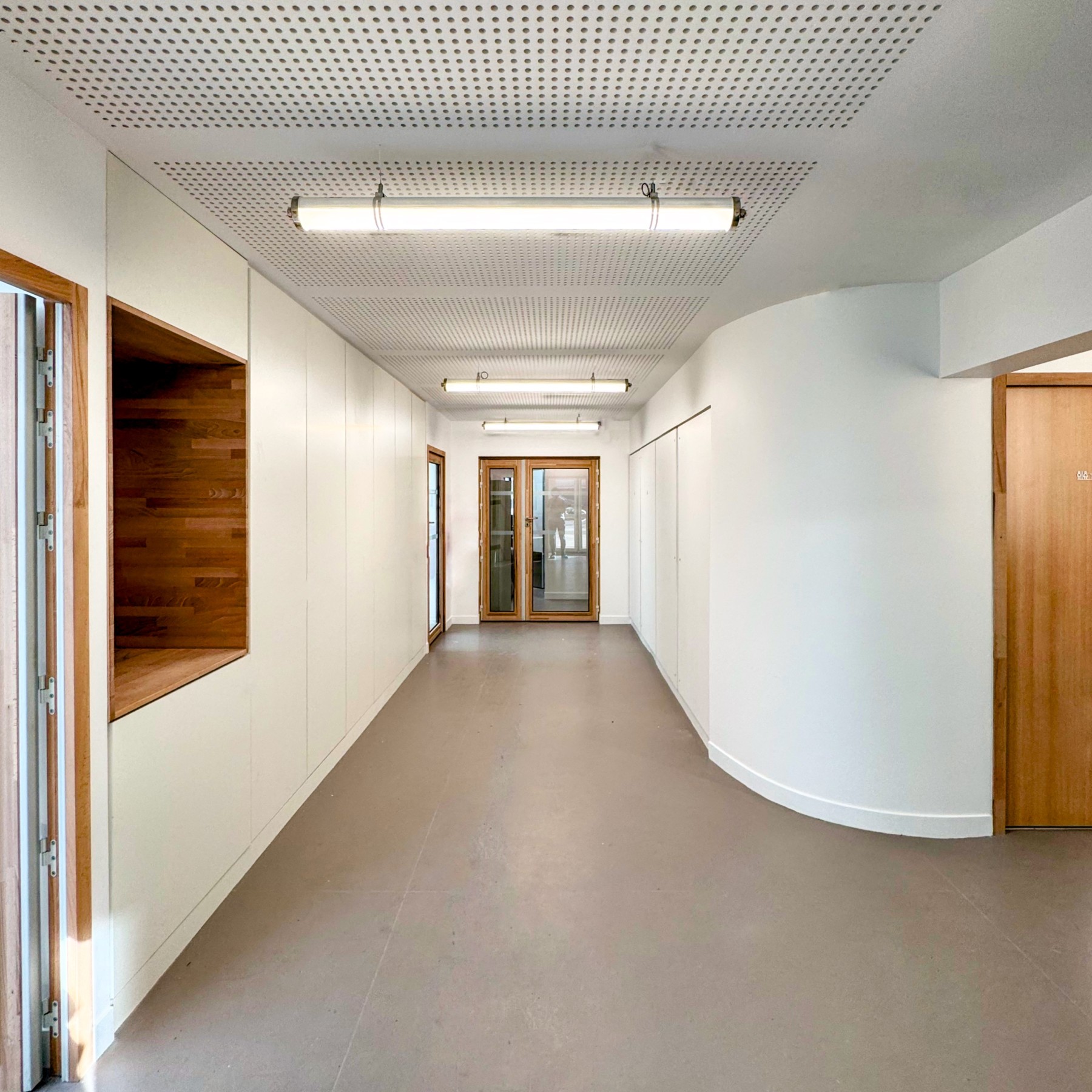 Les circulations colorées épousent des courbes accompagnant les mouvements dans un esprit rassurant, les menuiseries bois apportent la douceur d'un matériaux naturel, les lumières et couleurs enrobent enfants et personnels d'une ambiance douce et paisible. La question de la réhabilitation des crèches aujourd'hui revêt un enjeu majeur, celui du développement moteur et psychique au sein d'un cadre de confort. Chaque détail ou dispositif doit être conçu et réfléchi en pleine harmonie avec l'évolution progressive des jeunes enfants et la sérénité du personnel encadrant.
