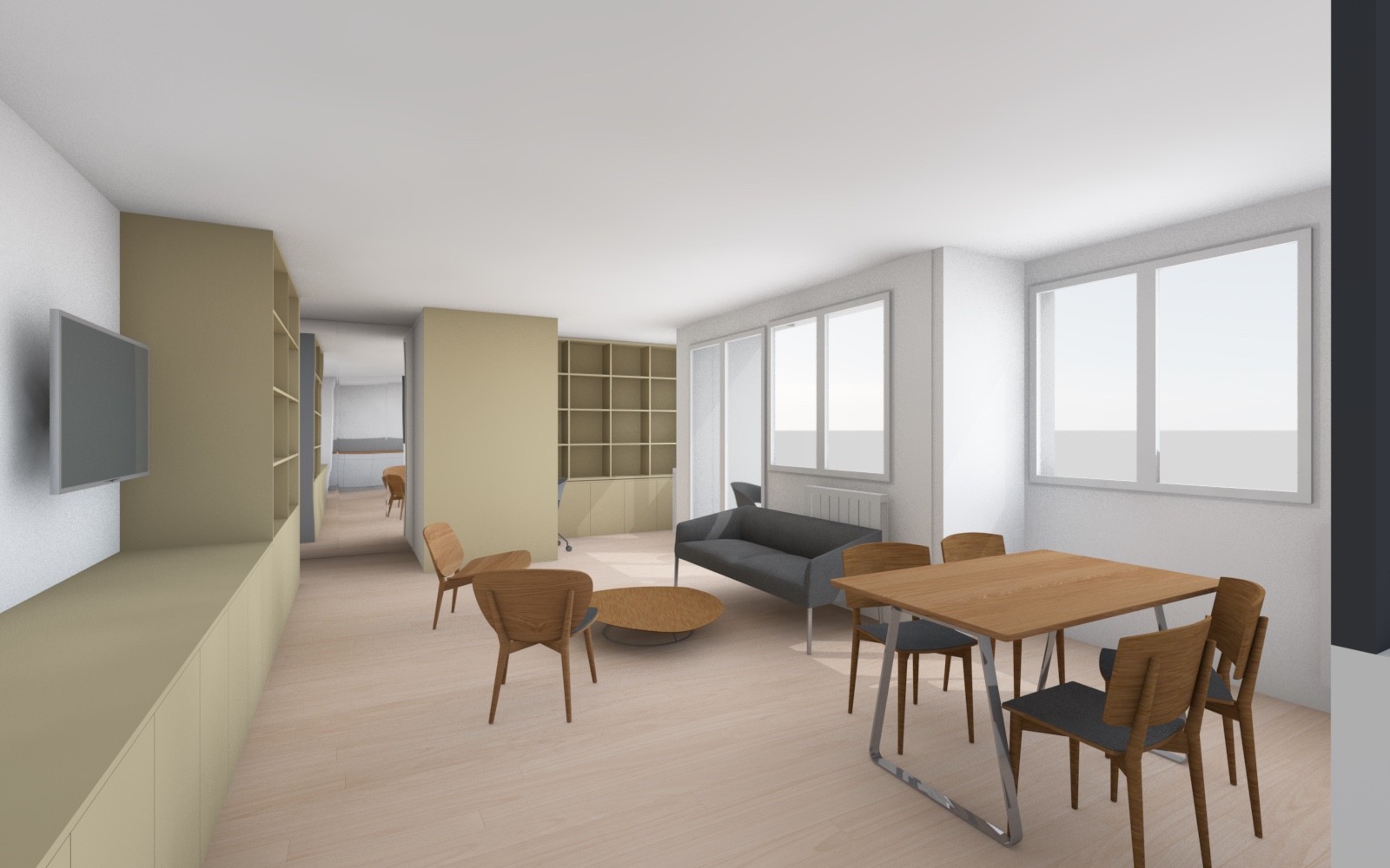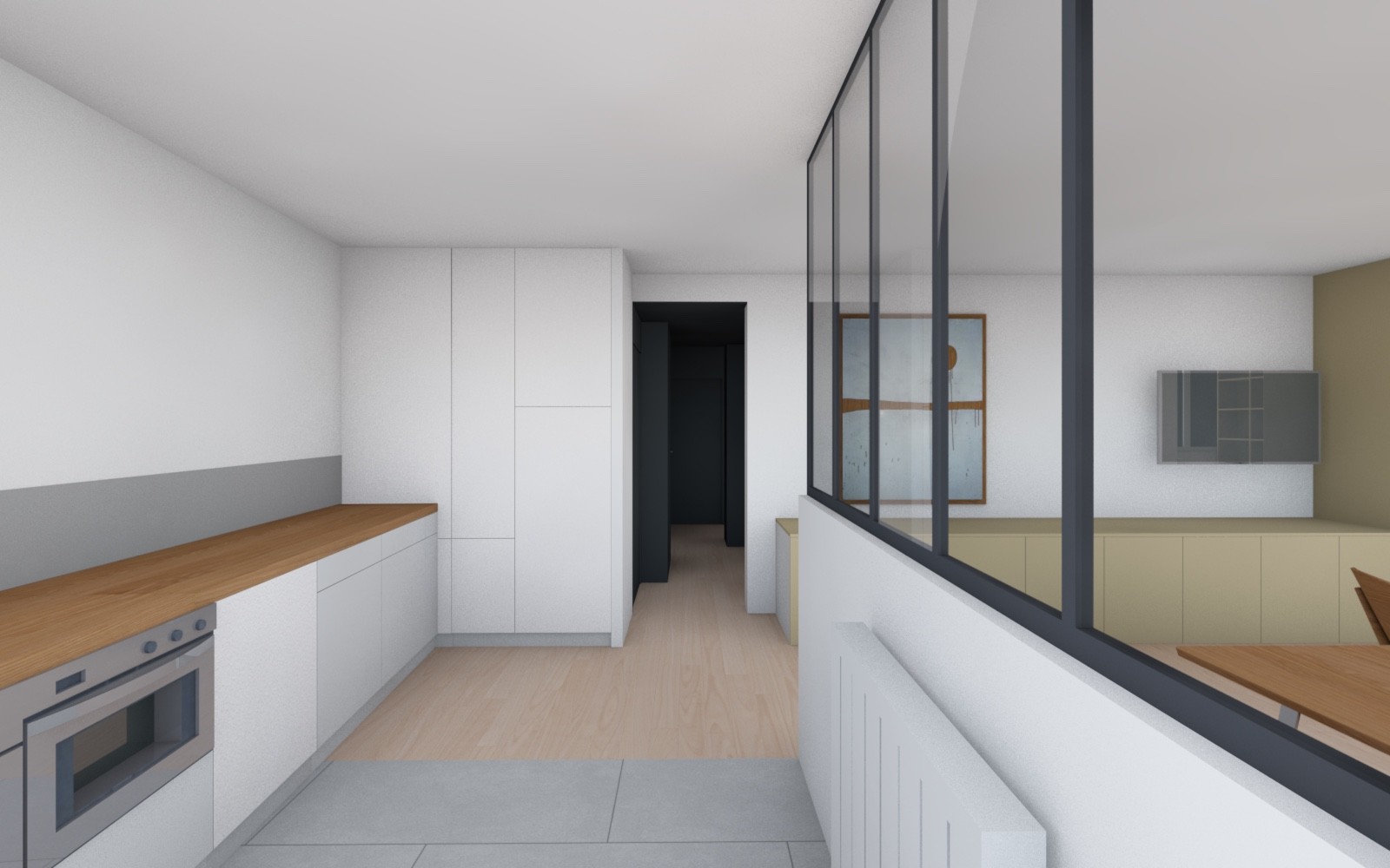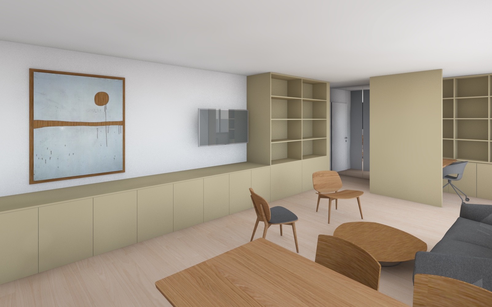 Le projet concerne le rassemblement de deux appartements de tris pièces, situés sur un même palier, en créant une communication dans une cloison de séparation. Le nouvel appartement créé comprend un salon, une cuisine, deux chambres, deux salles de bains, un bureau et une buanderie, et de nombreux espaces de rangement.