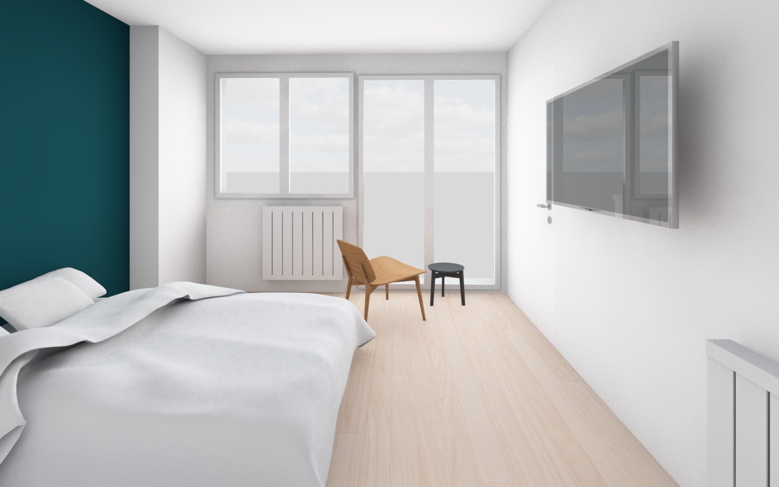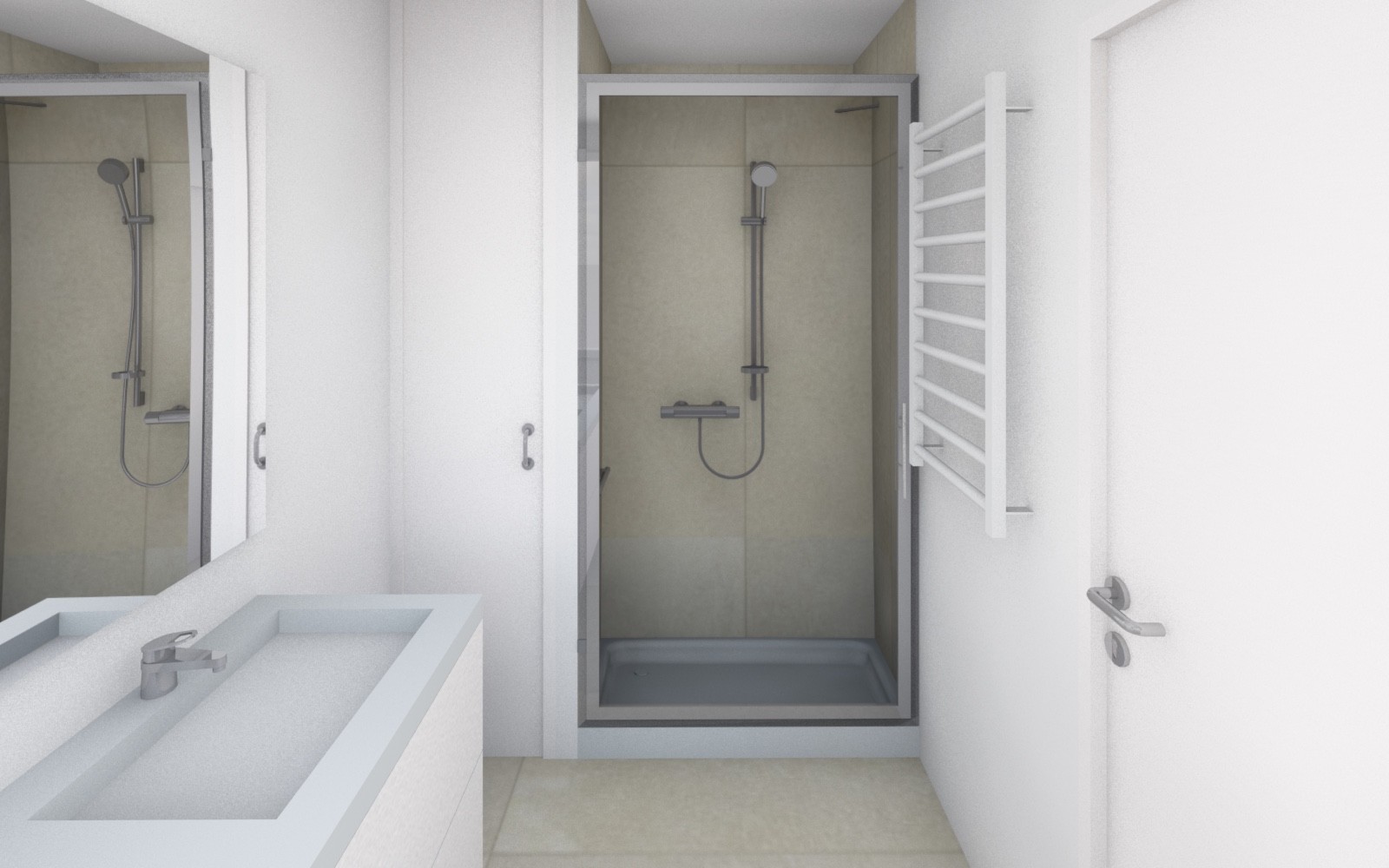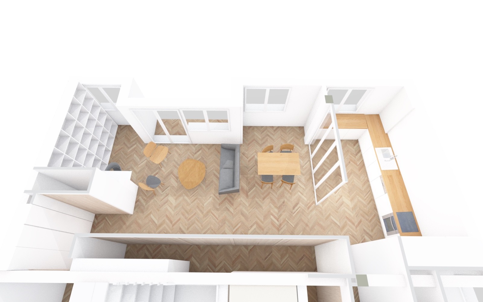 Le projet concerne le rassemblement de deux appartements de tris pièces, situés sur un même palier, en créant une communication dans une cloison de séparation. Le nouvel appartement créé comprend un salon, une cuisine, deux chambres, deux salles de bains, un bureau et une buanderie, et de nombreux espaces de rangement.