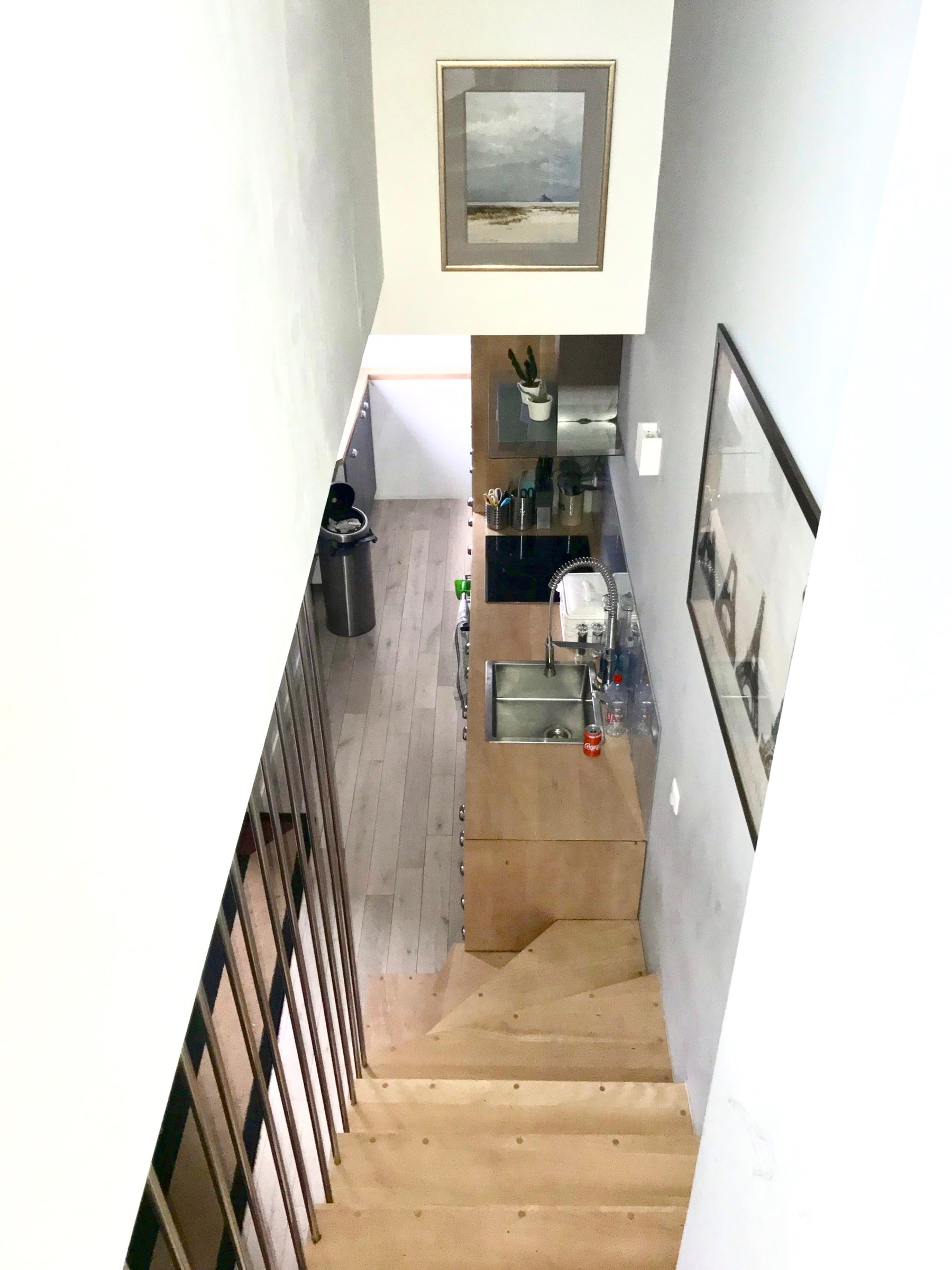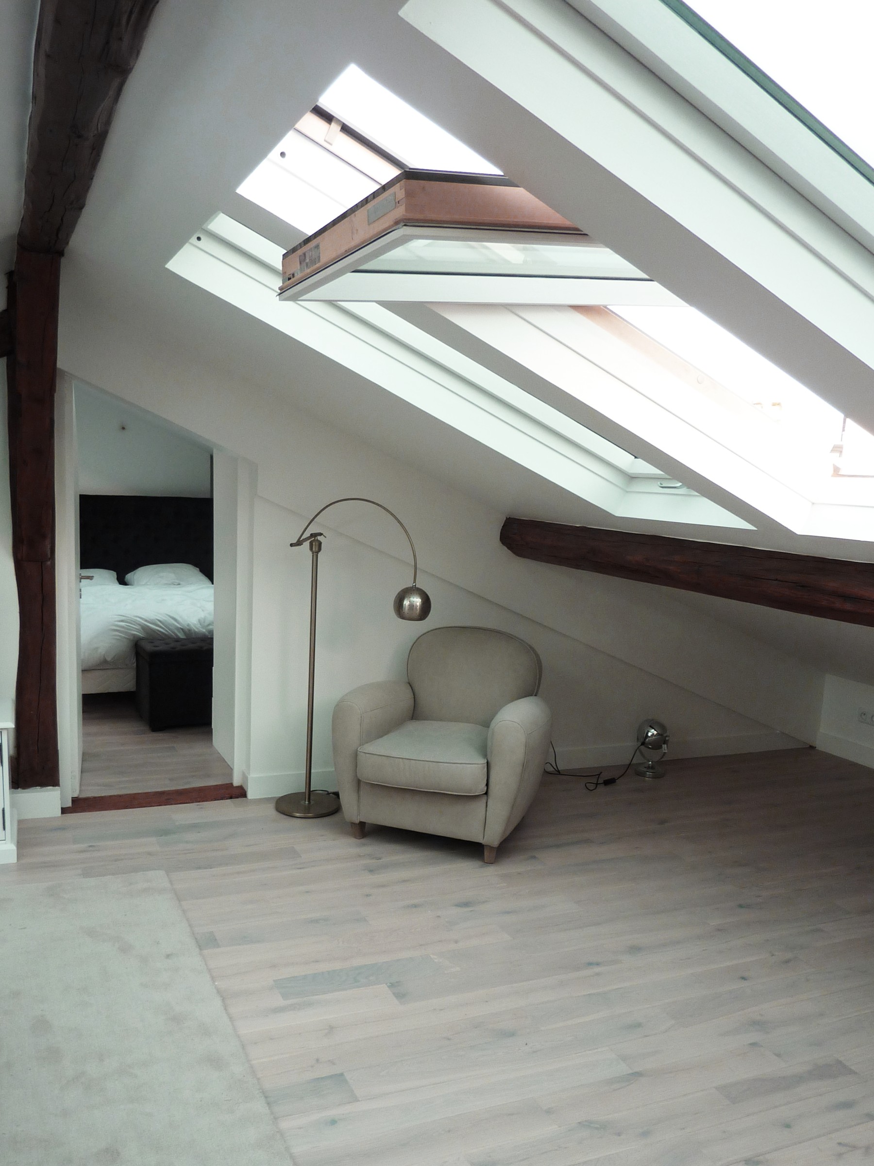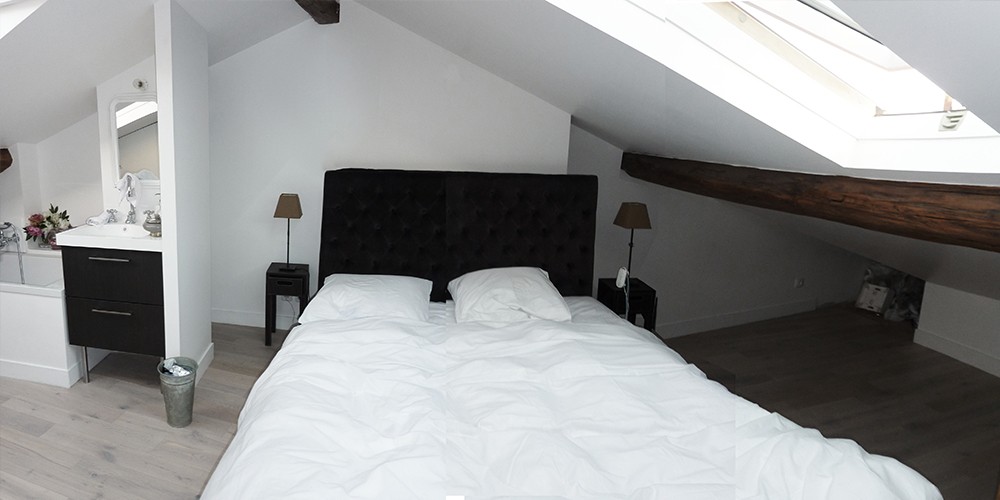L’étage sous comble est éclairé et dispose d’une vue imprenable sur les toits de Boulogne, grâce à de grandes ouvertures de part et d’autre du toit de l’immeuble.