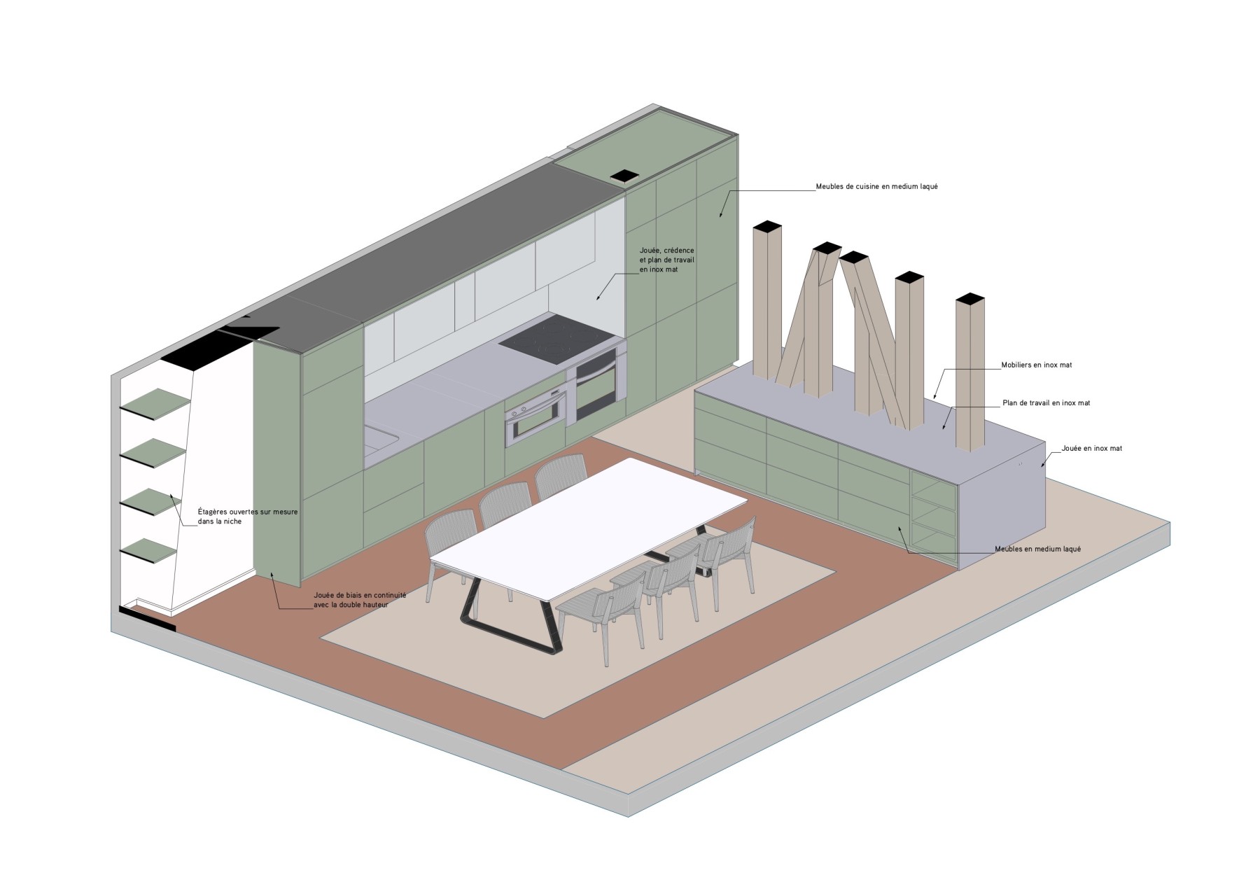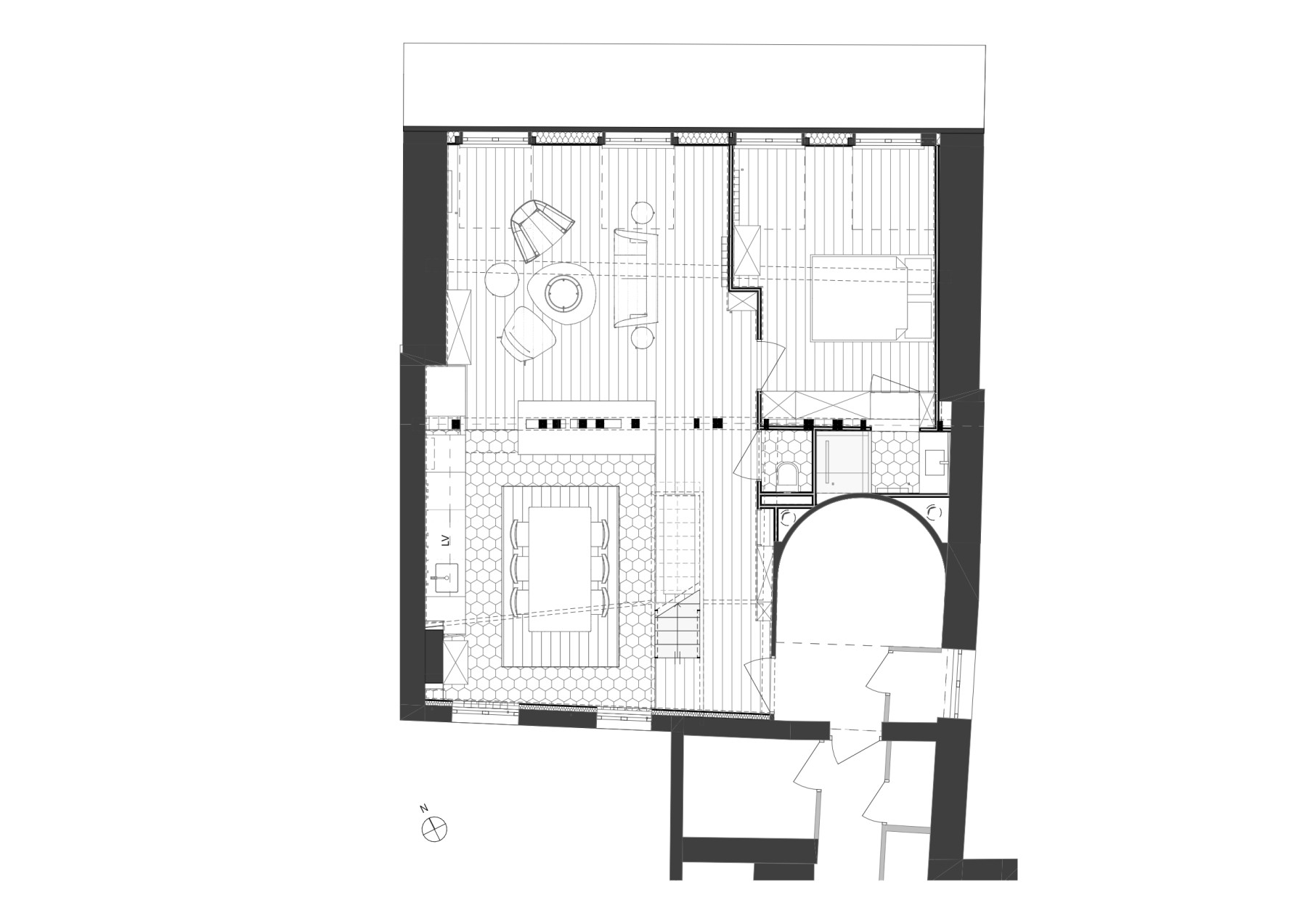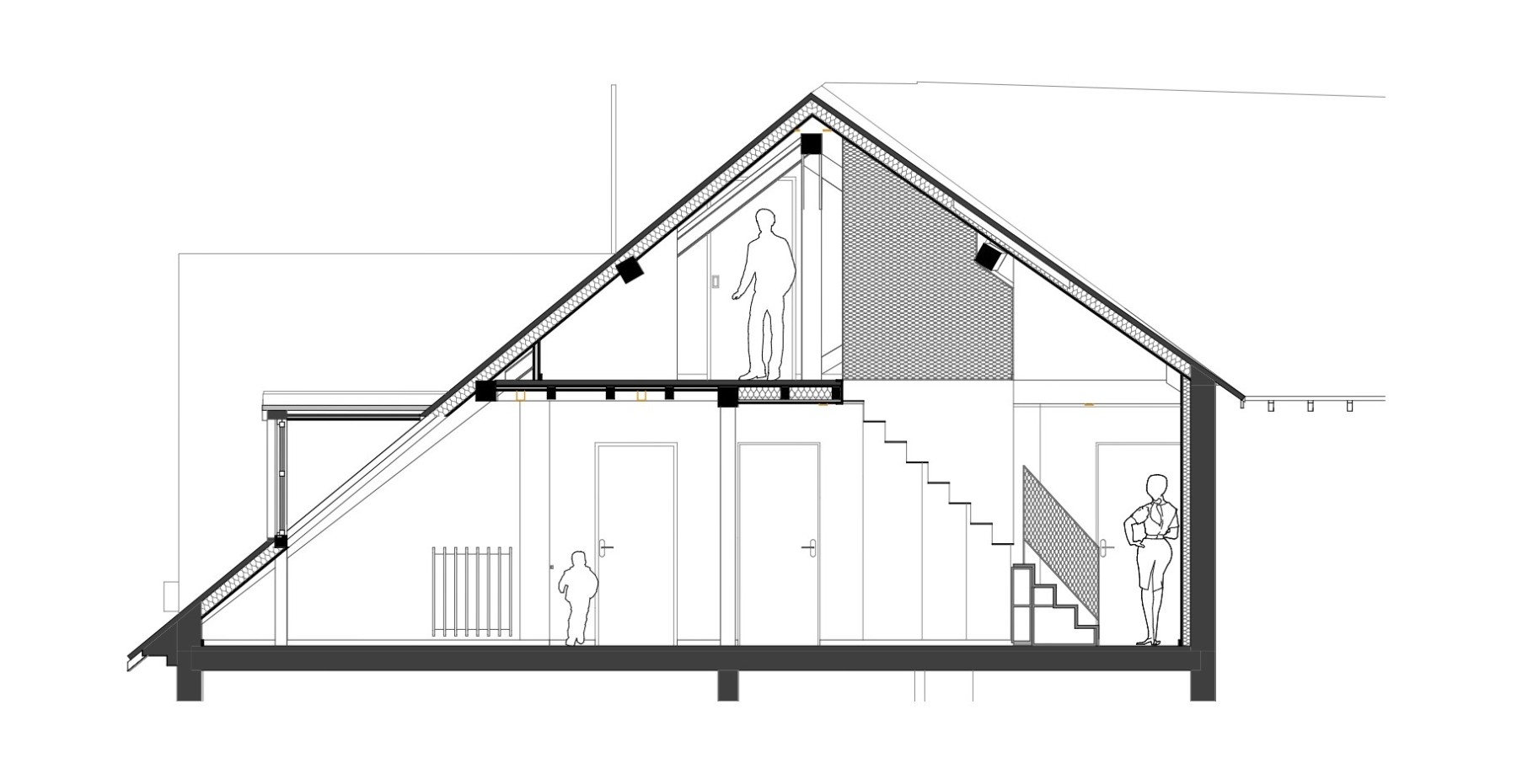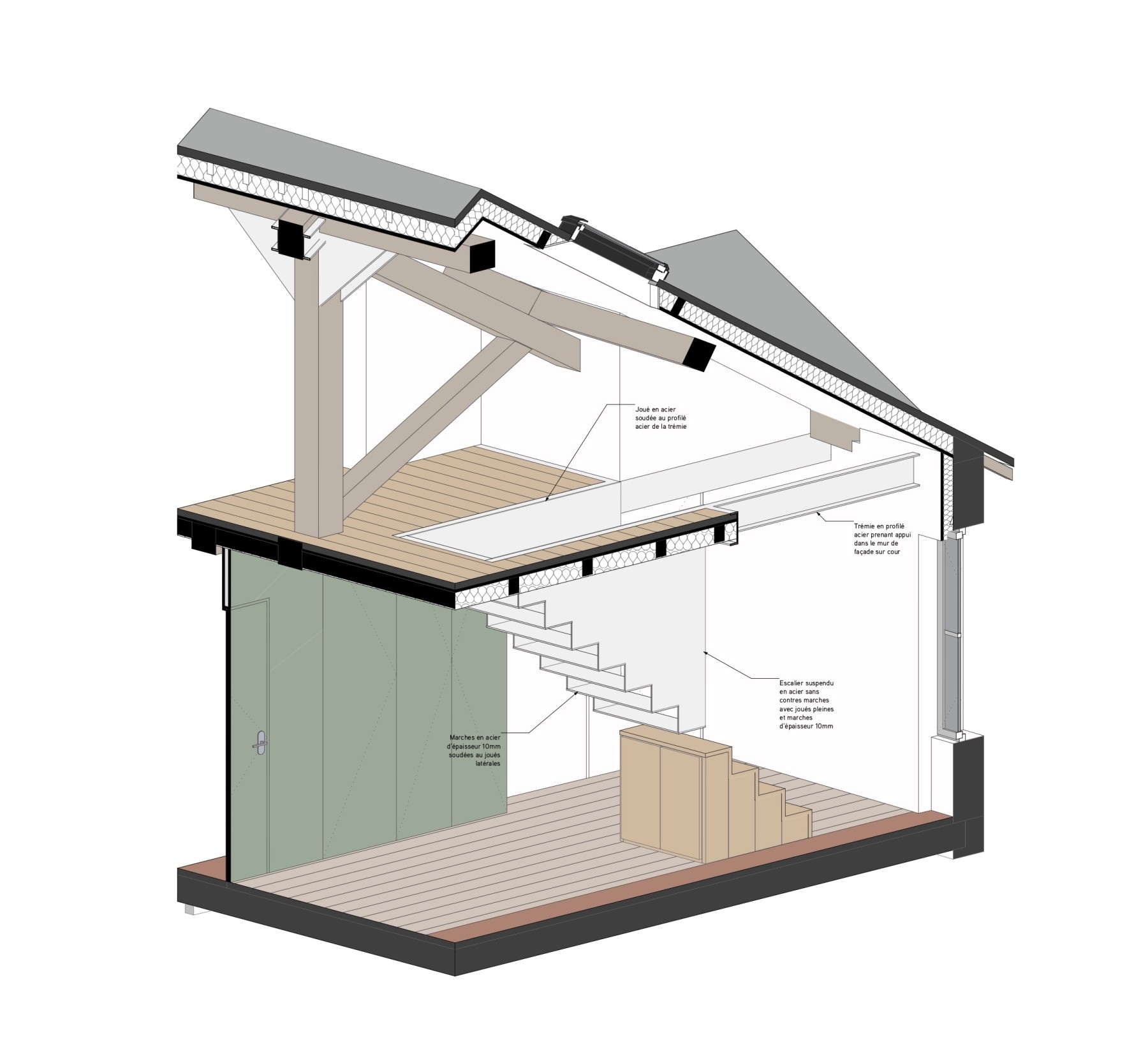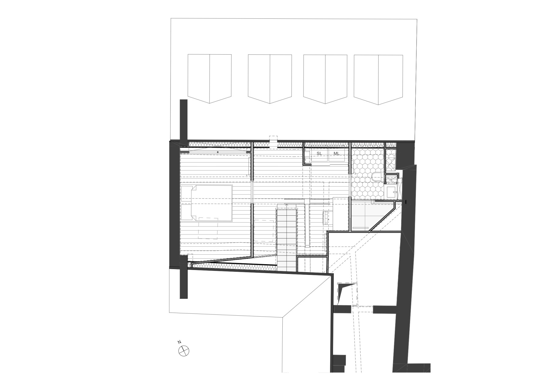 En regard de la Basilique Sainte-Clotilde du 7ème arrondissement de Paris, cet appartement en duplex constitue le dernier niveau d'un immeuble construit en 1850. Ce projet interroge la place actuelle du patrimoine architectural à bien des égards. Ceux de l'édifice transformé et de son inscription dans un quartier riche de monuments historiques. Plongeant d'un côté sur la basilique et de l'autre sur un immeuble particulier classé, ce duplex est issu de la réunion de trois chambres de bonnes et d'un comble inhabité. D'une surface totale de 70m2, sa conception soulève des problématiques d'aménagement au sein d'une architecture à la géométrie irrégulière et d'une sous-pente aiguë courant sur les deux niveaux d'habitation.