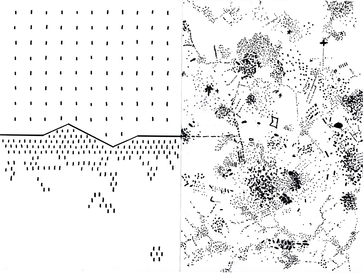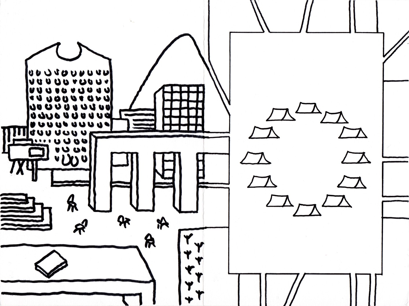 Dessins réalisés en cadavre exquis avec d’autres architectes, sur les thèmes de la Place et de la Limite à l’ère de l’anthropocène.