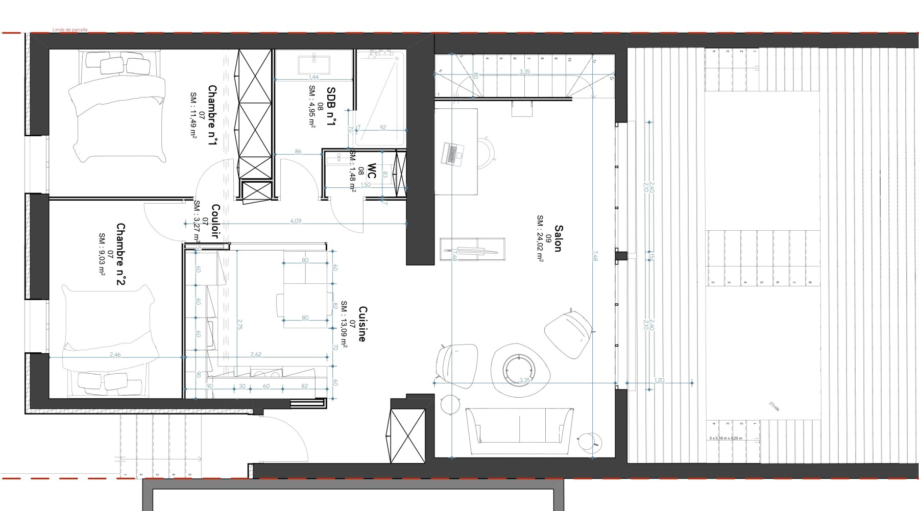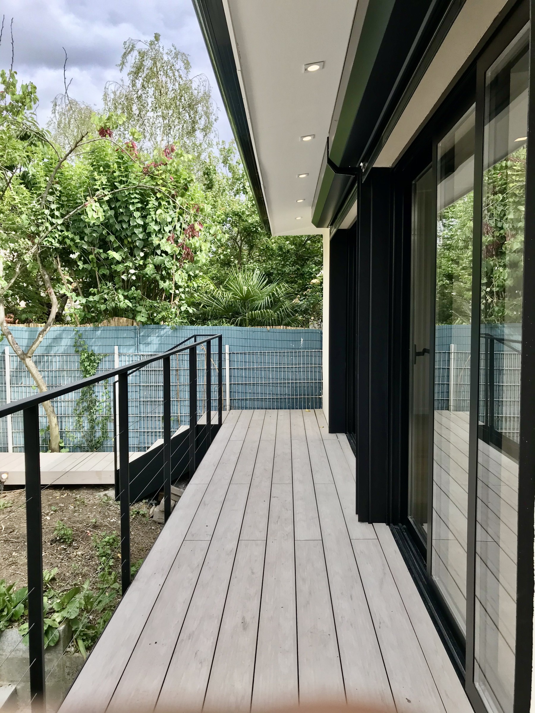La question des sols est centrale. Elle intervient en permanence tout au long du projet, à la fois dans les dispositifs structurels et dans l'aspect environnemental avec l'infiltration des eaux pluviales en pleine terre. Le jardin n'est pas seulement un morceau de terrain laissé libre. Il permet, en tant qu'ouvrage technique, d'assurer une symbiose éco-responsable de la maison avec son environnement. La terrasse en platelage sur lambourdes bois assure cette infiltration et la récupération des eaux pluviales par un dispositif de puisard muni d'une pompe de relevage permet un arrosage automatique.