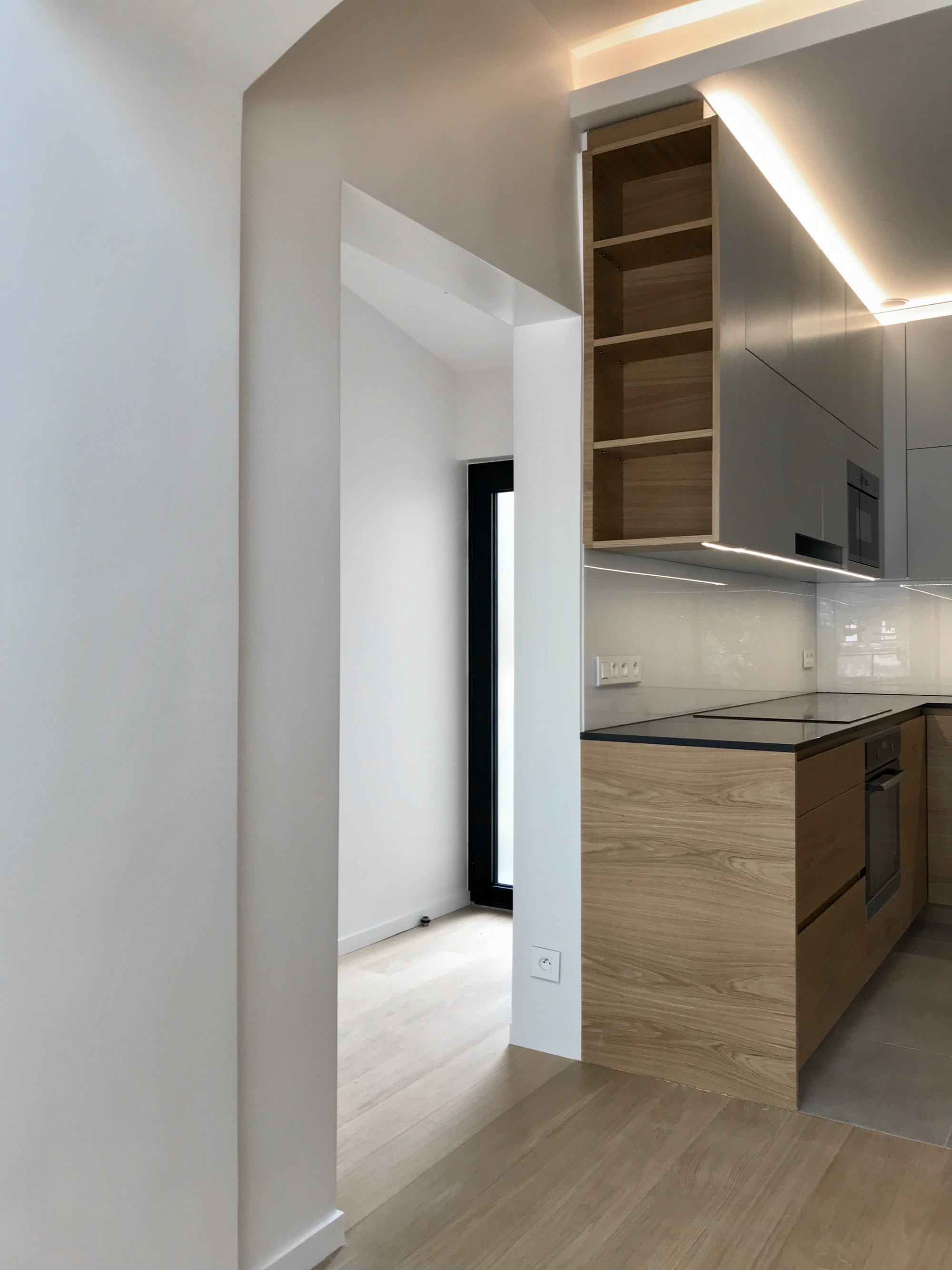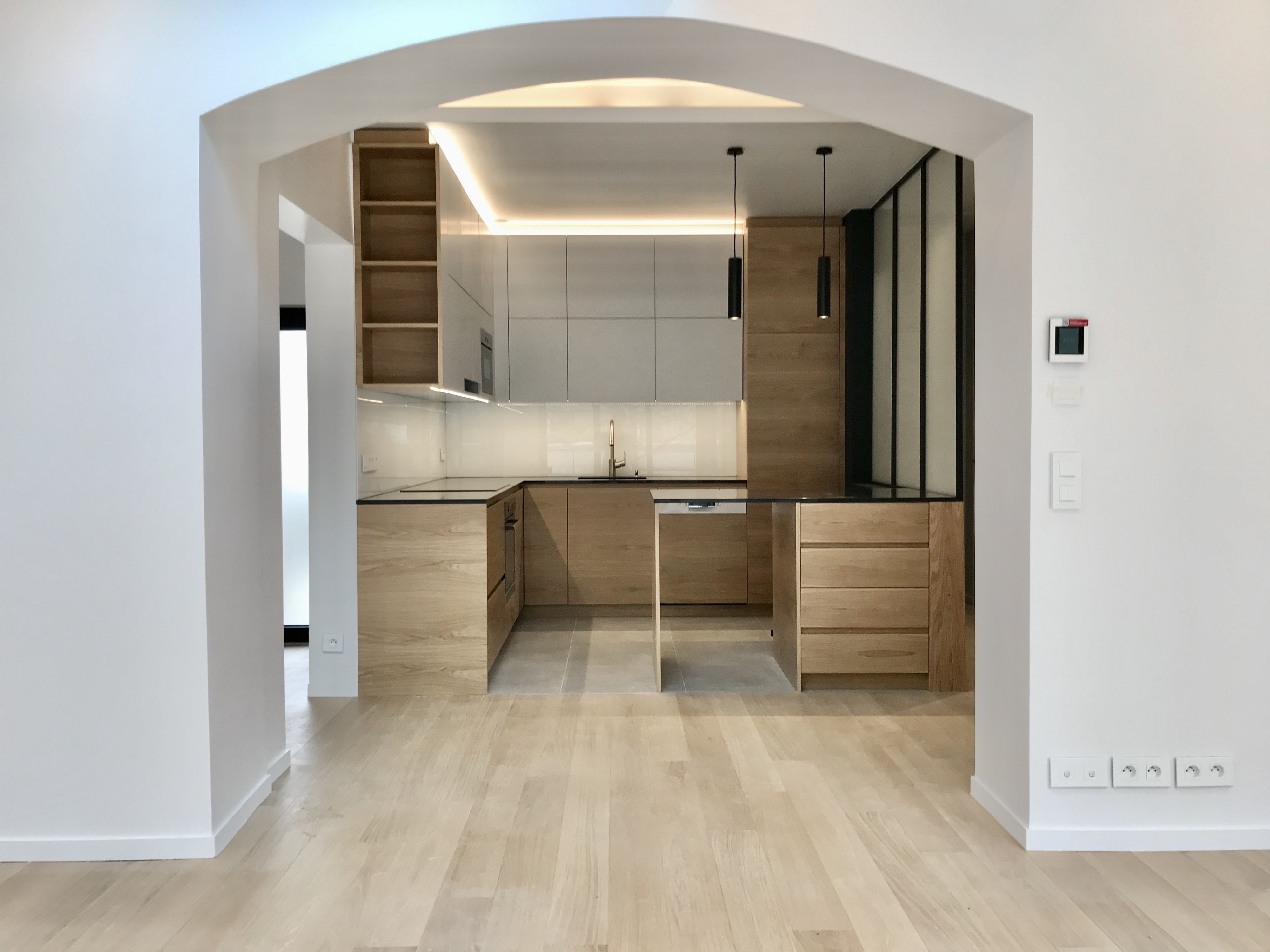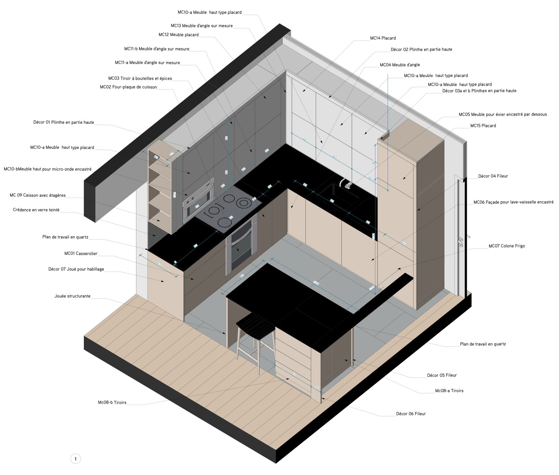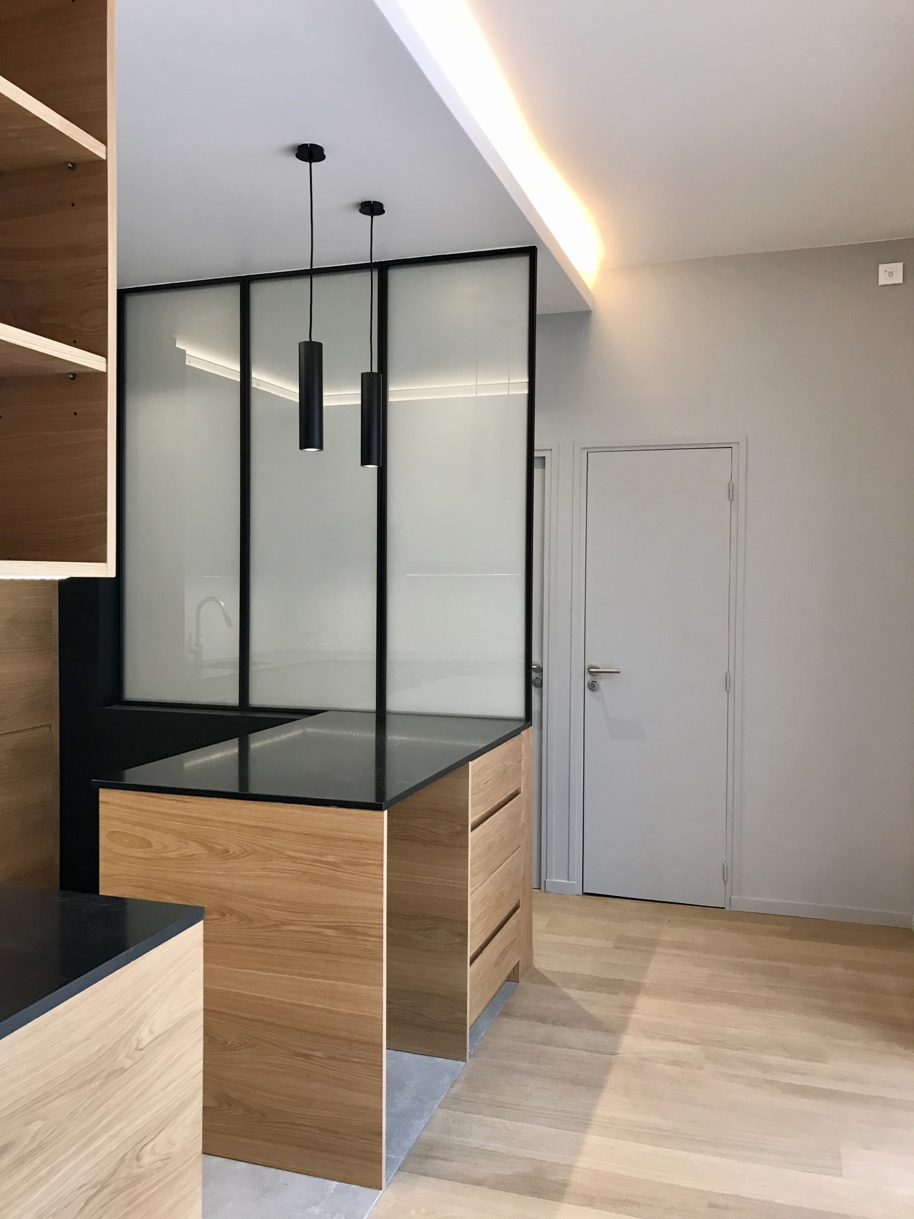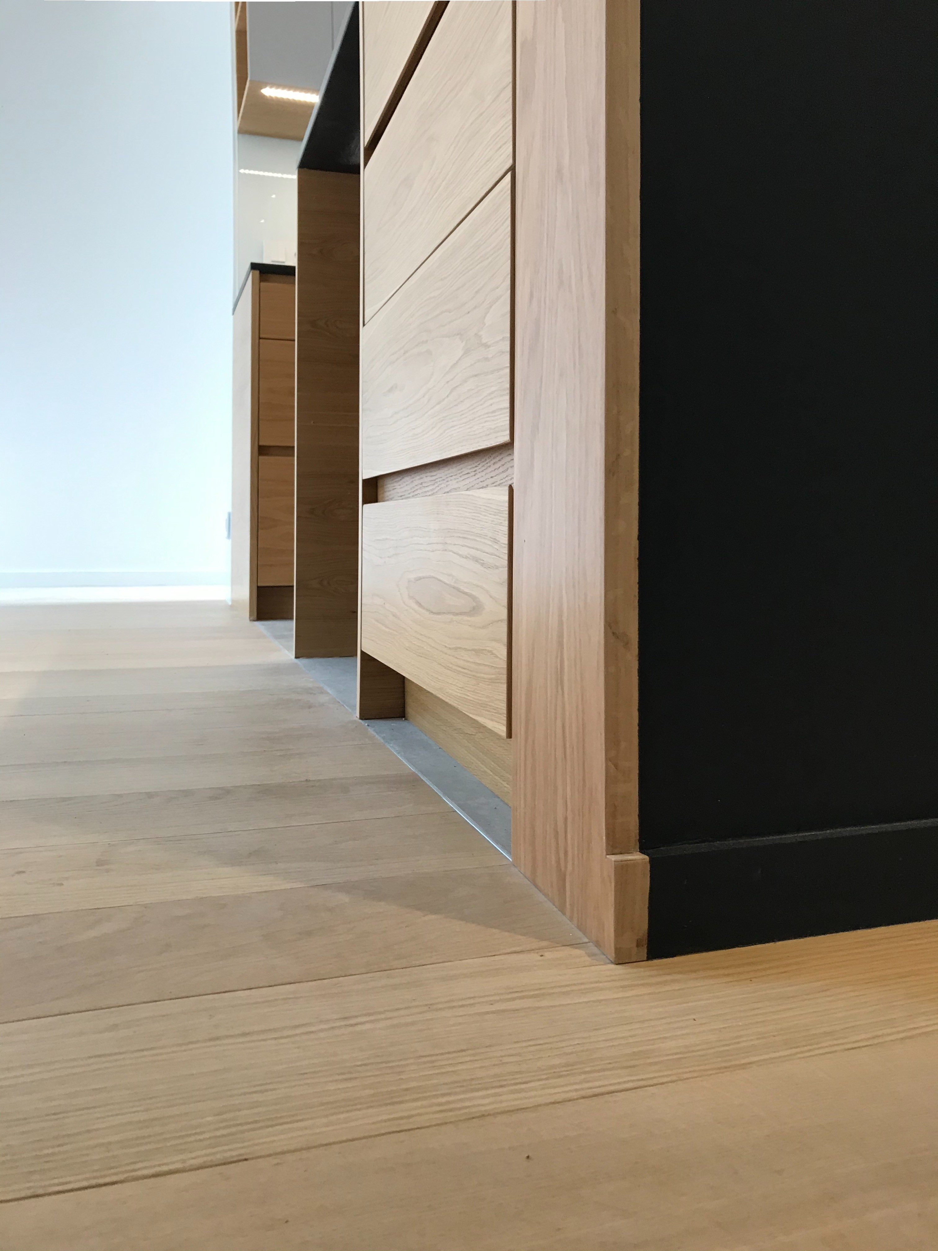 Prolonger le sol sur les surfaces verticales, joindre le mobilier et les parcours par une correspondance du matériau chêne, aligner les niveaux et les parois.
