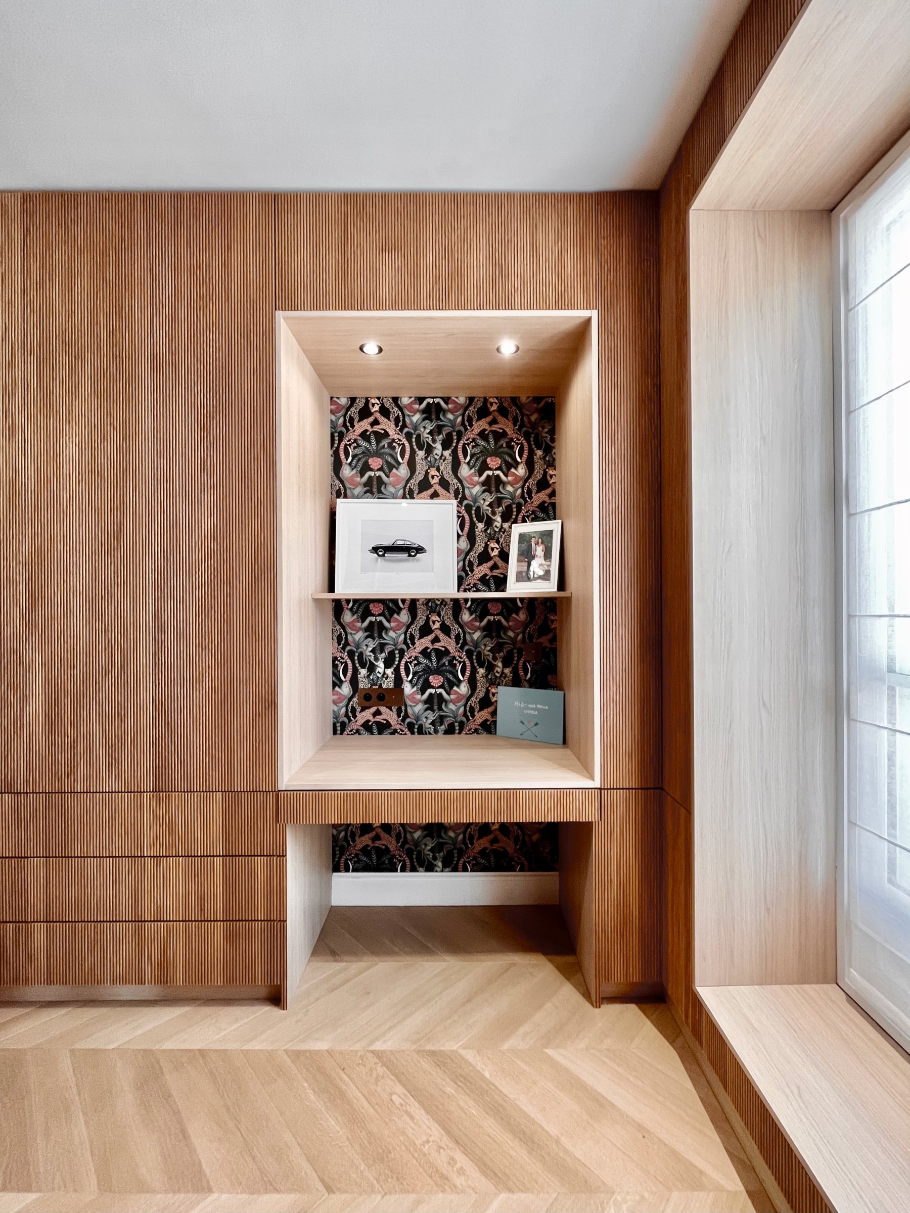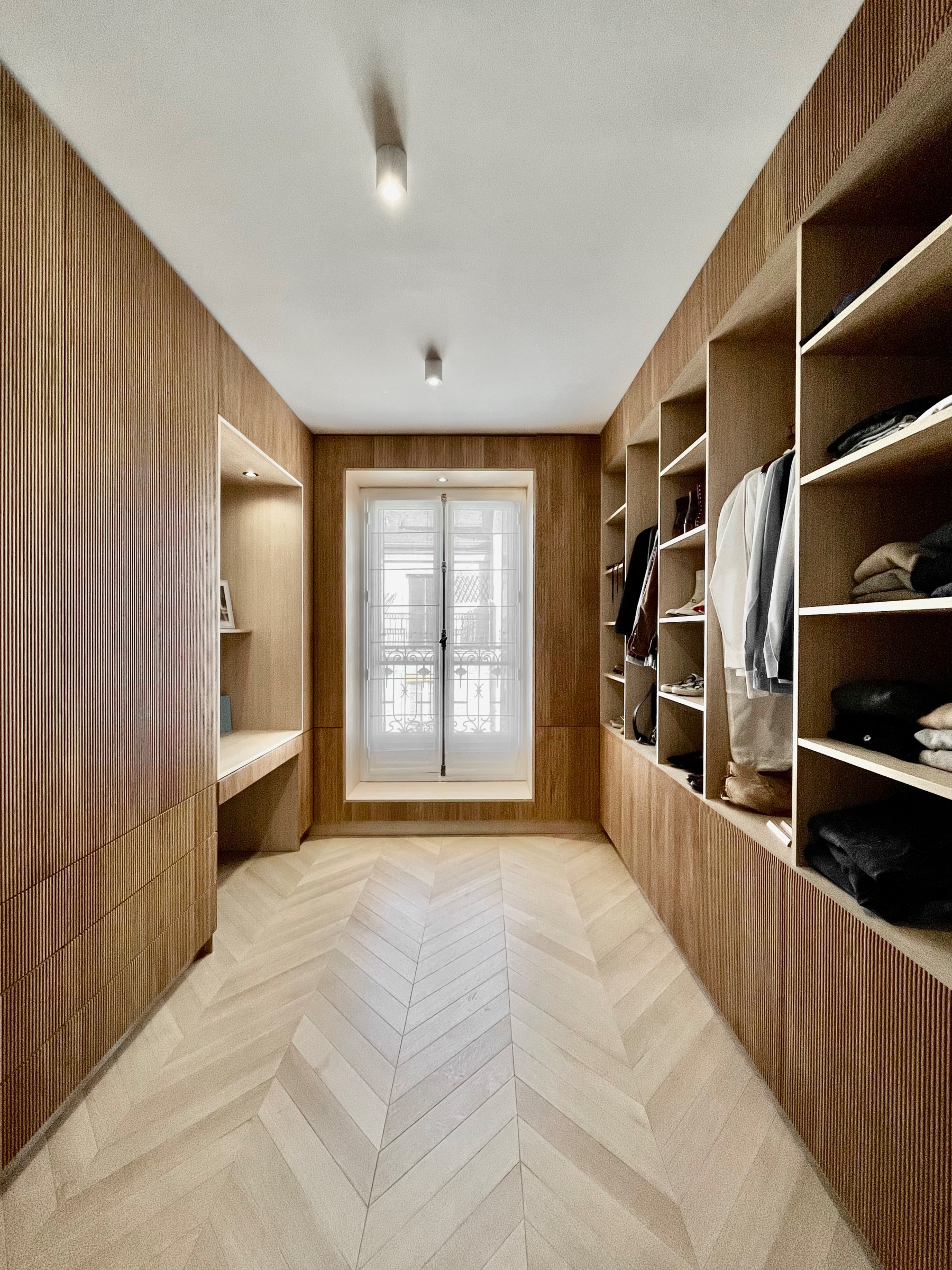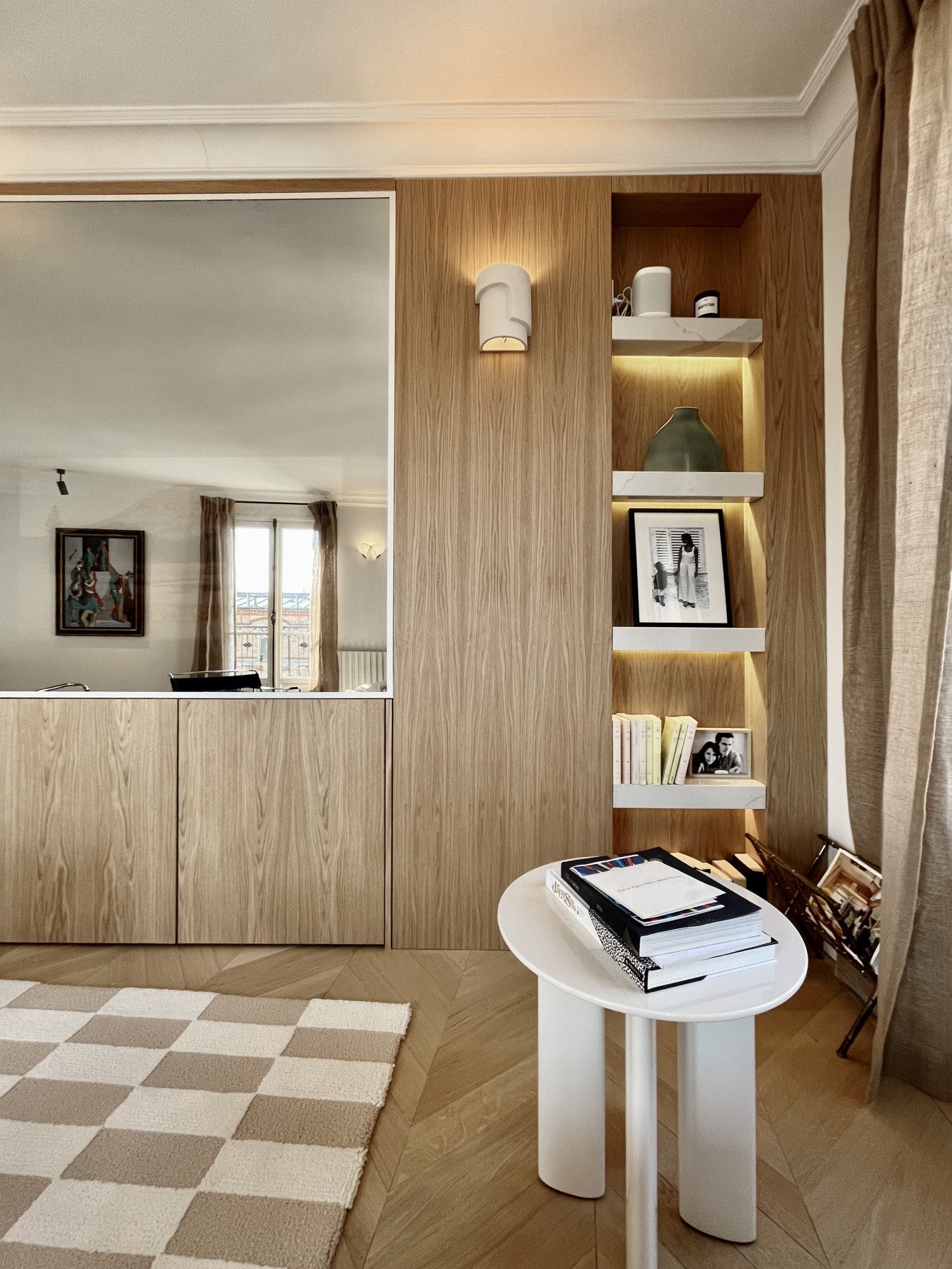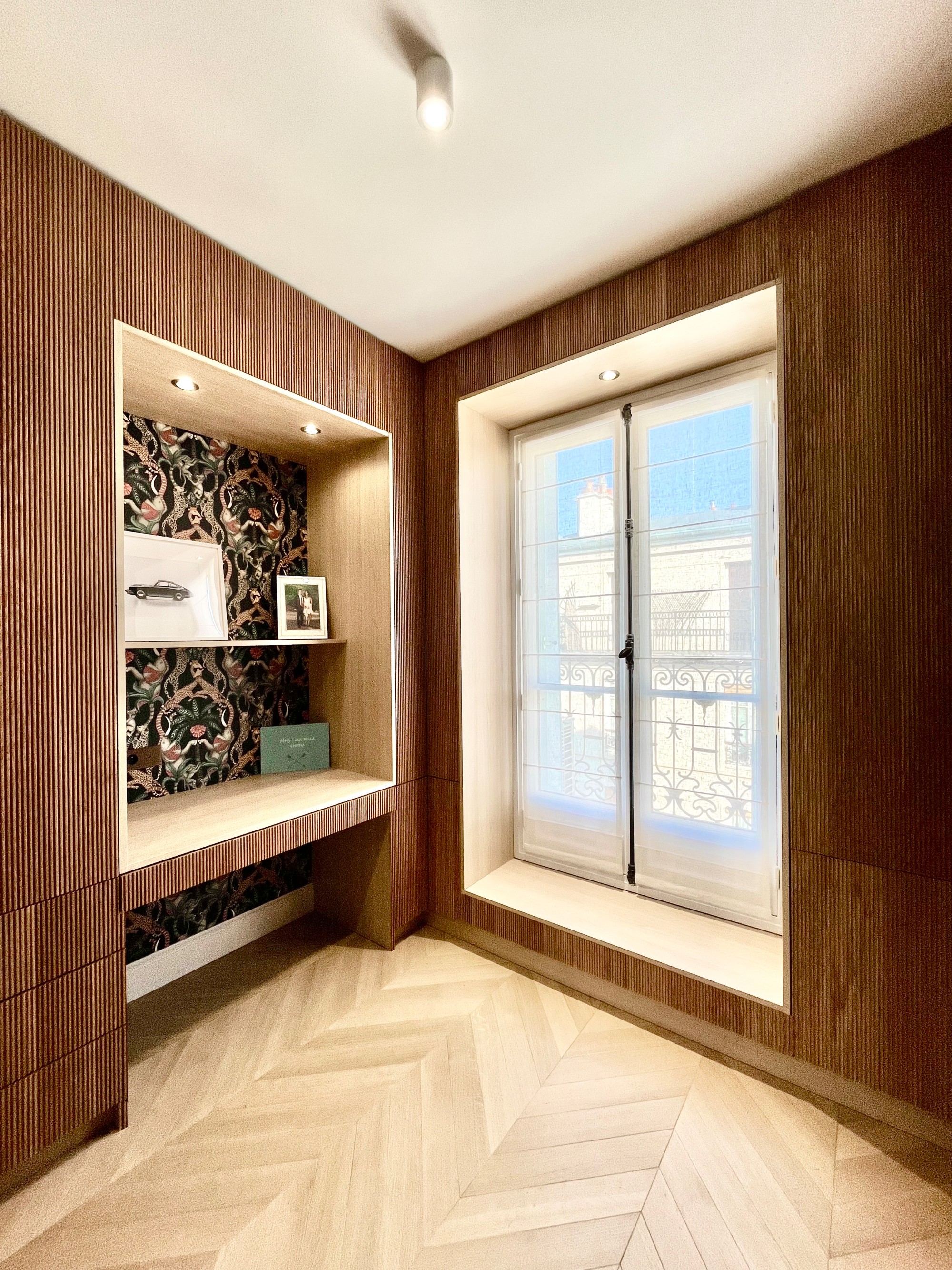 Sur un même palier d'immeuble haussmanien du 5e arrondissement de Paris, deux appartements sont réunis et réhabilités sur une surface de 117m². Dans un style revisité des années 1970, l'architecte et le maître d'ouvrage recherche l'effet des matières sur les formes classiques de l'architecture. Des façades en bois fraisé aux veinages des matériaux, l'appartement suit le fil d'une restructuration et d'une partition autour du grand salon.