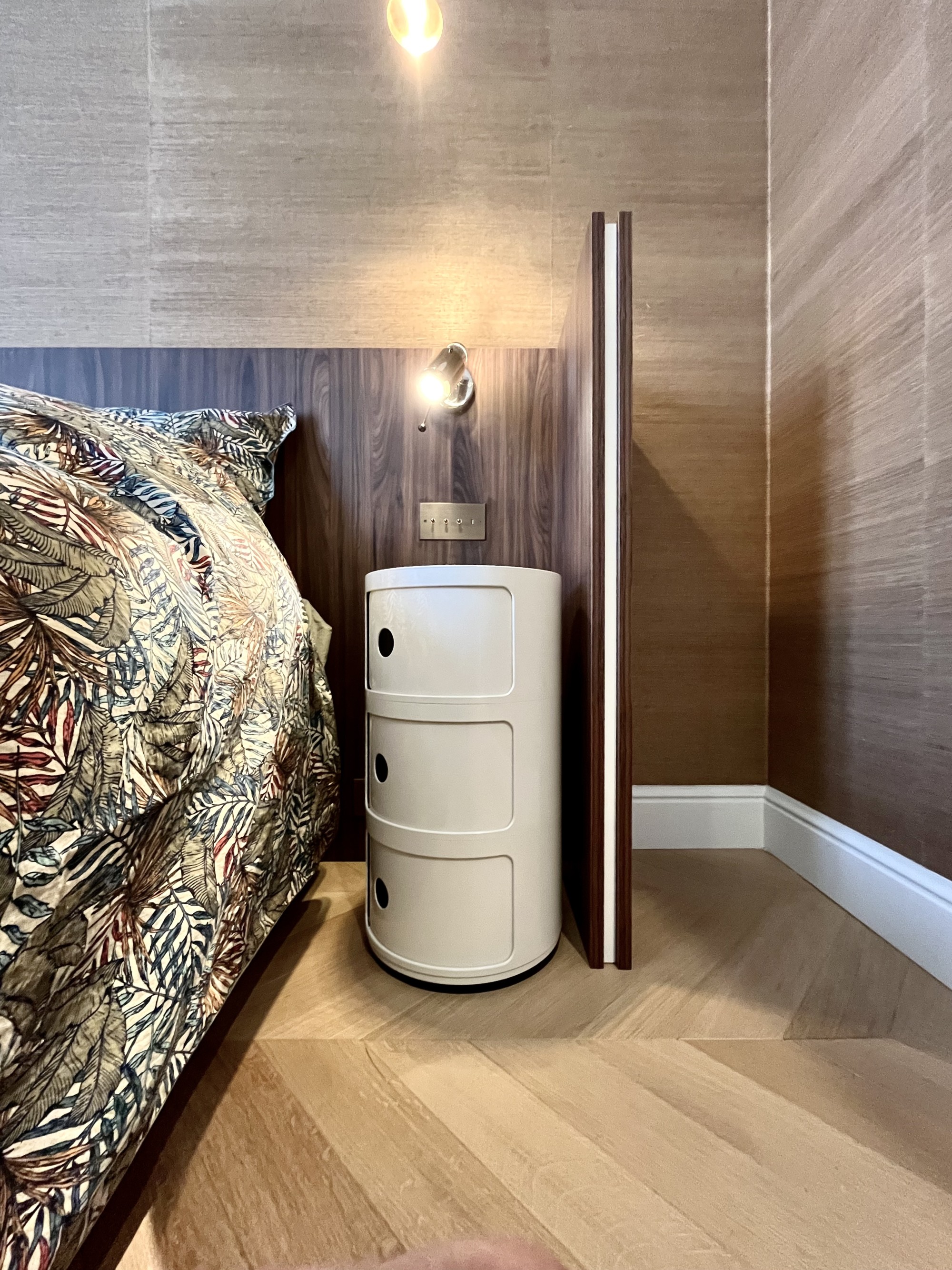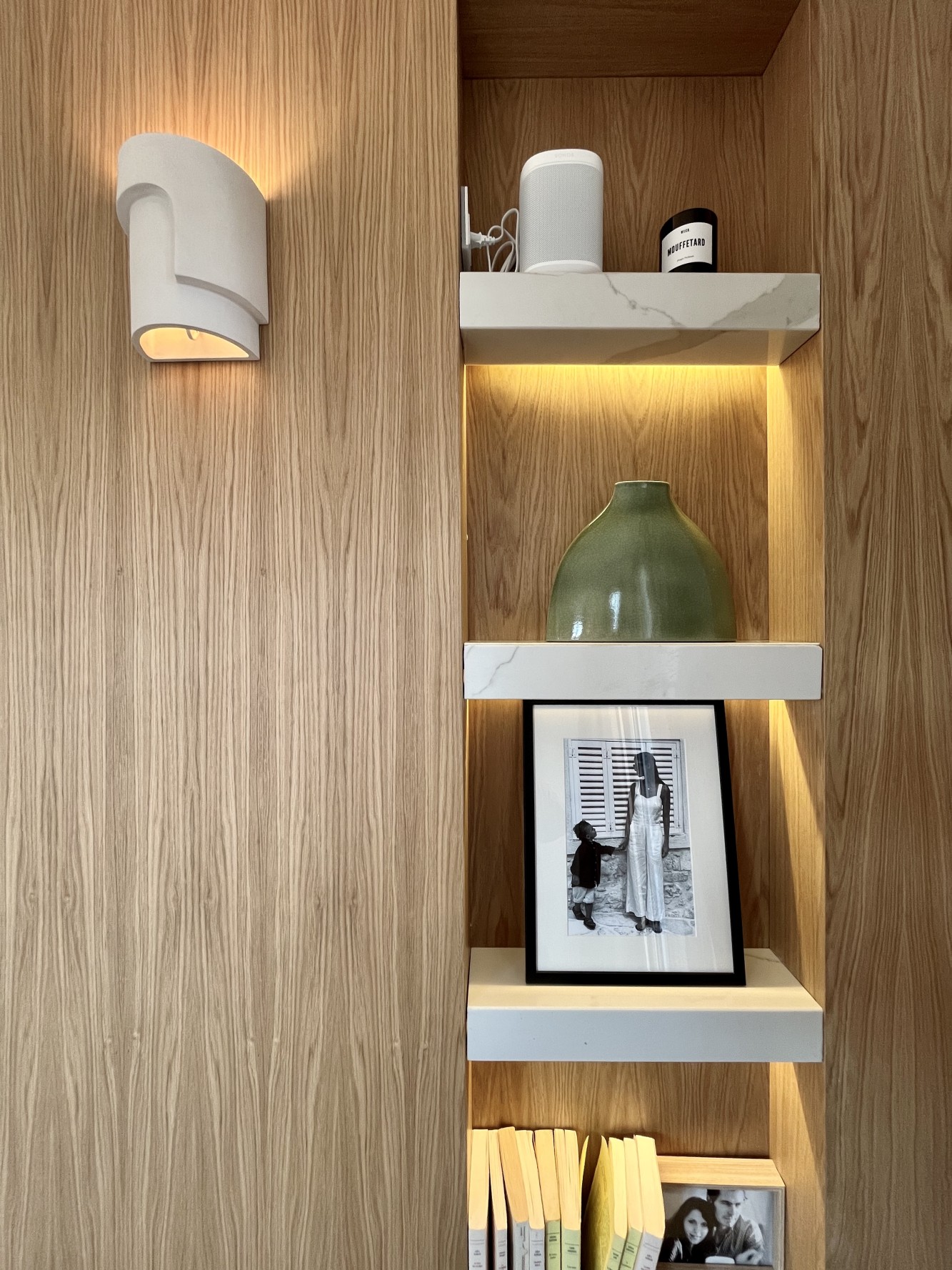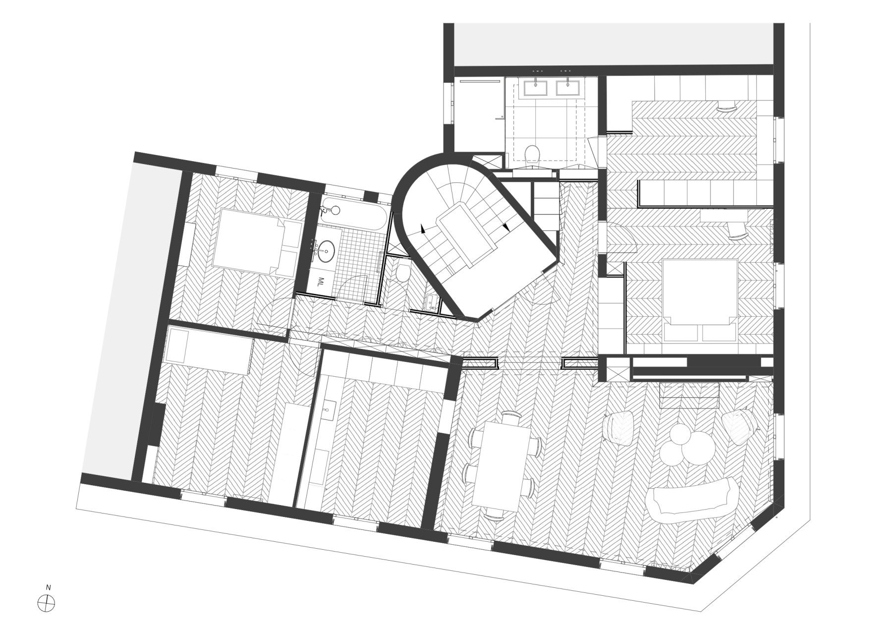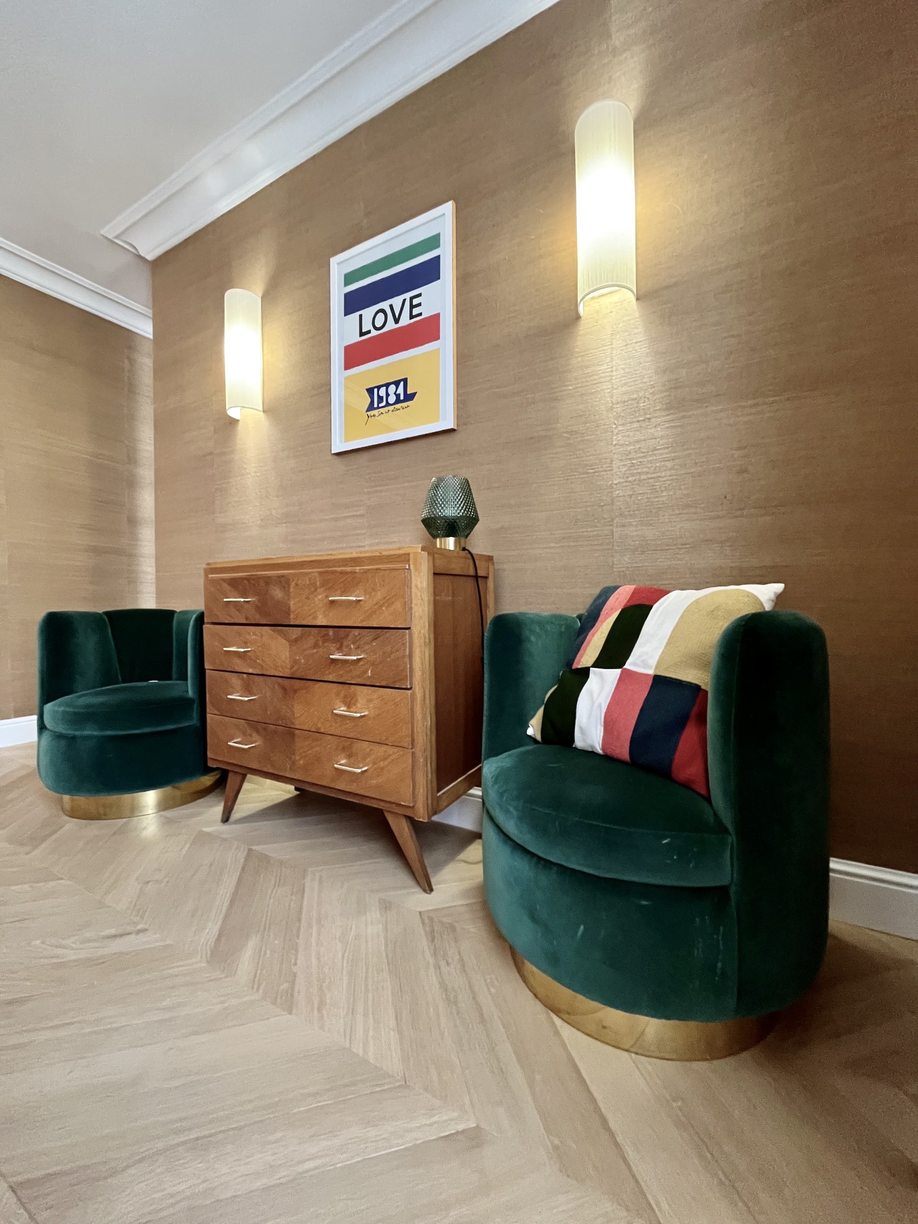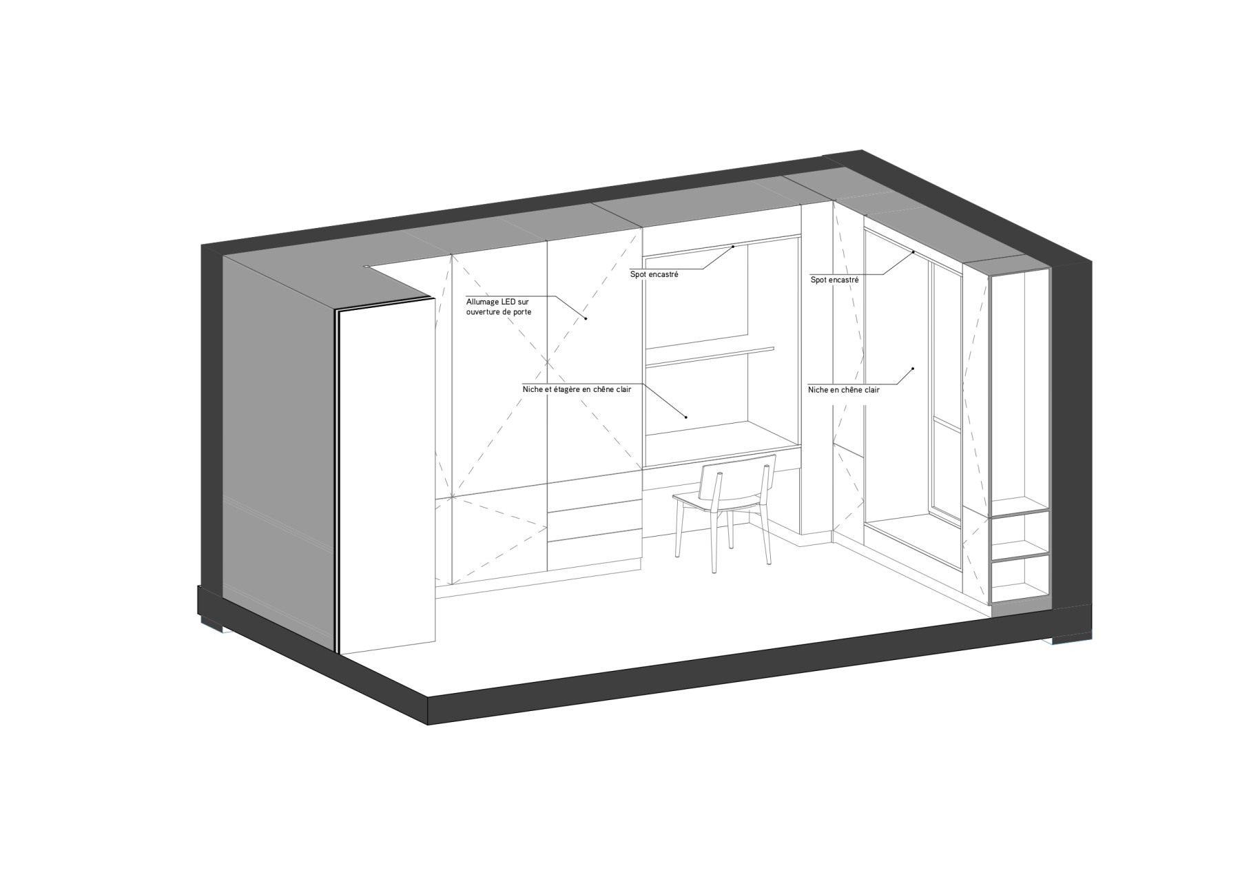 Sur un même palier d'immeuble haussmanien du 5e arrondissement de Paris, deux appartements sont réunis et réhabilités sur une surface de 117m². Dans un style revisité des années 1970, l'architecte et le maître d'ouvrage recherche l'effet des matières sur les formes classiques de l'architecture. Des façades en bois fraisé aux veinages des matériaux, l'appartement suit le fil d'une restructuration et d'une partition autour du grand salon.