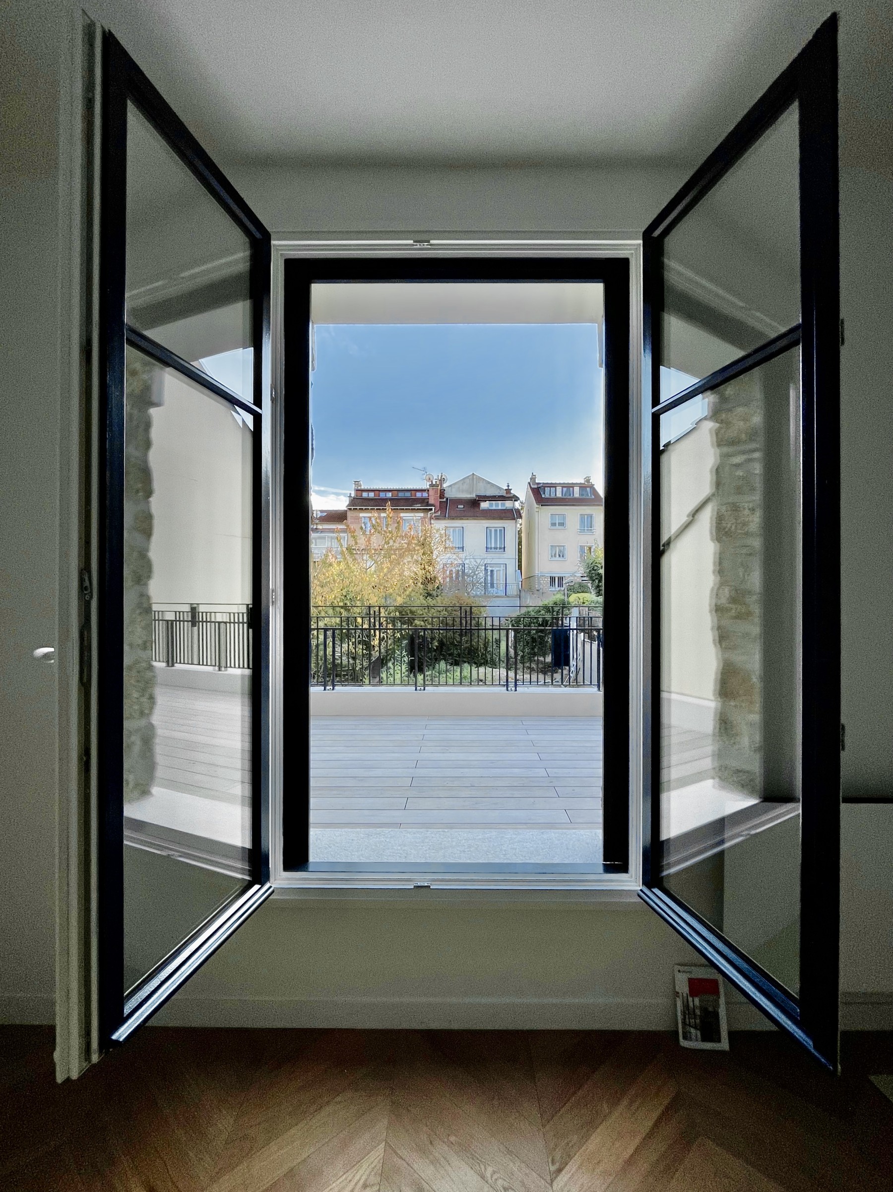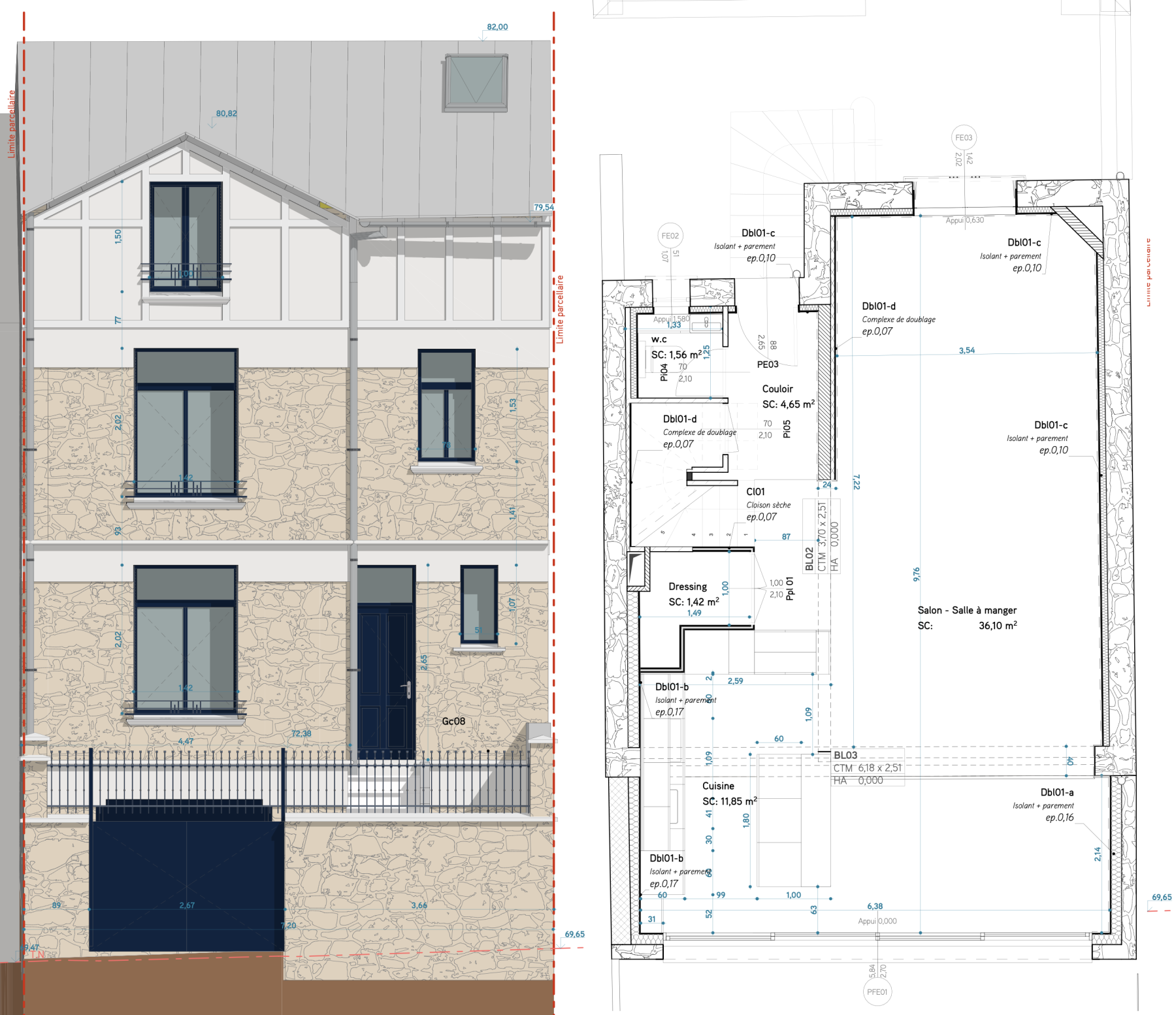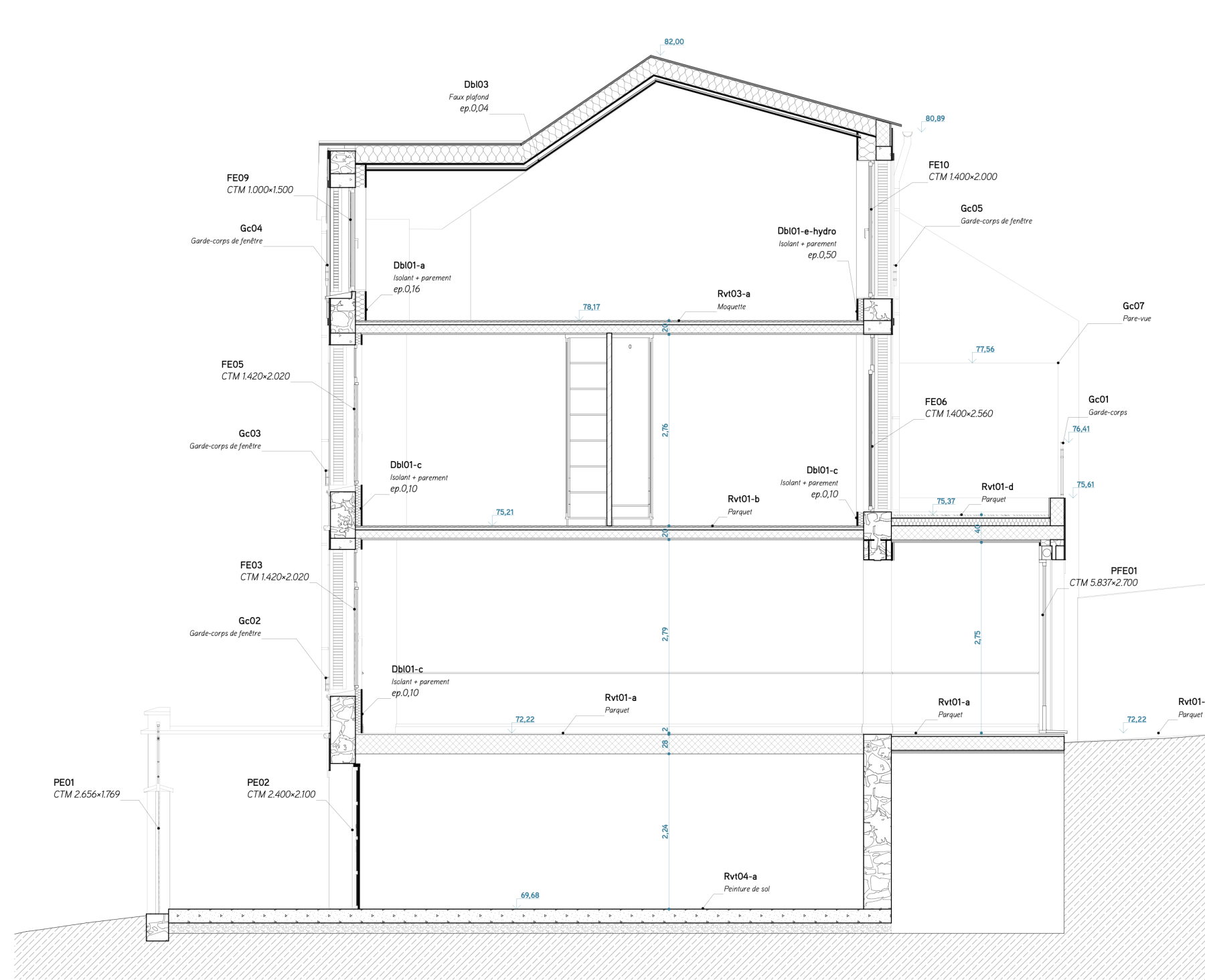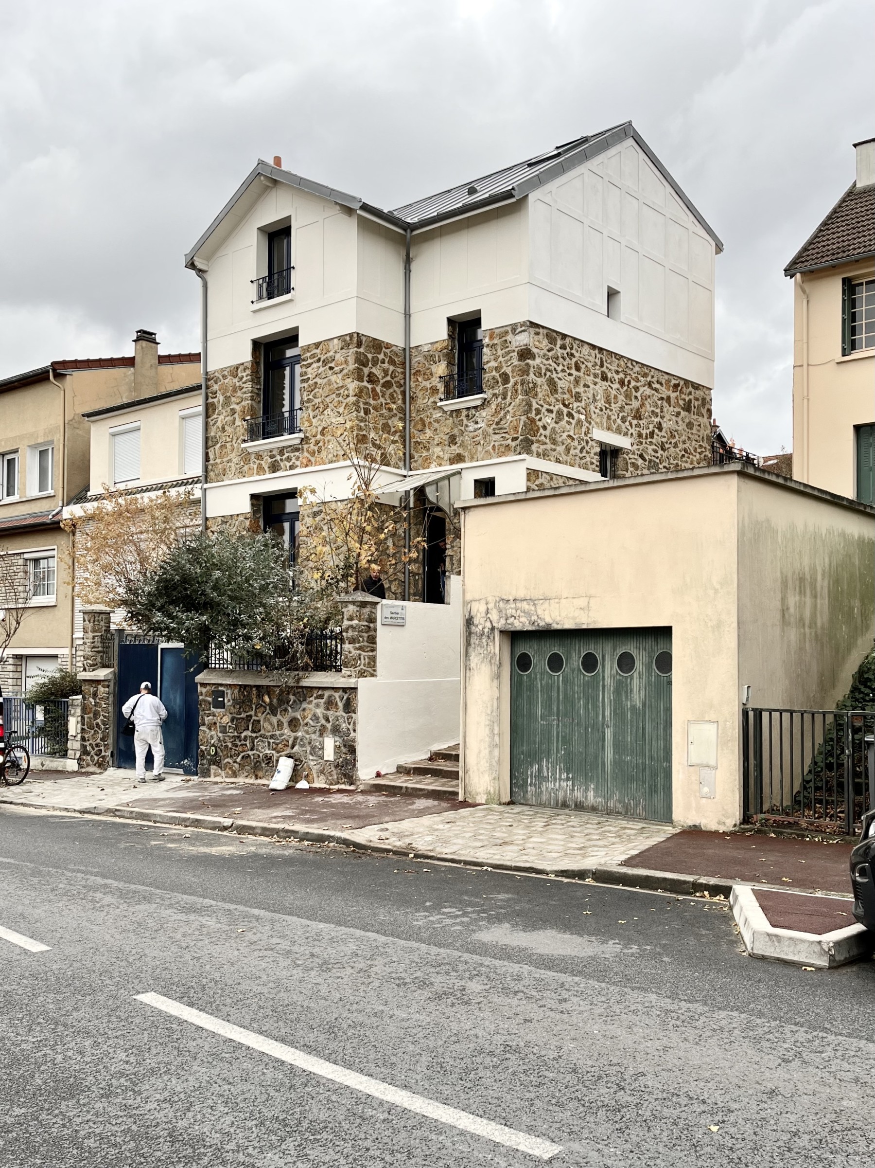 La surélévation des combles existants permet d'accroître la hauteur sous-plafond d'un mètre et leur confère une pleine et entière habitabilité, ouvrant ainsi des vues sur le jardin et de l'autre côté sur le grand paysage urbain, jusqu'à la défense au loin. La matérialité des façades, faites de meulières et de faux-colombages, est prononcée dans la surélévation et l'extension sur jardin, conclusion d'une réflexion croisée entre un caractère patrimoniale et des usages contemporains.