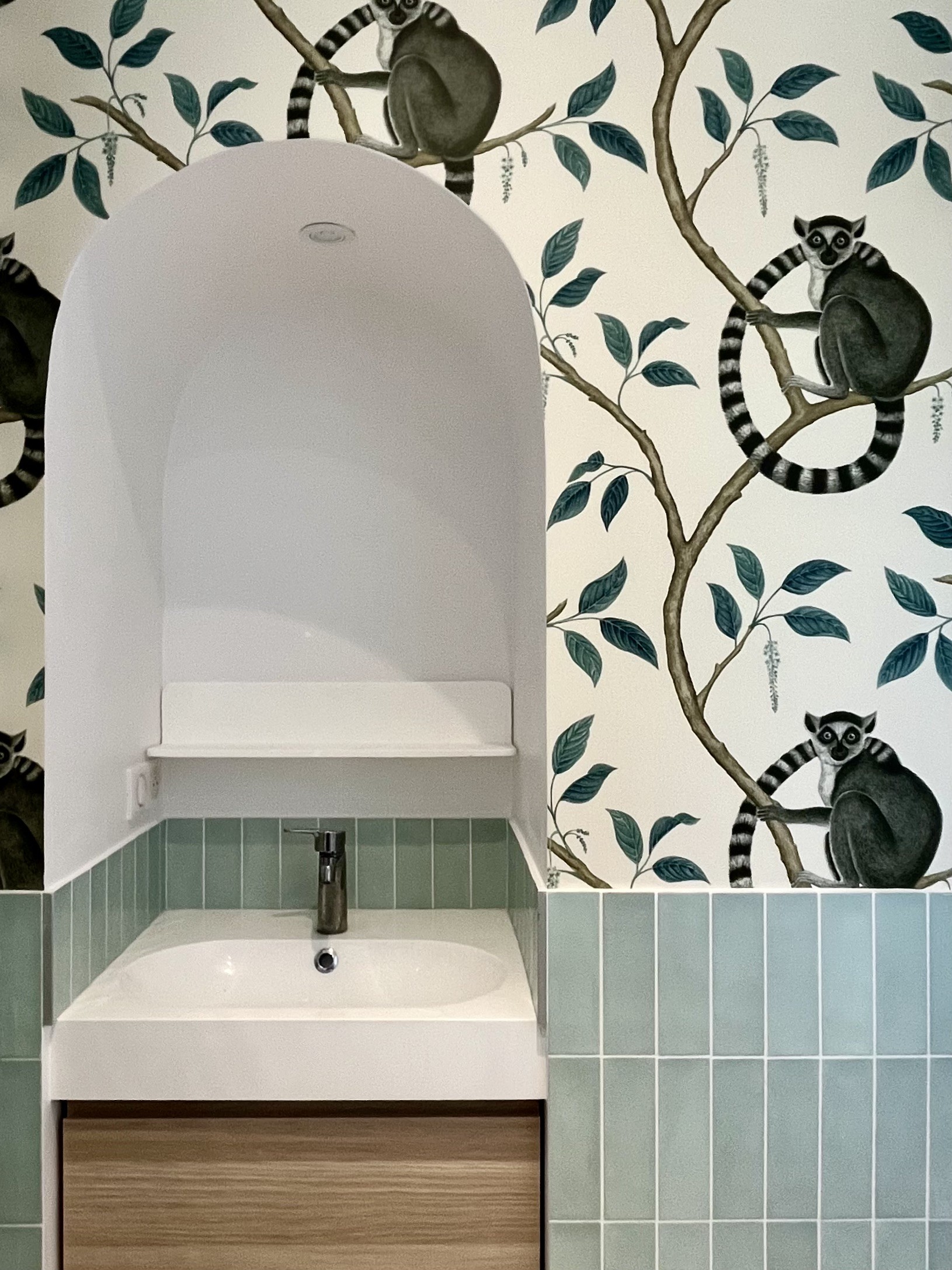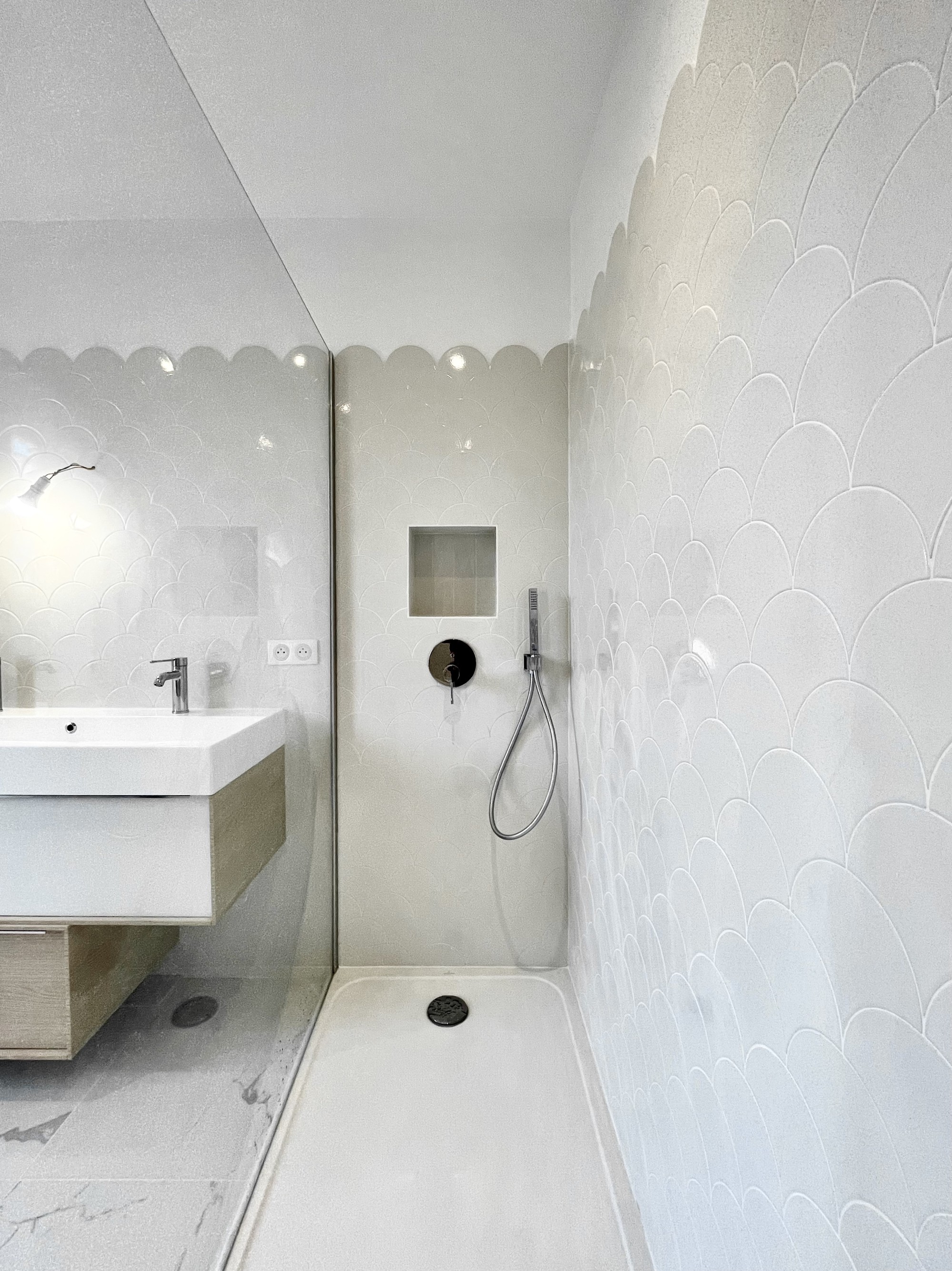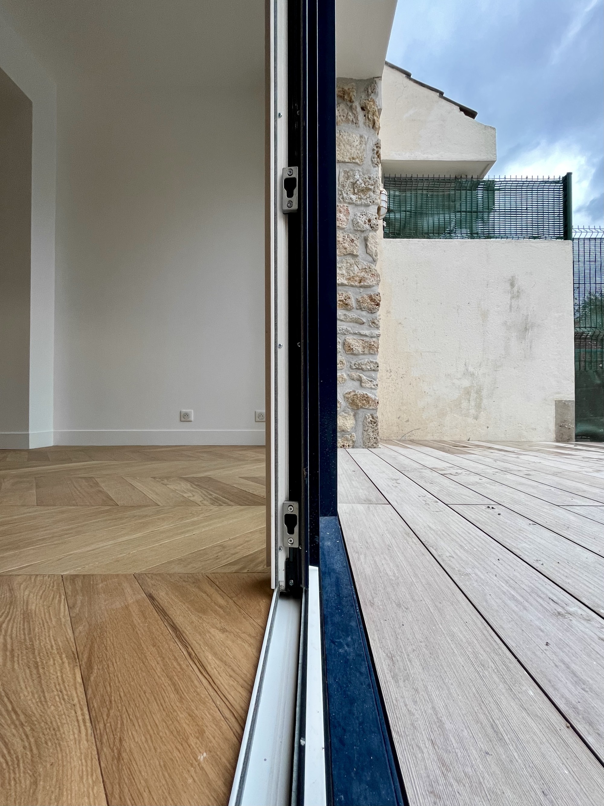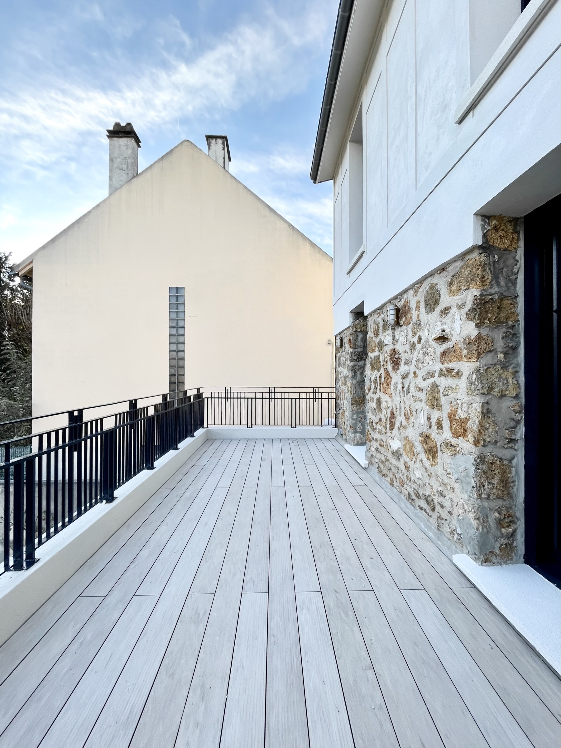 La surélévation des combles existants permet d'accroître la hauteur sous-plafond d'un mètre et leur confère une pleine et entière habitabilité, ouvrant ainsi des vues sur le jardin et de l'autre côté sur le grand paysage urbain, jusqu'à la défense au loin. La matérialité des façades, faites de meulières et de faux-colombages, est prononcée dans la surélévation et l'extension sur jardin, conclusion d'une réflexion croisée entre un caractère patrimoniale et des usages contemporains.