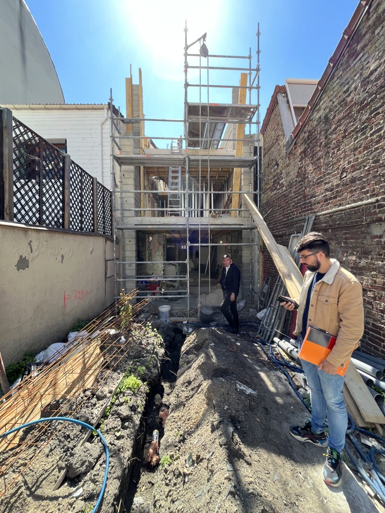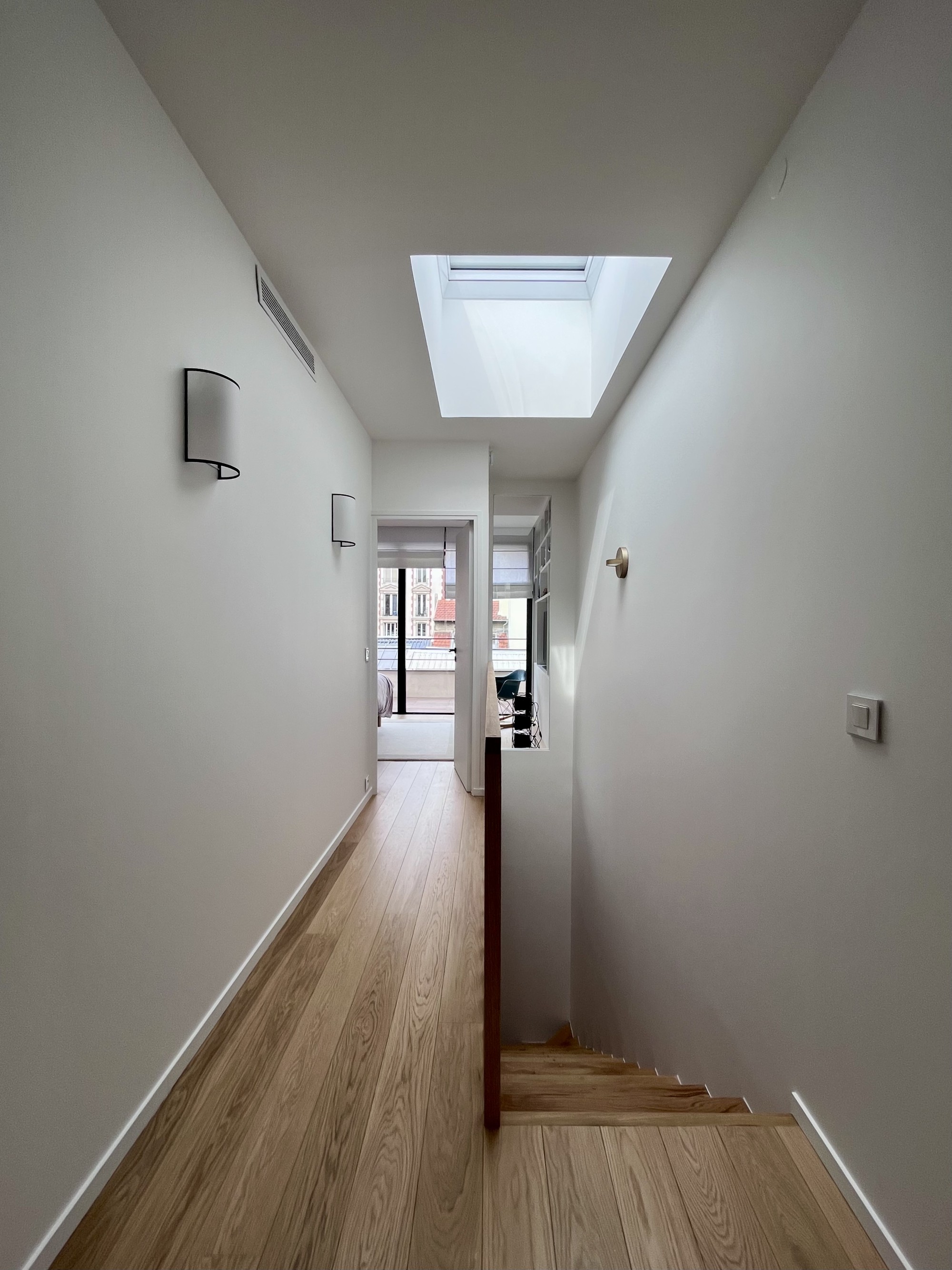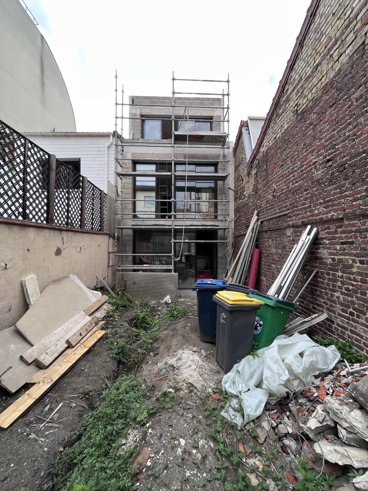 Disposée en longueur sur une parcelle étroite, cette maison de ville rénovée n'a gardé que ses murs de façade pour s'étendre sur le jardin et gagner un niveau supplémentaire. Située dans un tissu foncier découpé en bandes, la problématique de la profondeur bâtie et de la lumière est omniprésente. Les trois niveaux sont desservis par un escalier ouvert qui distribue l'édifice en son centre et articule de manière choisie les pièces sur rue et sur jardin. La préservation de la structure en pierres de taille, l'utilisation d'une ossature bois pour les planchers intermédiaires et une toiture mixte en bois-béton permet de préserver la légèreté de l'édifice et éviter les reprises en sous-oeuvre. En fond de parcelle, une cuisine d'été ouverte sur l'extérieur ainsi que des terrasses situées à plusieurs étages permettent de vivre en ville dense à ciel ouvert.