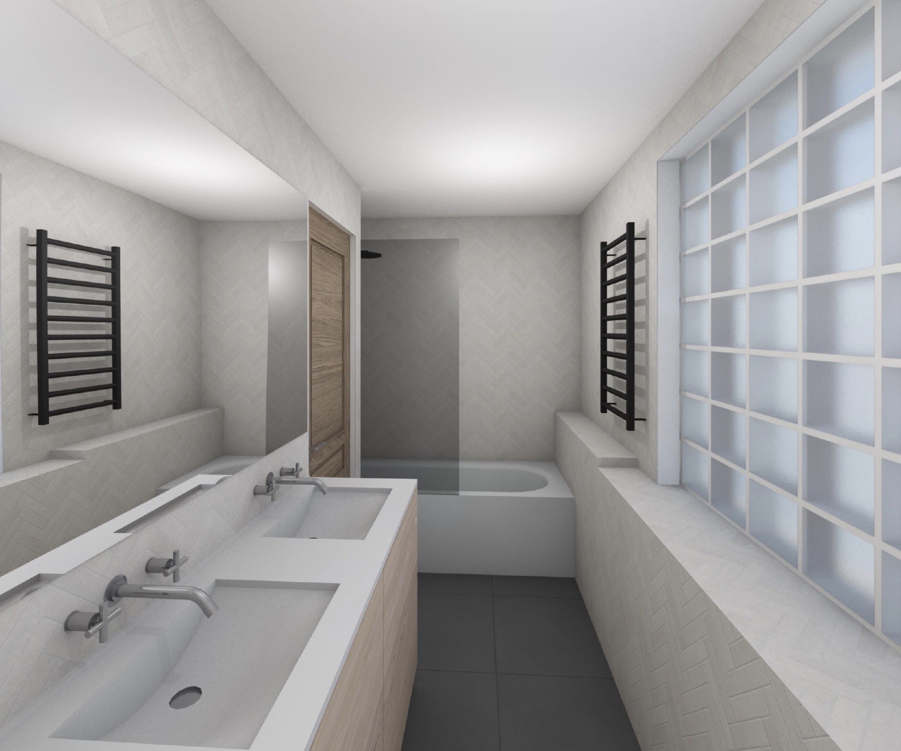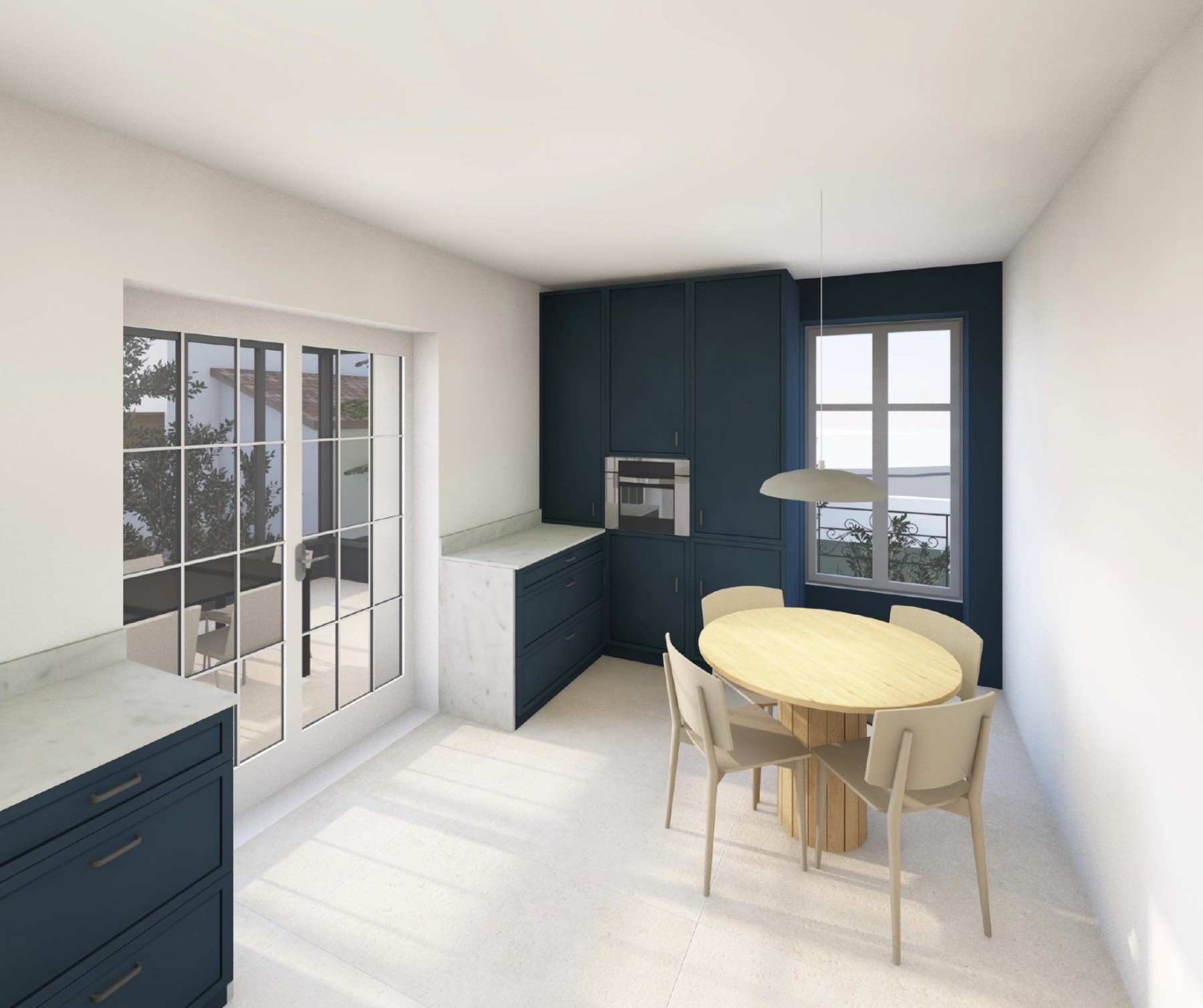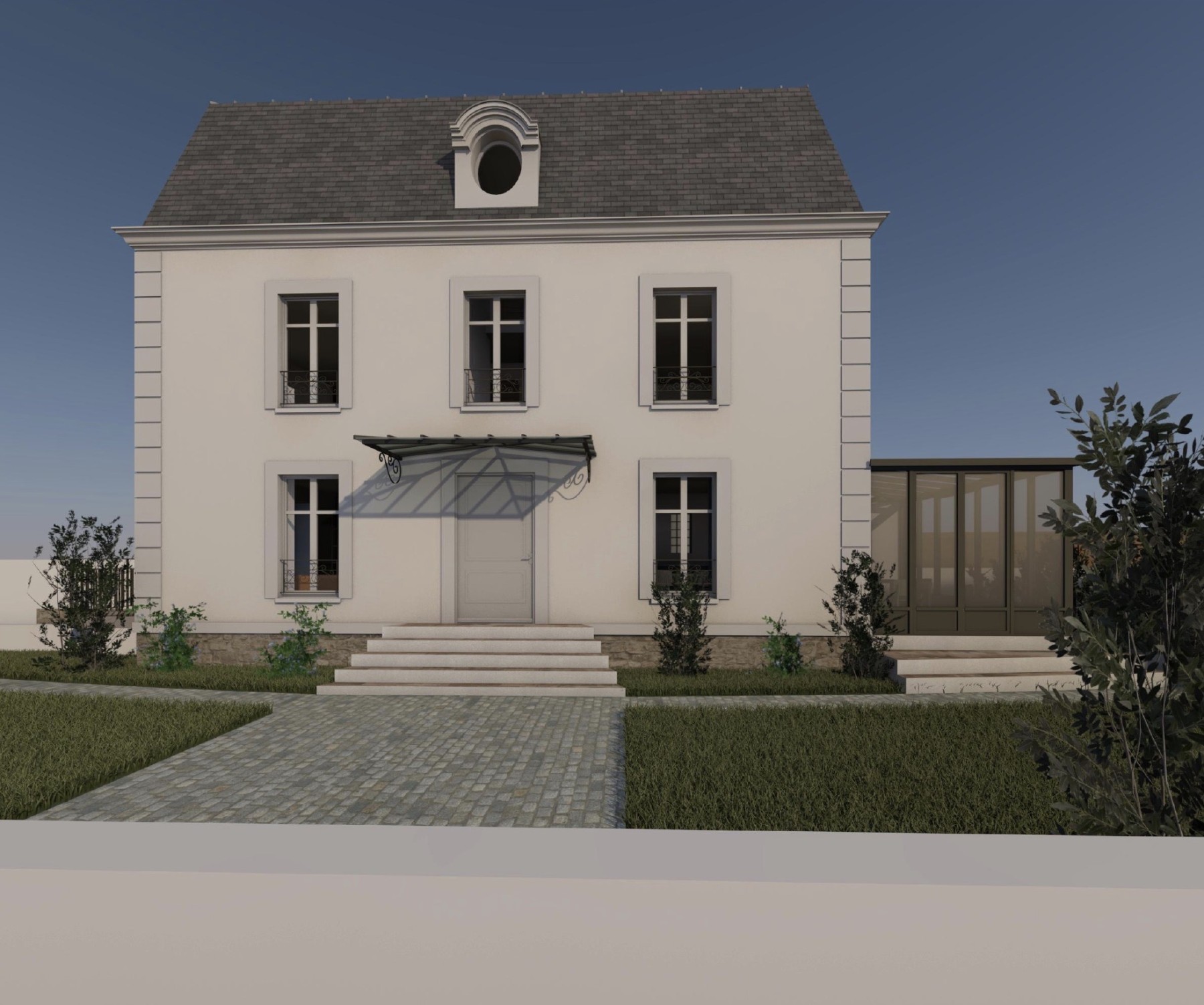 La maison existante date du début du XXe siècle, implantée dans un tissu résidentiel pavillonnaire dense, la parcelle se situe à l’angle de deux rues. La mission concerne la réalisation d’une véranda de 16 m² ainsi que la rénovation du rez-de-jardin et des cellules de salle de bain des étages. Le rez-de-jardin s’étend désormais jusqu’à la véranda où se situe la salle à manger et la cuisine qui est repensée en lien avec cette dernière et le salon se développe sur toute la partie Est de maison.